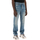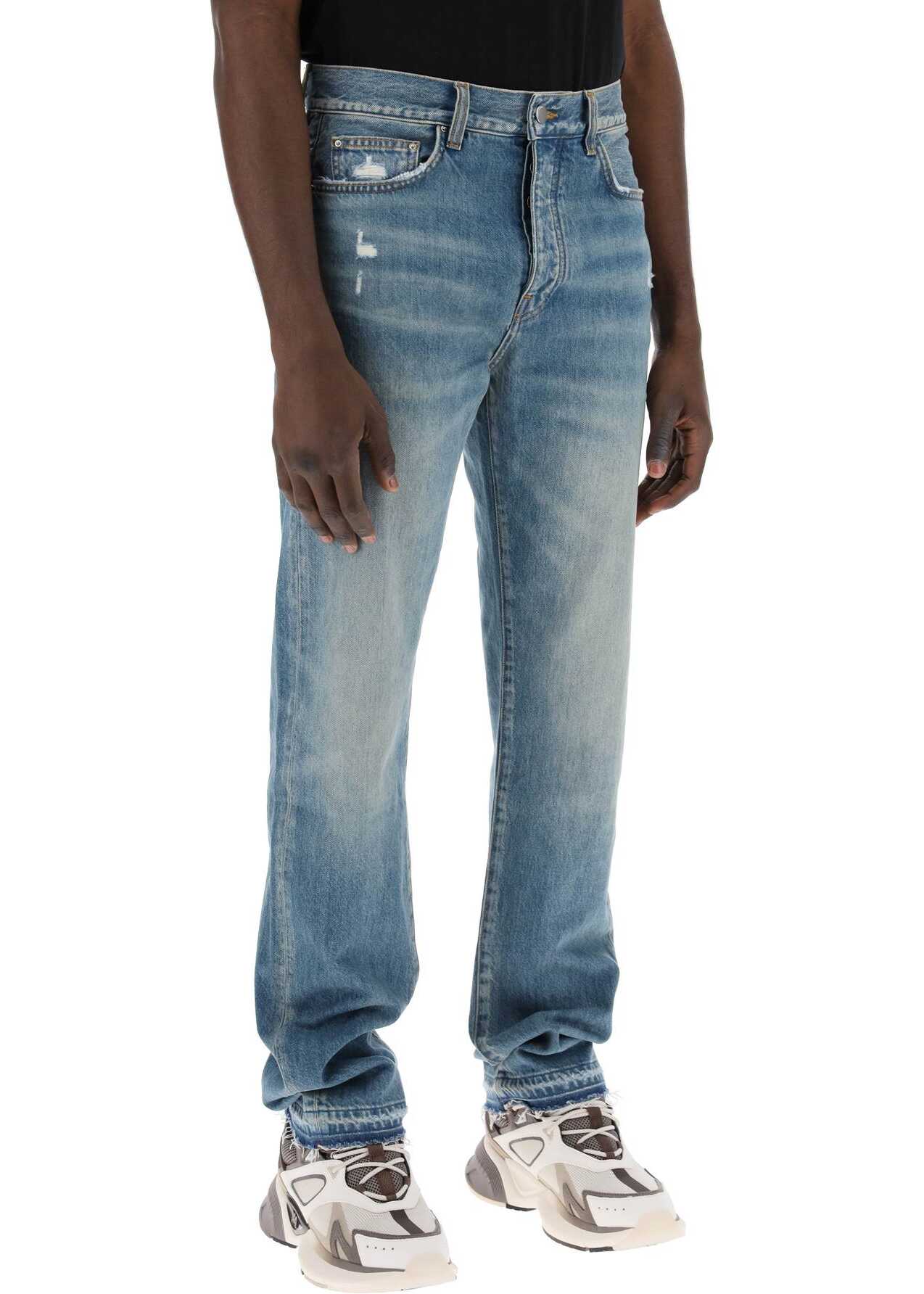 These Amiri five-pocket jeans are made of medium-washed cotton denim with distressed details. The design features a slightly flared leg and relaxed bottom, with branded button closure, raw-cut ankles, leather back patch, and engraved metal plaque on one of the two back pockets. The model is 187 cm tall and wears size 31.