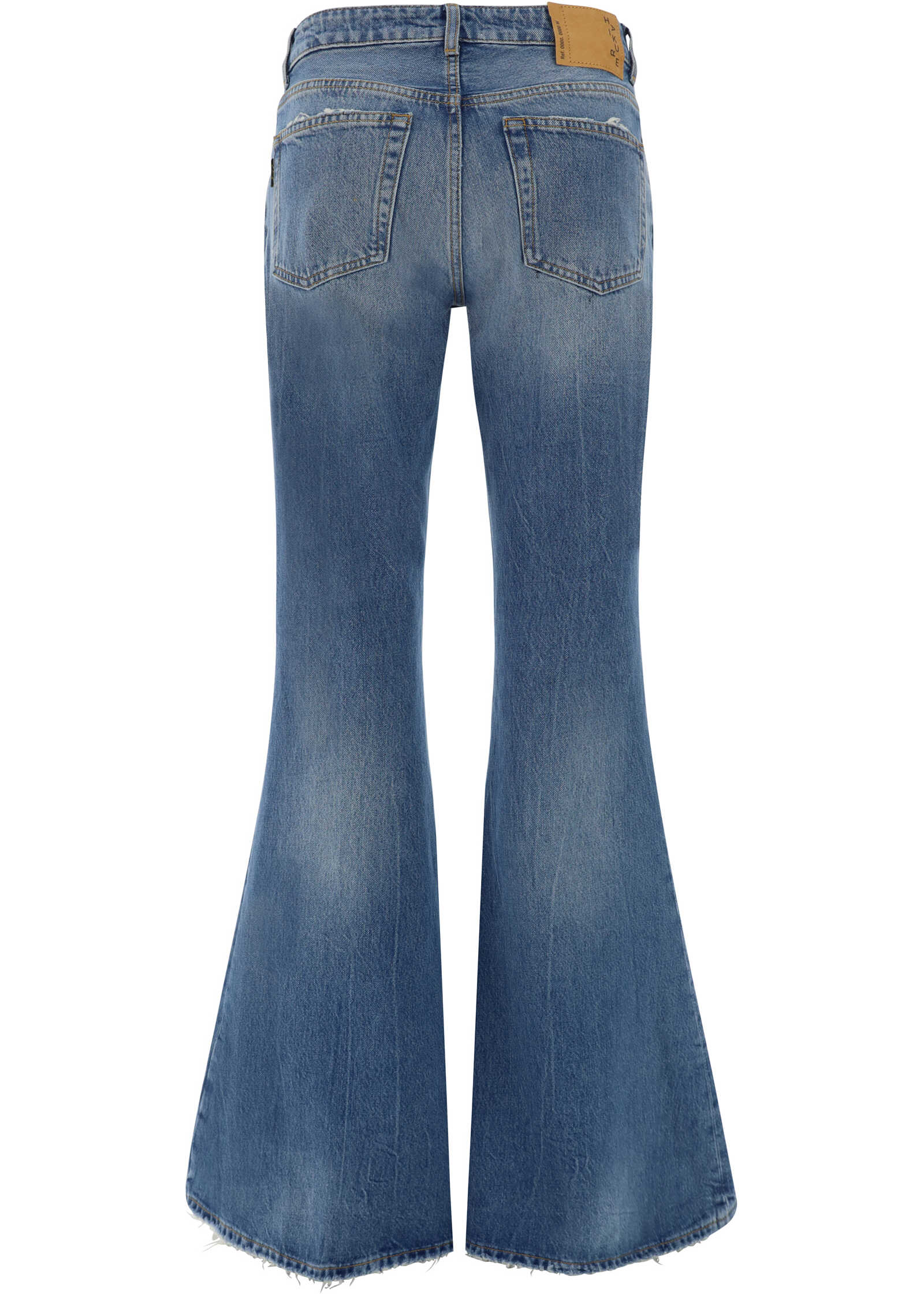 Cotton Farrah Salina Jeans by Haikure, five-pocket ramp style, front button and zipper closure, waistband loops, iconic branded signature leather pressure-printed patch applied at back.