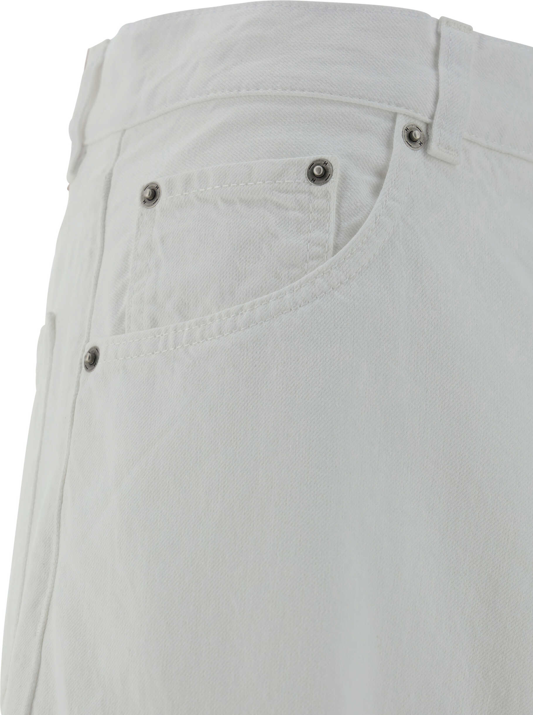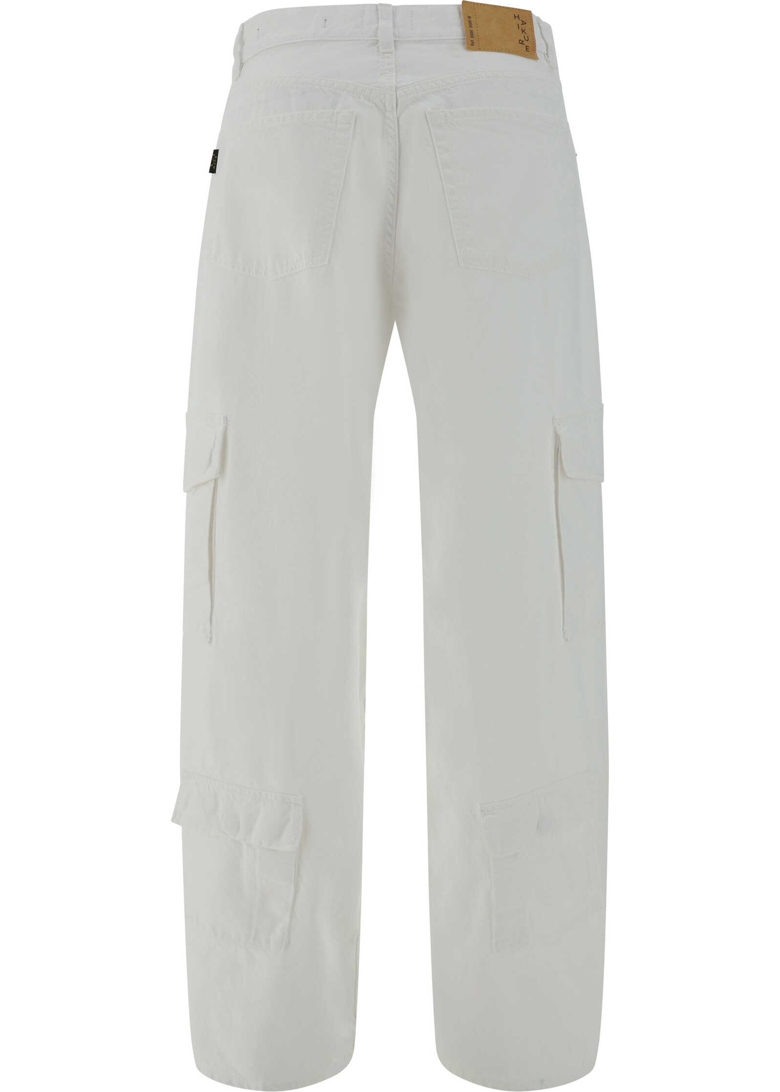 Cotton Denim Pants by Haikure, wide-leg five-pocket design, front button and zipper closure, waistband loops, four cargo pockets applied to side panels, iconic branded signature leather pressure-printed patch applied to back.