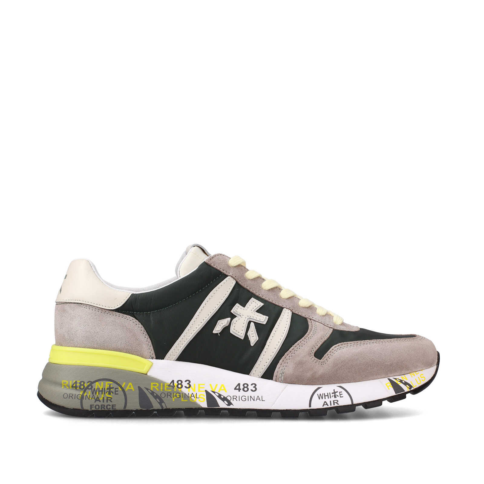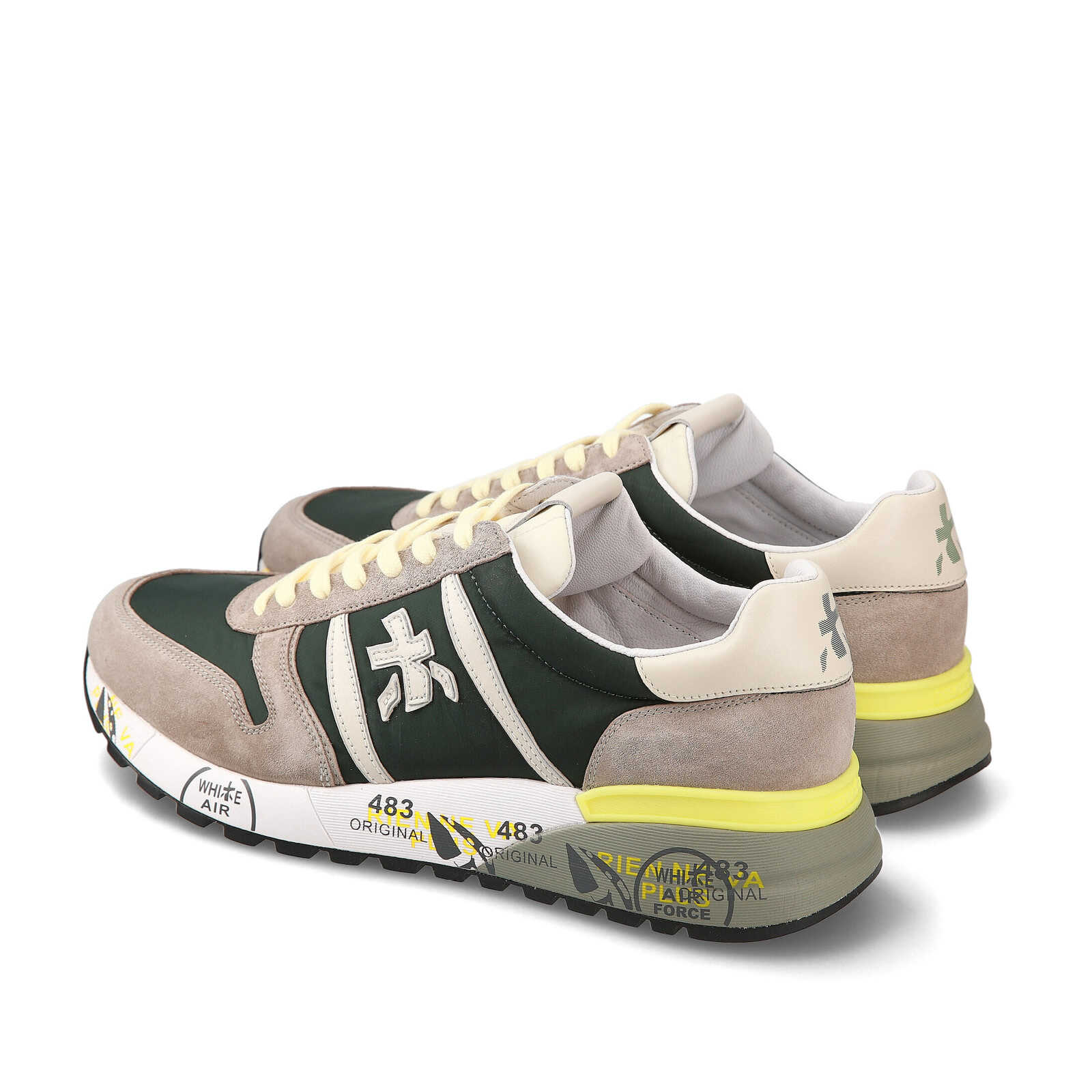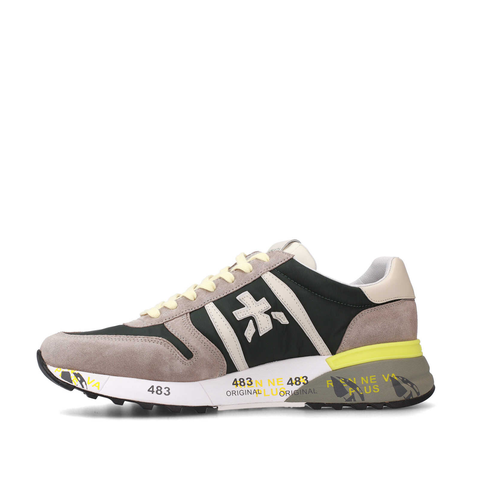 Sneakers Premiata uomo modello Lander.Realizzata in suede sabbia e tessuto tecnico verdone.Logo laterale in pelle bianca.Suola in gomma logata bianca verde e giallo fluo.di cm 3,5.Plantare estraibile di mm 2,9 per una calzata comoda e morbida.