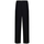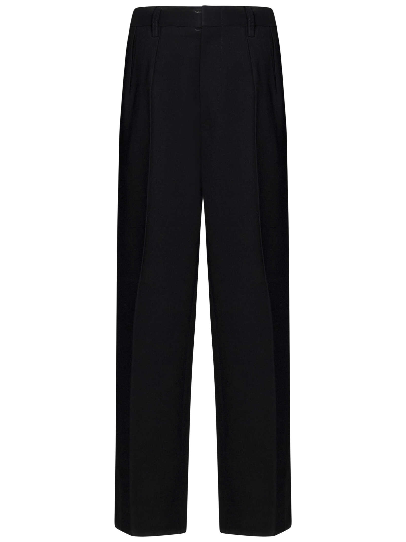 Straight-leg black wool gabardine trousers with shiny details and back strap.