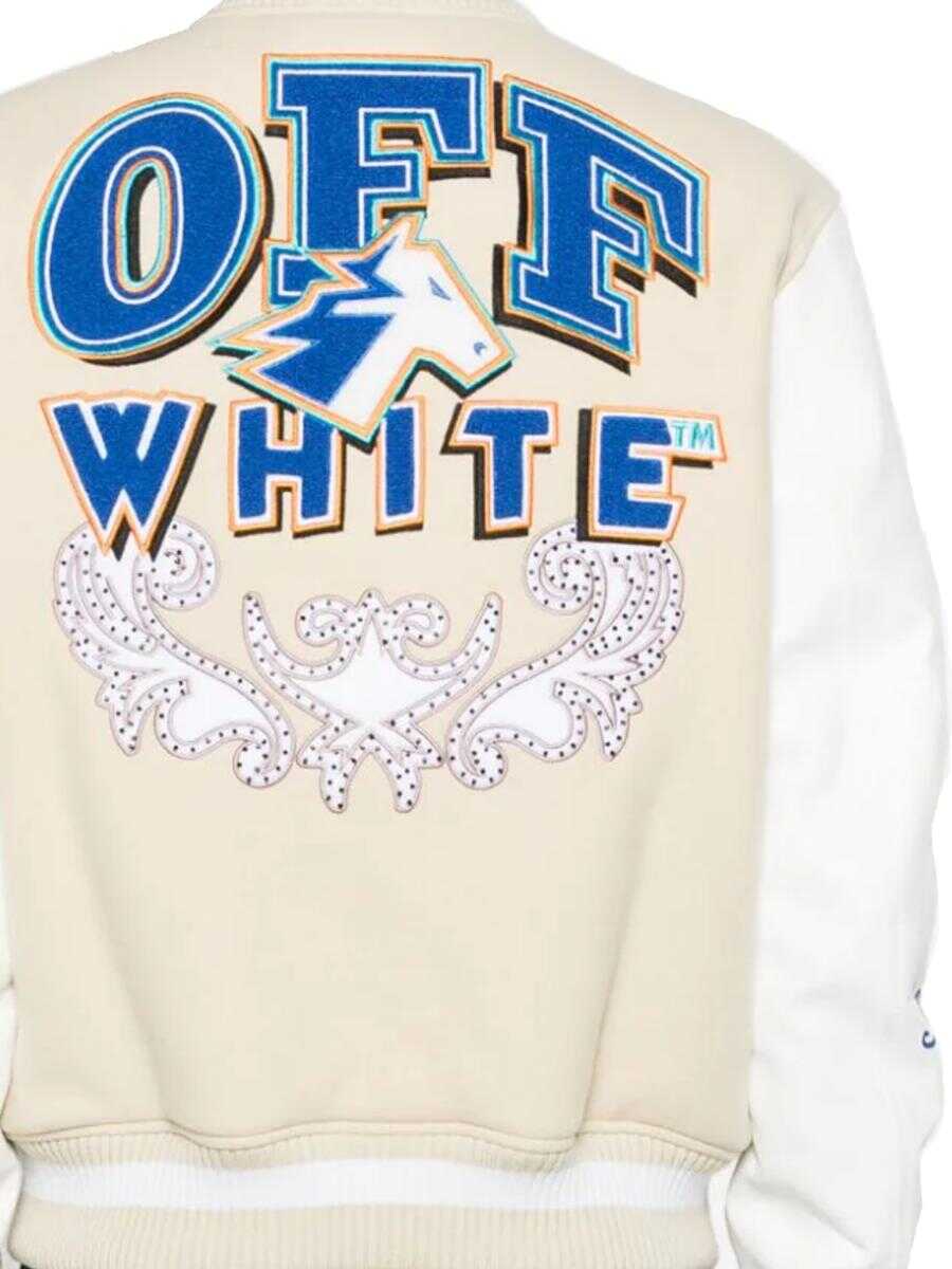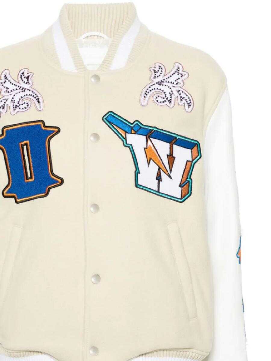 beige/white virgin wool/leather brushed effect panelled design all-over logo patches embroided detailing bead embellishment stripe trim baseball collar front press-stud fastening long sleeves two side welt pockets ribbed cuffs and hem logo-jacquard lining