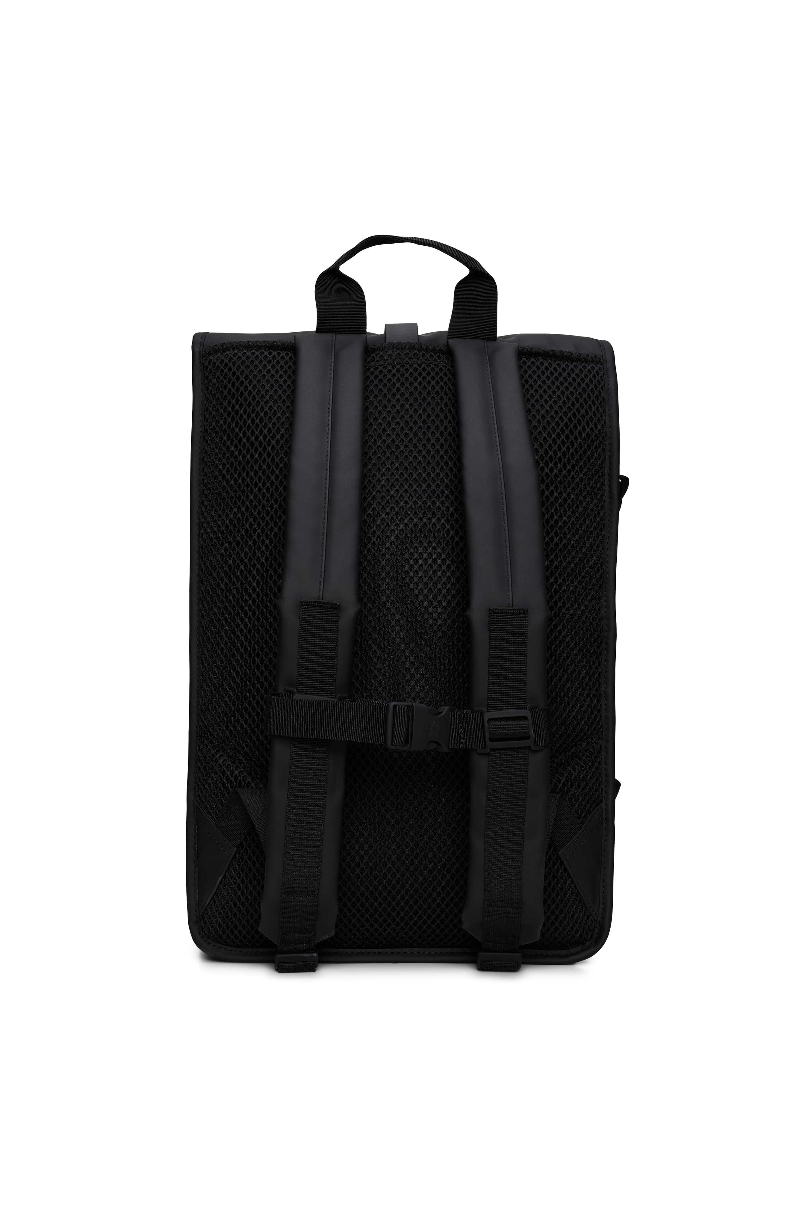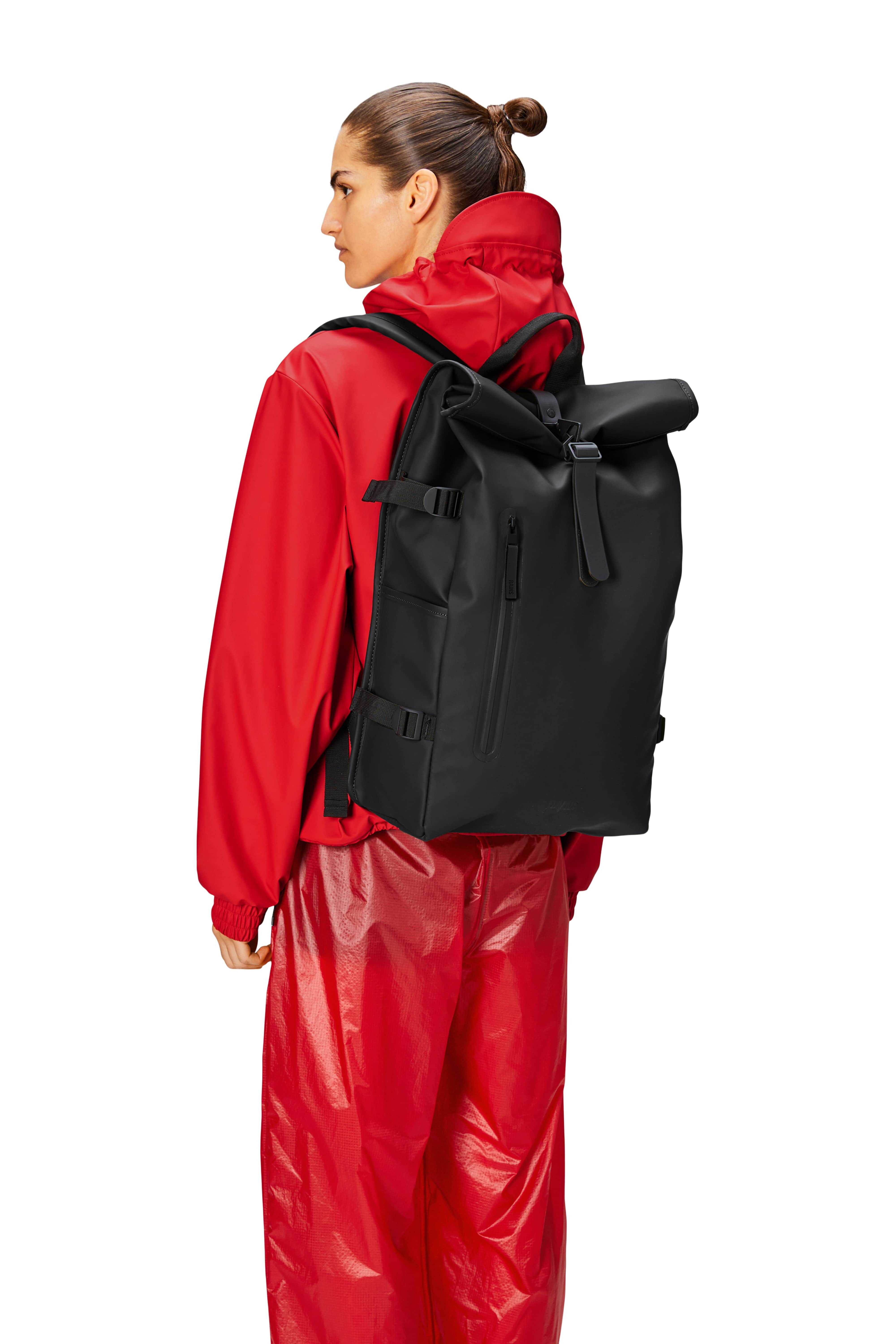 `Rains backpack with rolltop opening and snap compression, iconic brand carabiner, main compartment, front pocket with coated zipper, internal pocket for devices up to 16", side patch pockets, padded back in air-mesh, adjustable compression shoulder straps, padded mesh back. Measurements Height 52 cm x Length 32 cm x Depth 14 cm, capacity 23 liters.`