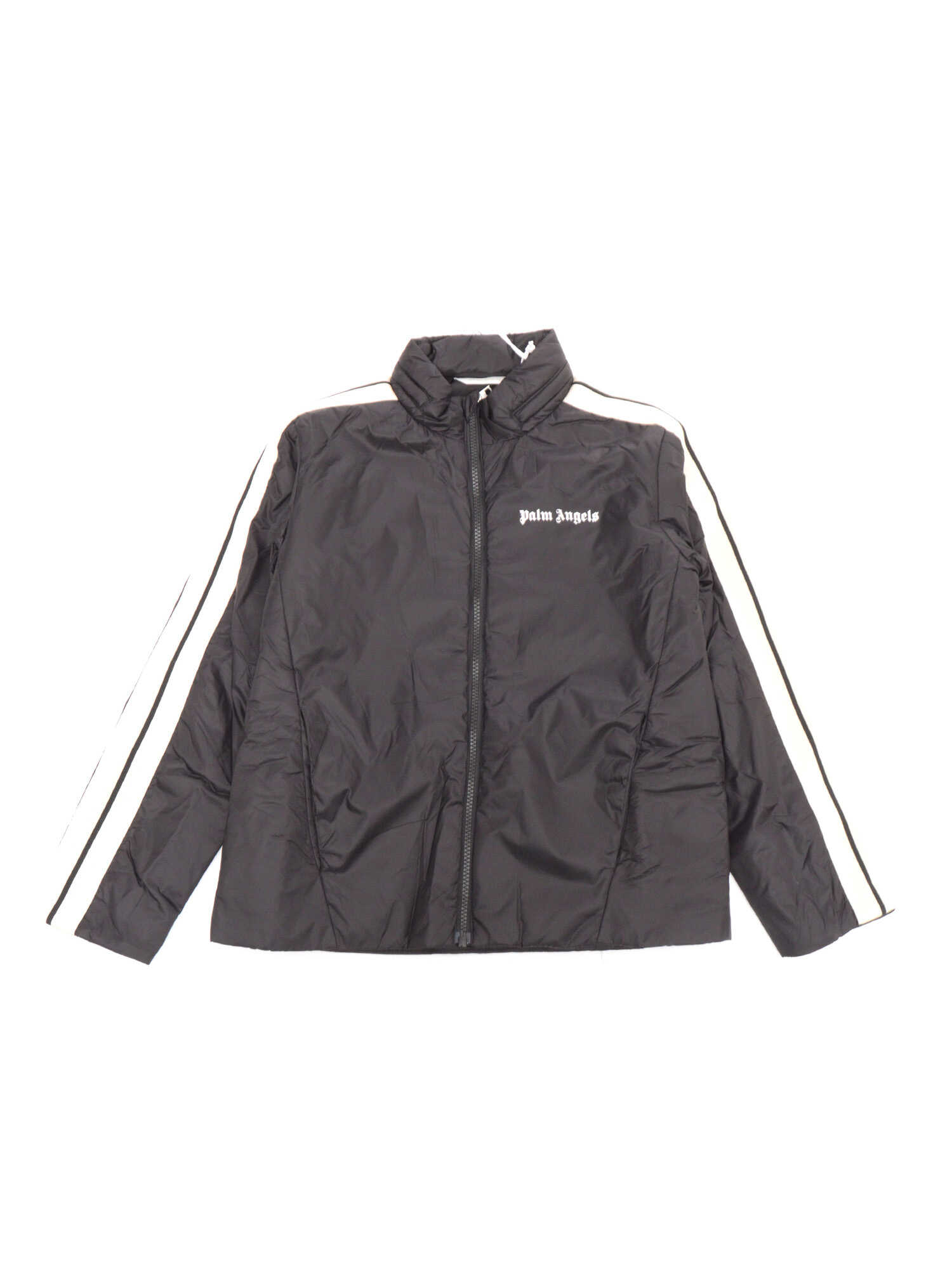 Palm Angels black down jacket for children with high collar, front zip closure, web stripes and contrasting logo.