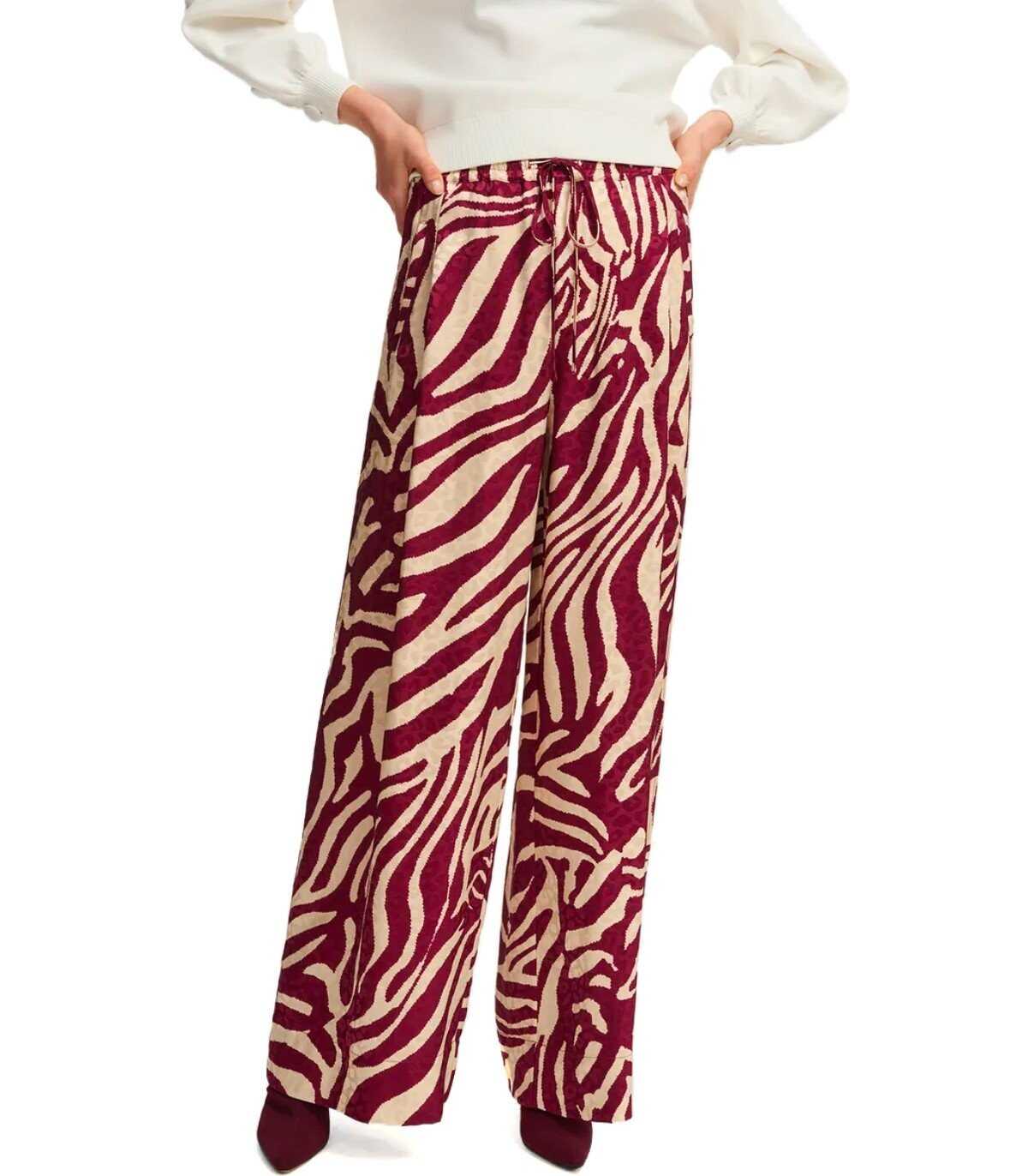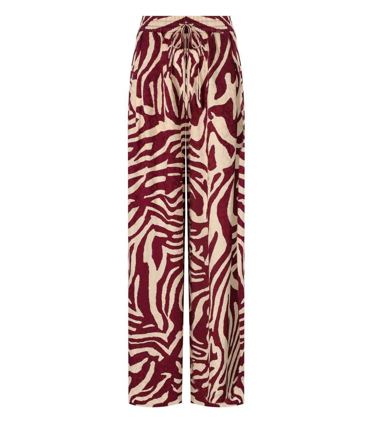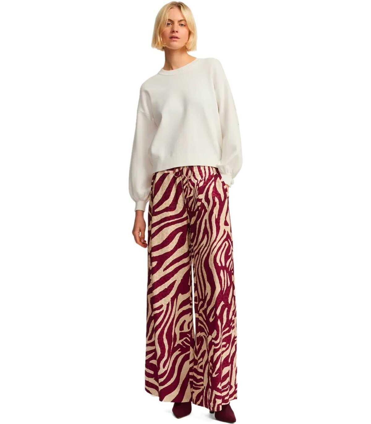 Fibonacci pants by Essentiel Antwerp made of leopard jacquard fabric, with ecru and bordeaux zebra pattern. Patch pockets on the hips, elasticated waist with drawstring. Wide leg, soft fit.