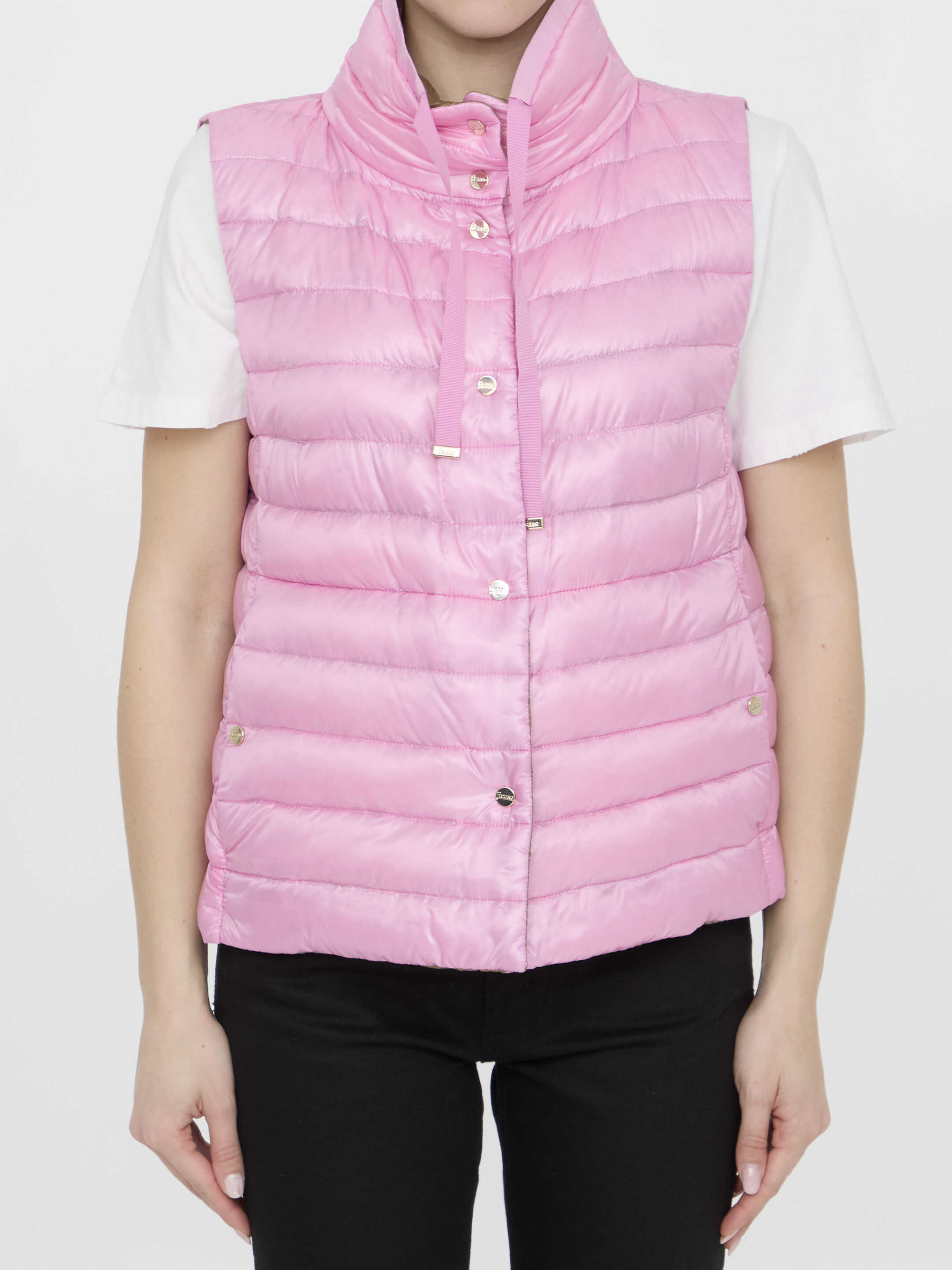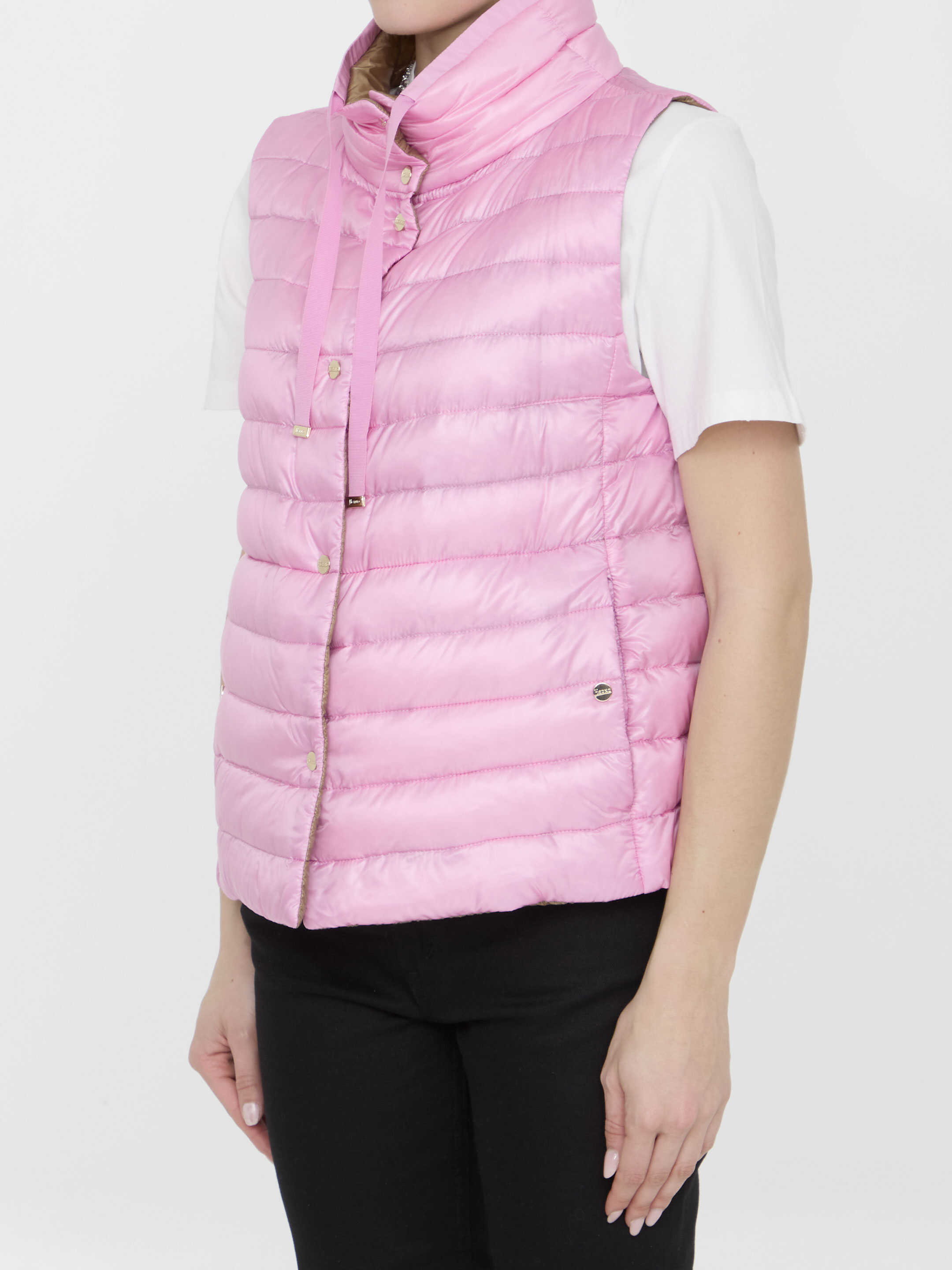 Reversible vest in pink and camel quilted nylon. It features funnel neck with drawstring, front press-stud closure and two side press-stud welt pockts. Regular fit.
