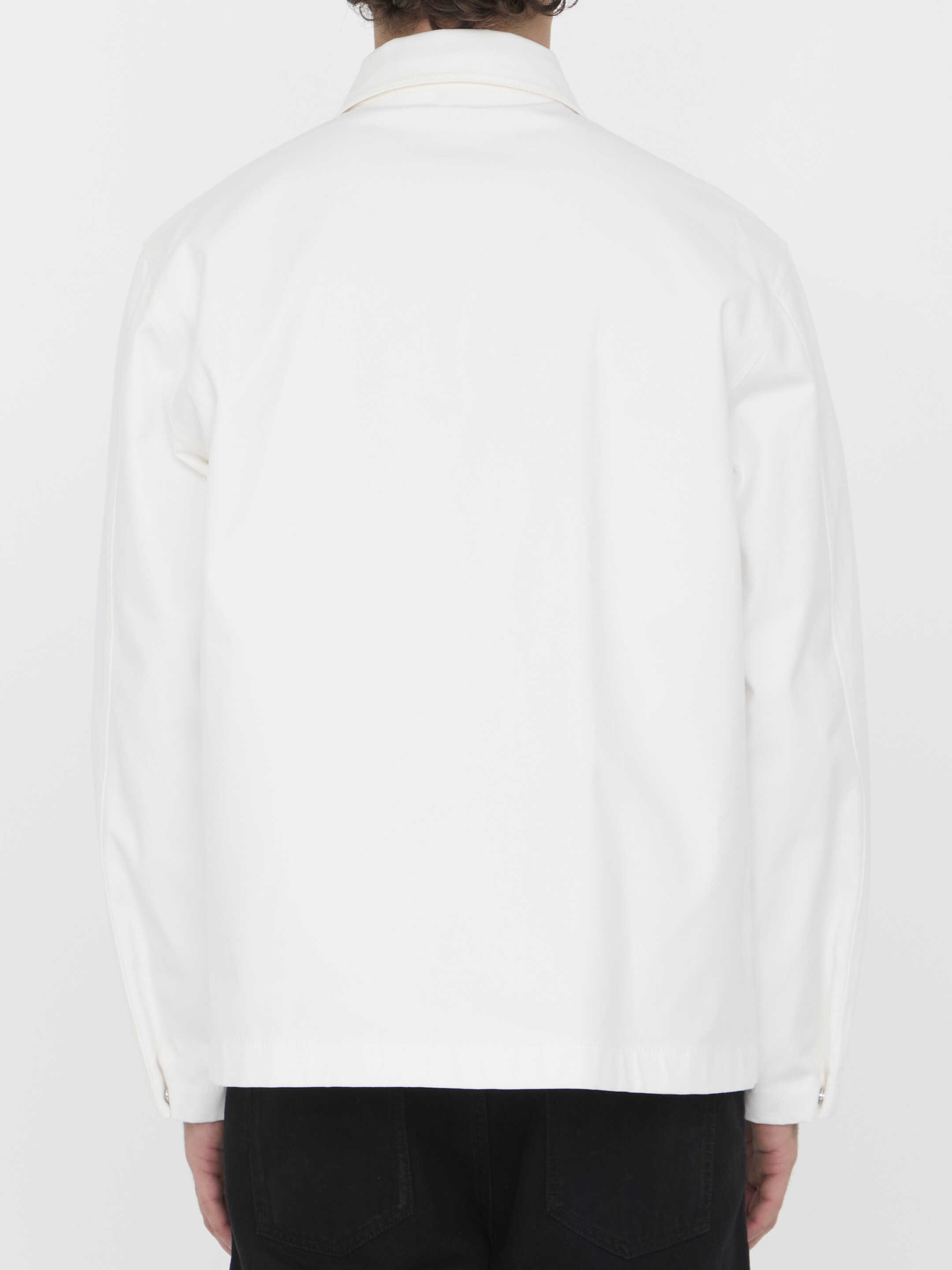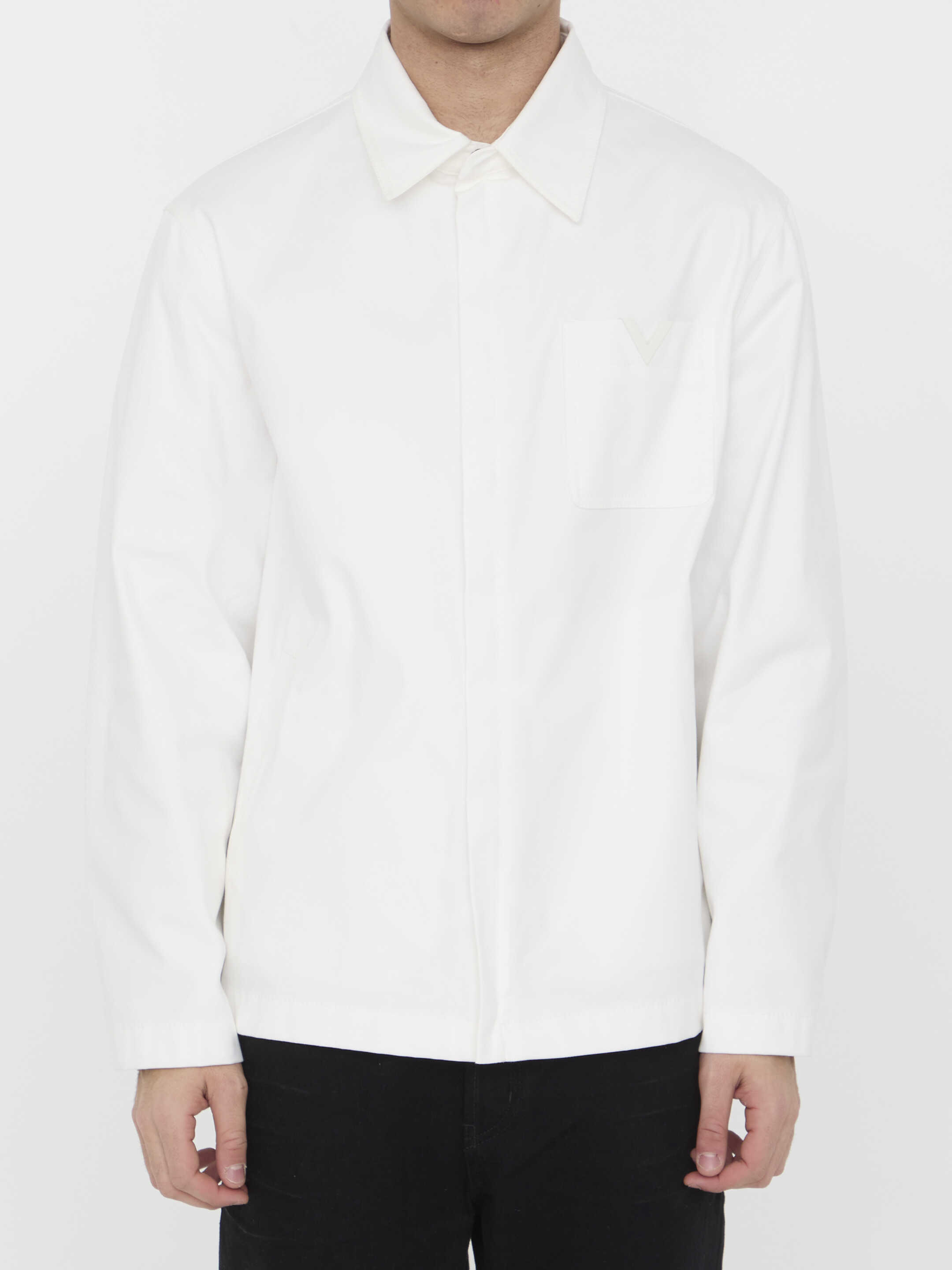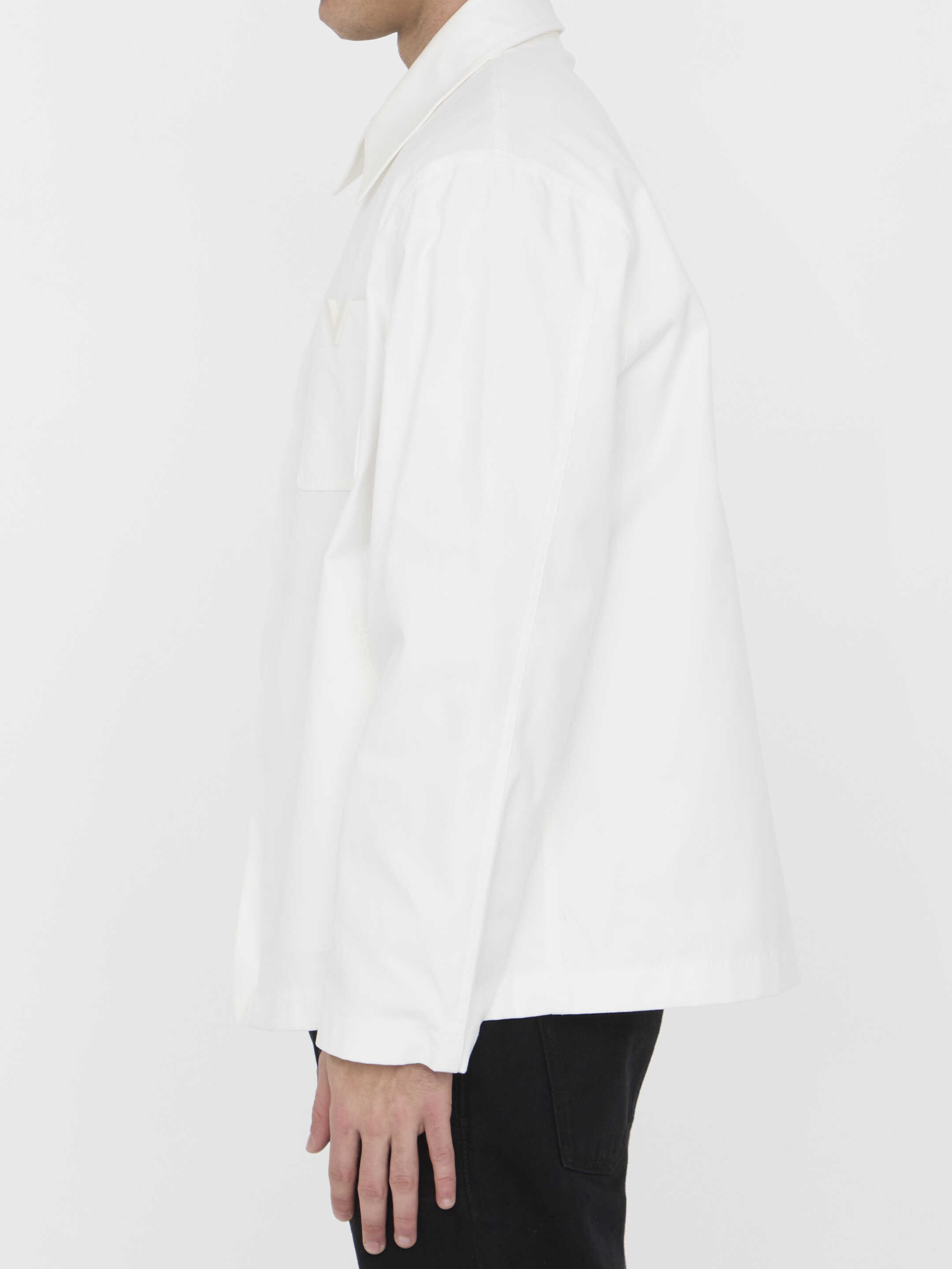 Valentino jacket in white stretch cotton canvas. It features snap-button on collar, front zip closure, two side welt pockets, one patch pocket on chest with rubberized V Detail and snap-button cuffs. Regular fit.