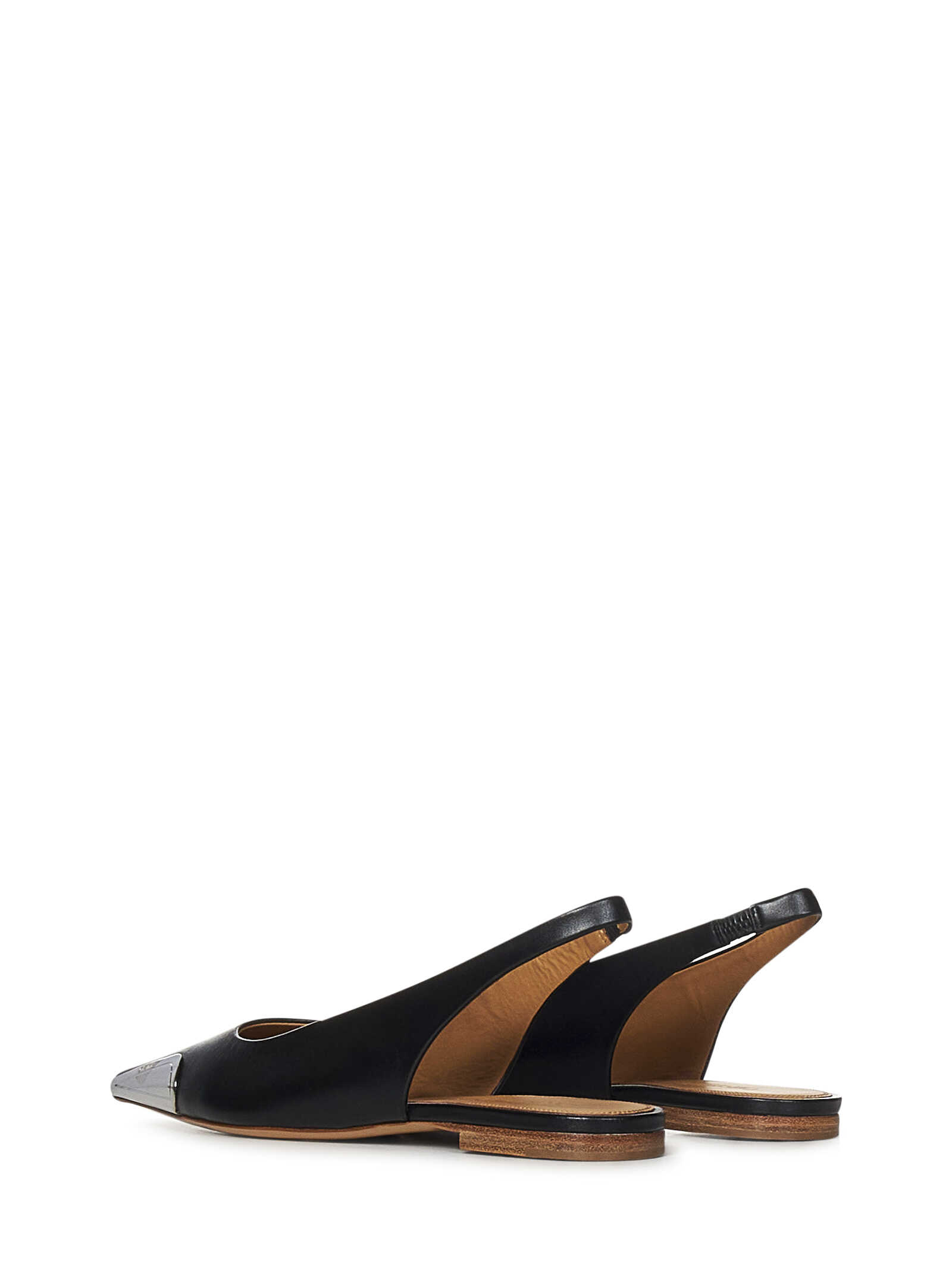 Flat Frame Slingback black calf leather ballet flats with metal insert at toe.