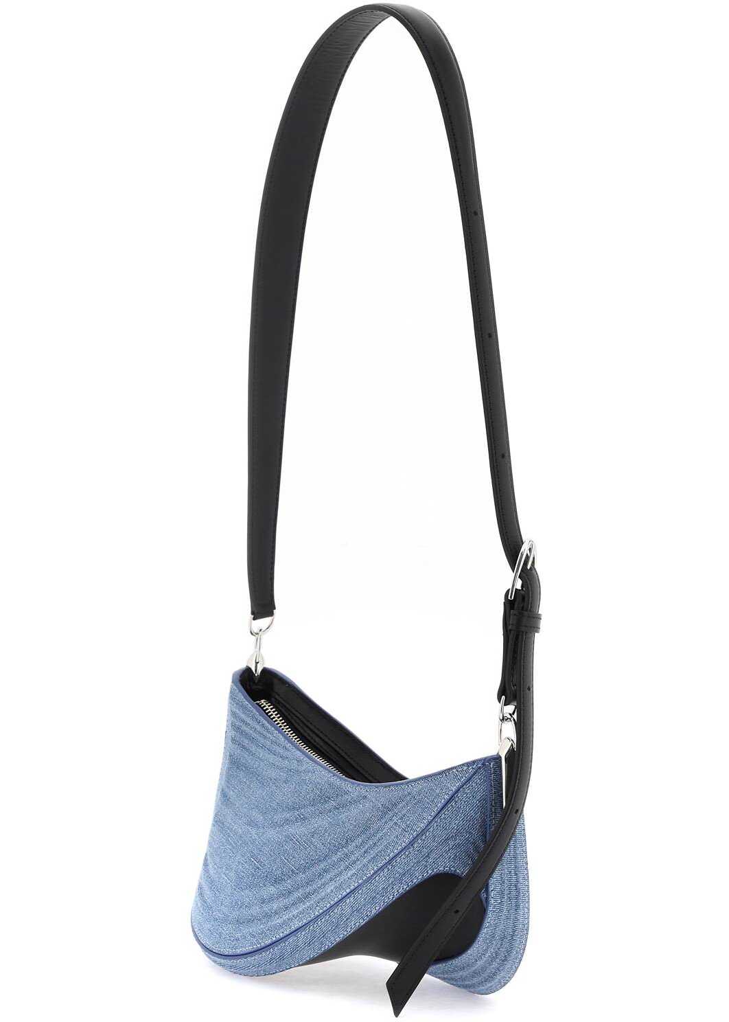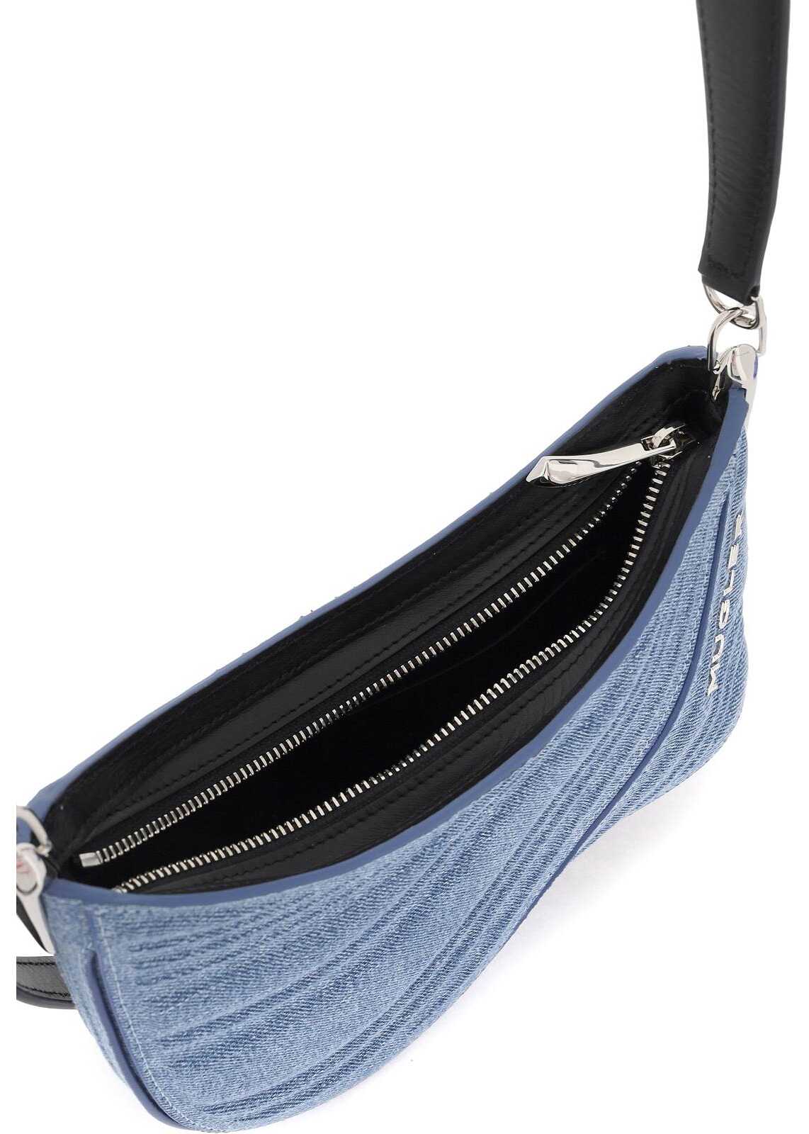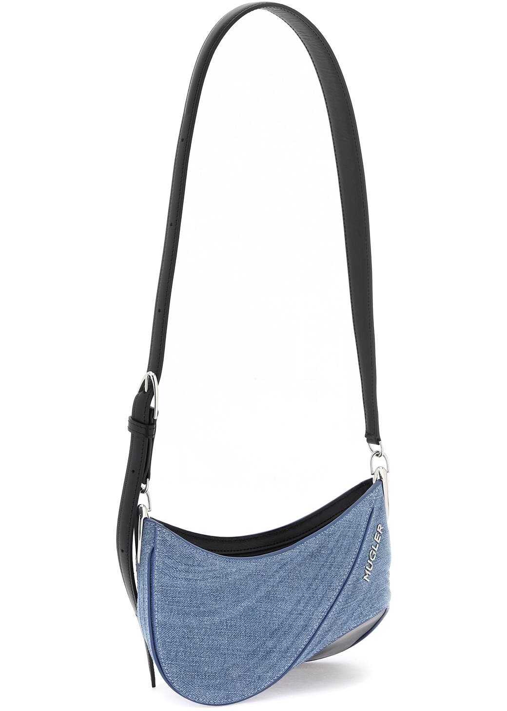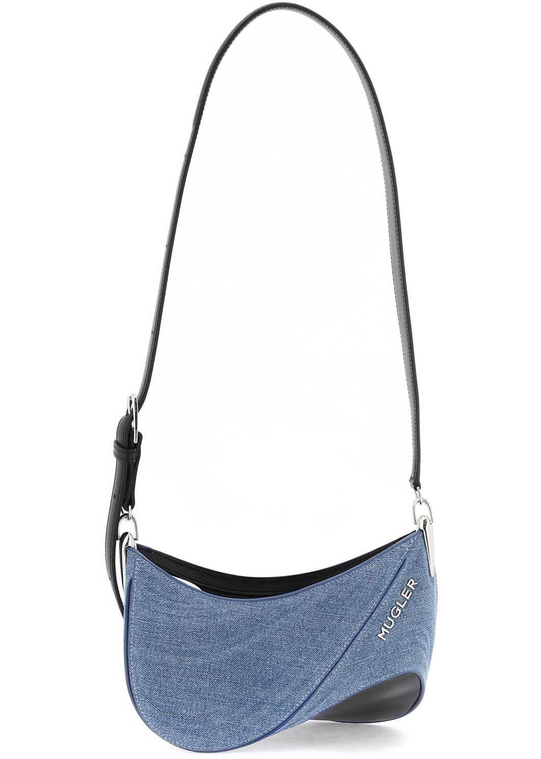 The small Denim Spiral Curve 01 shoulder bag by Mugler is made of pure cotton denim, with smooth leather details and bottom. It features a spiral shape with rounded edges, imitating the cut-outs typical of the brand's clothing. Zip closure, microfiber suede interior with a leather card slot, metal lettering logo on the front, and adjustable handle. Metallic accessories in silver finish.