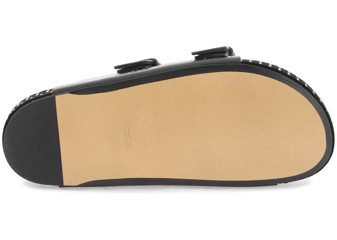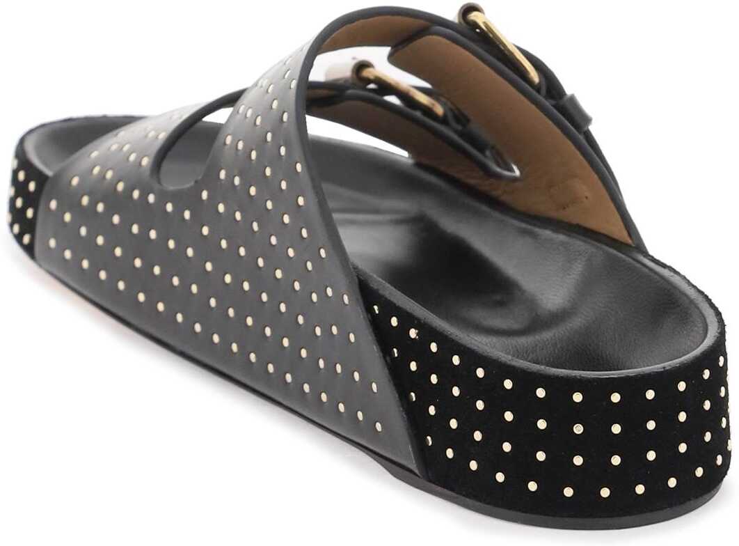 The Lennyo slides by Isabel Marant are made of suede leather, enriched with smooth leather straps featuring golden metal buckles and studs all over the surface. The insole is engraved with the brand's logo and the sole is made of leather.