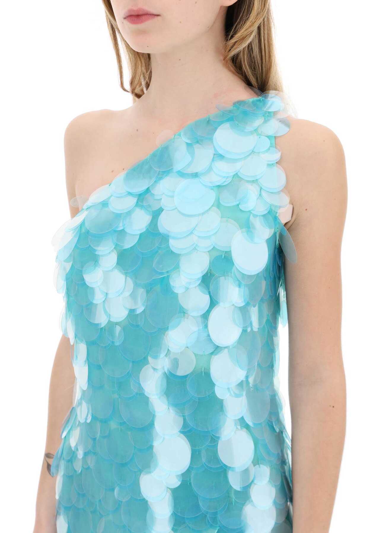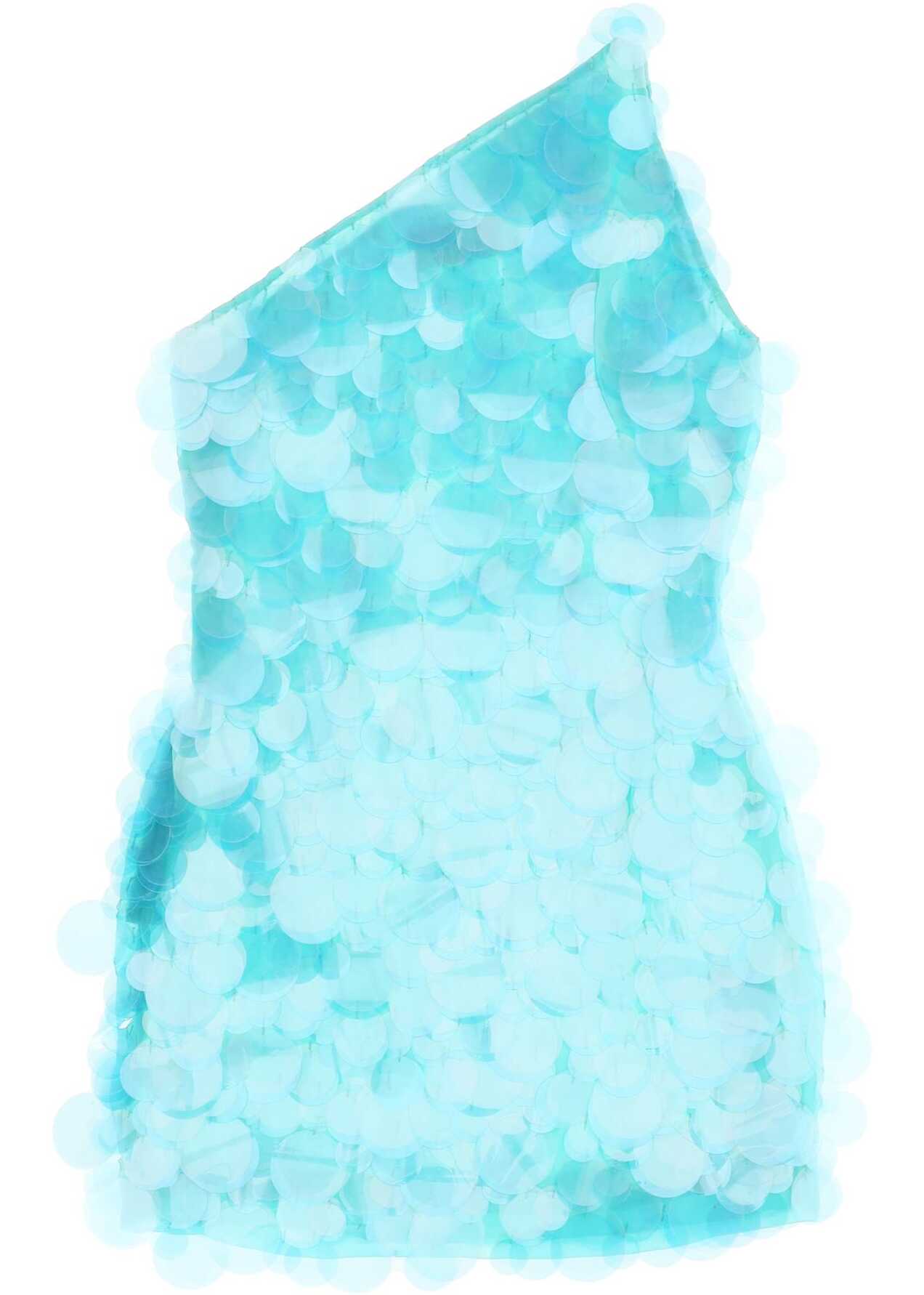 This Giuseppe di Morabito mini dress is made of double-layered organza covered in large sequins all over the surface, featuring a one-shoulder design and a fitted silhouette. It has an invisible side closure with zip and hook. The model is 177 cm tall and wears an IT size 40.