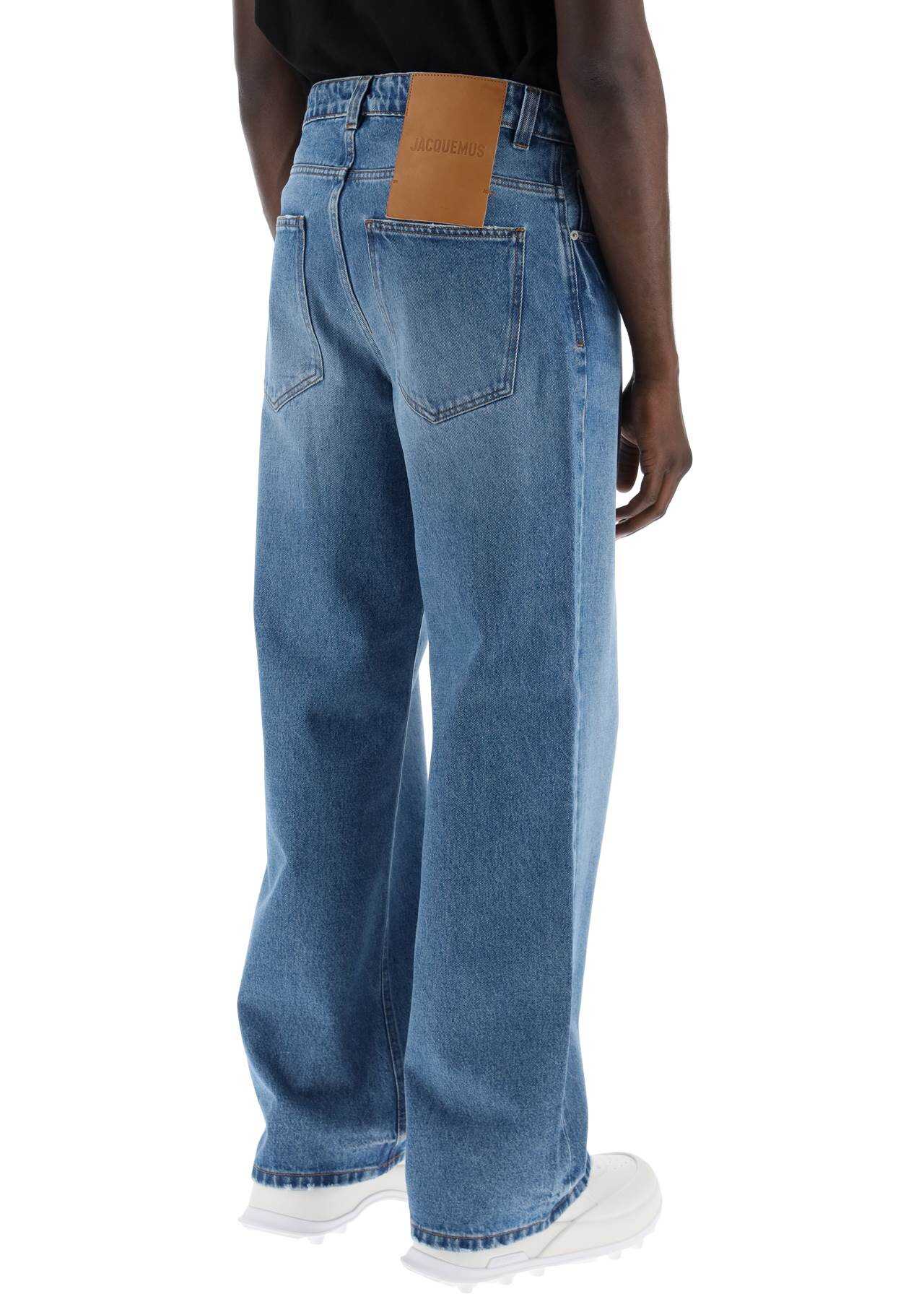 These jeans from the Les Sculptures collection by Jacquemus are made of sustainable cotton denim, with a medium vintage wash and a five-pocket design featuring a wide and relaxed cut. They have a front closure with hidden buttons, belt loops, and a branded tab on the back waistband. The model is 187 cm tall and wears a size 31.