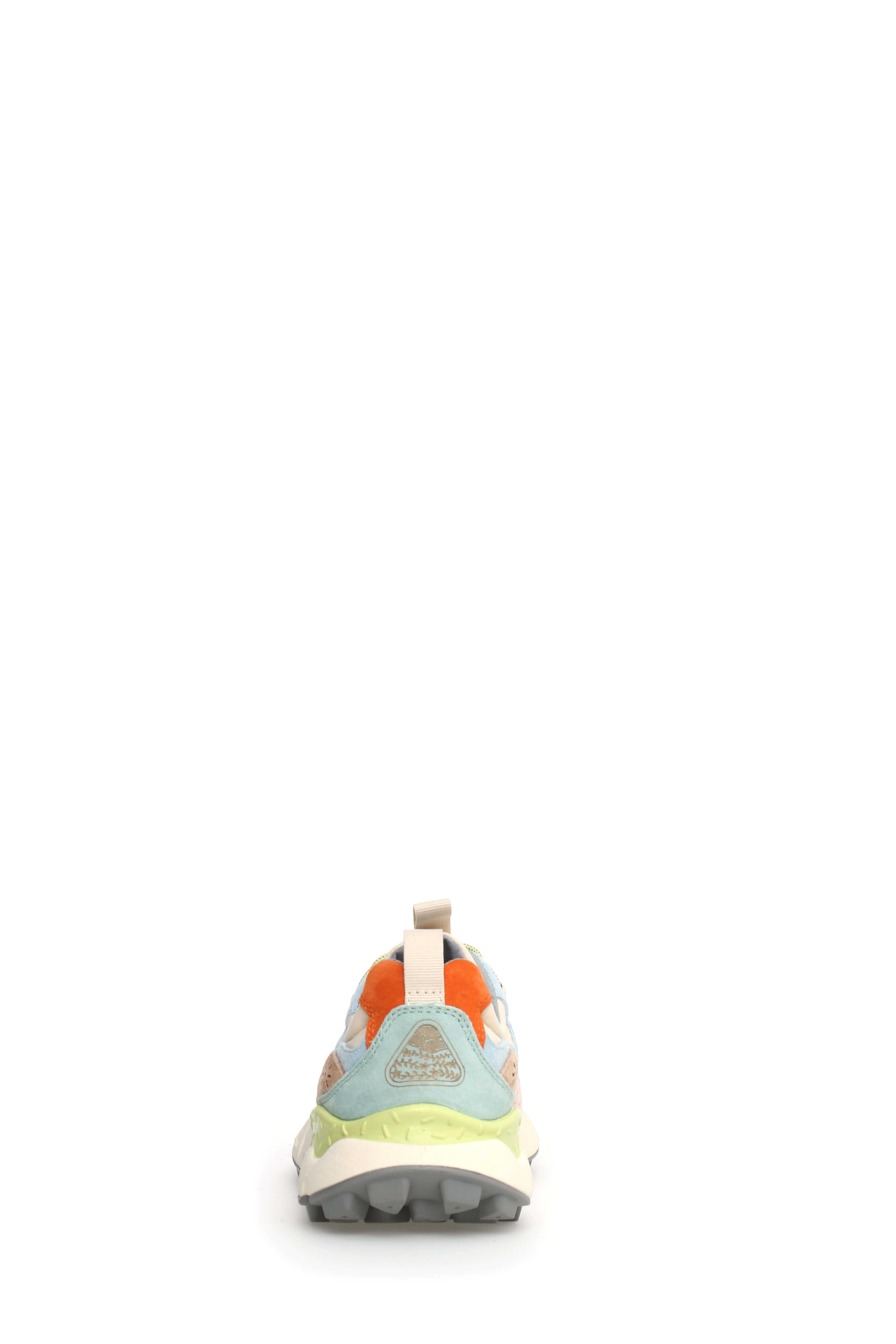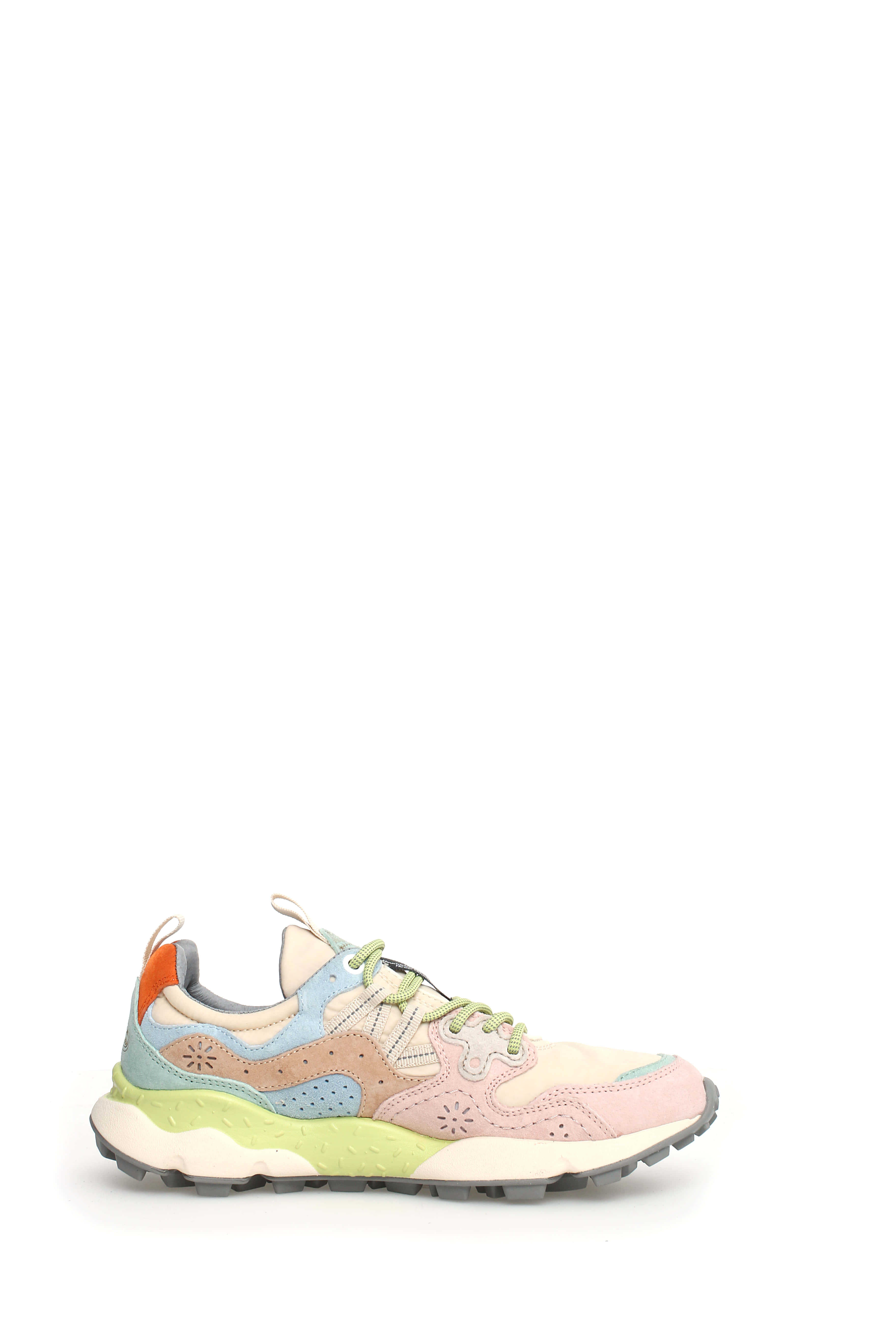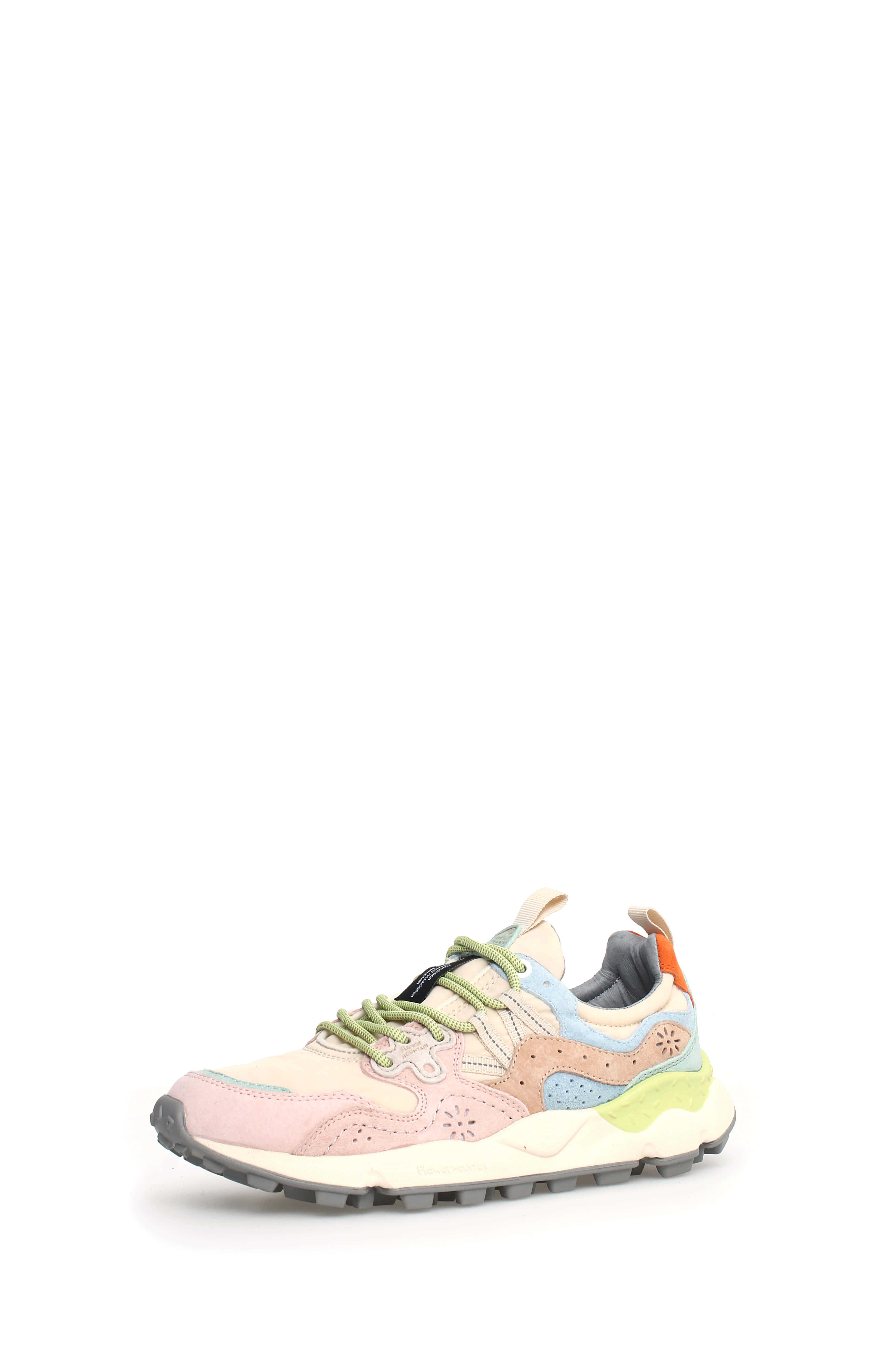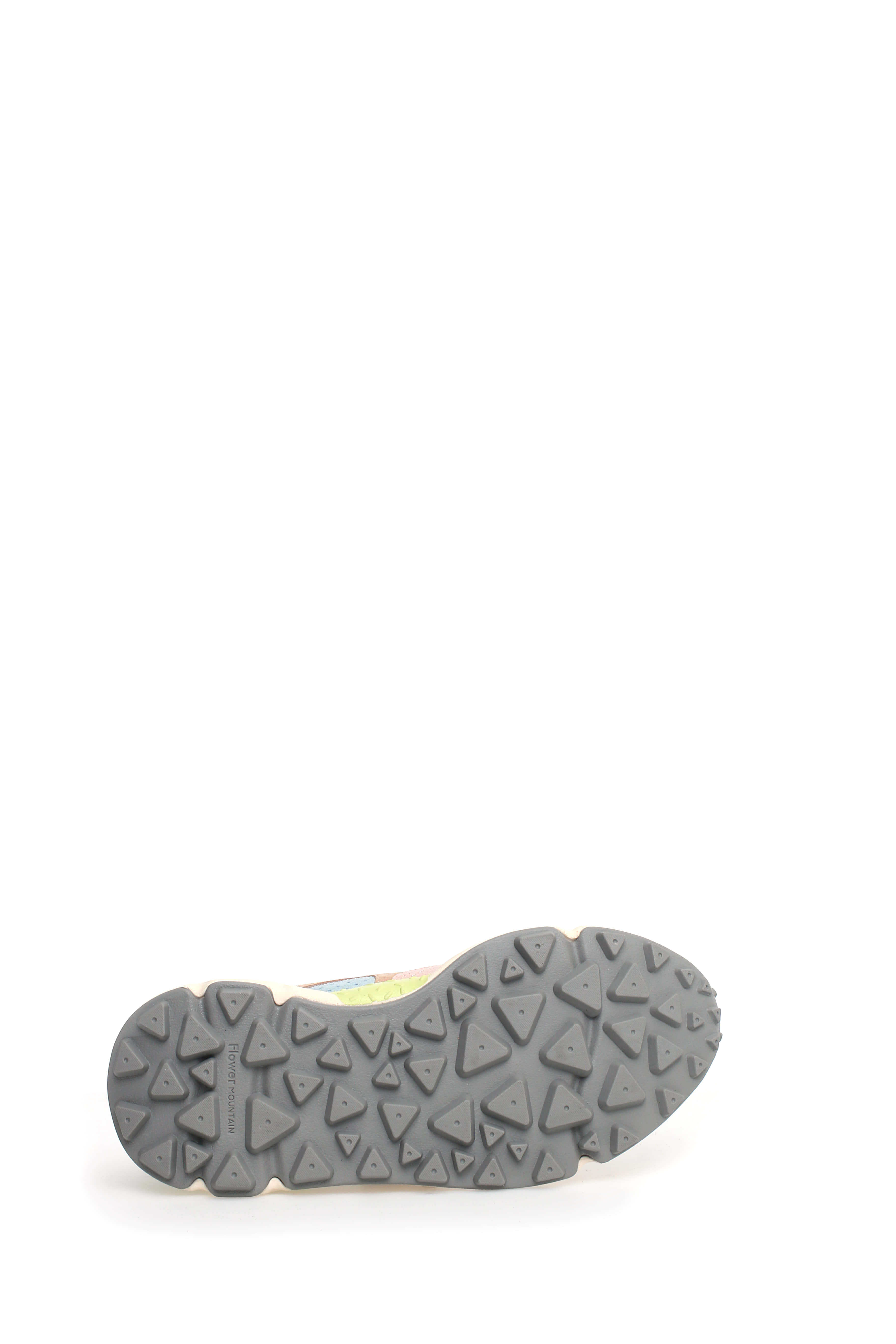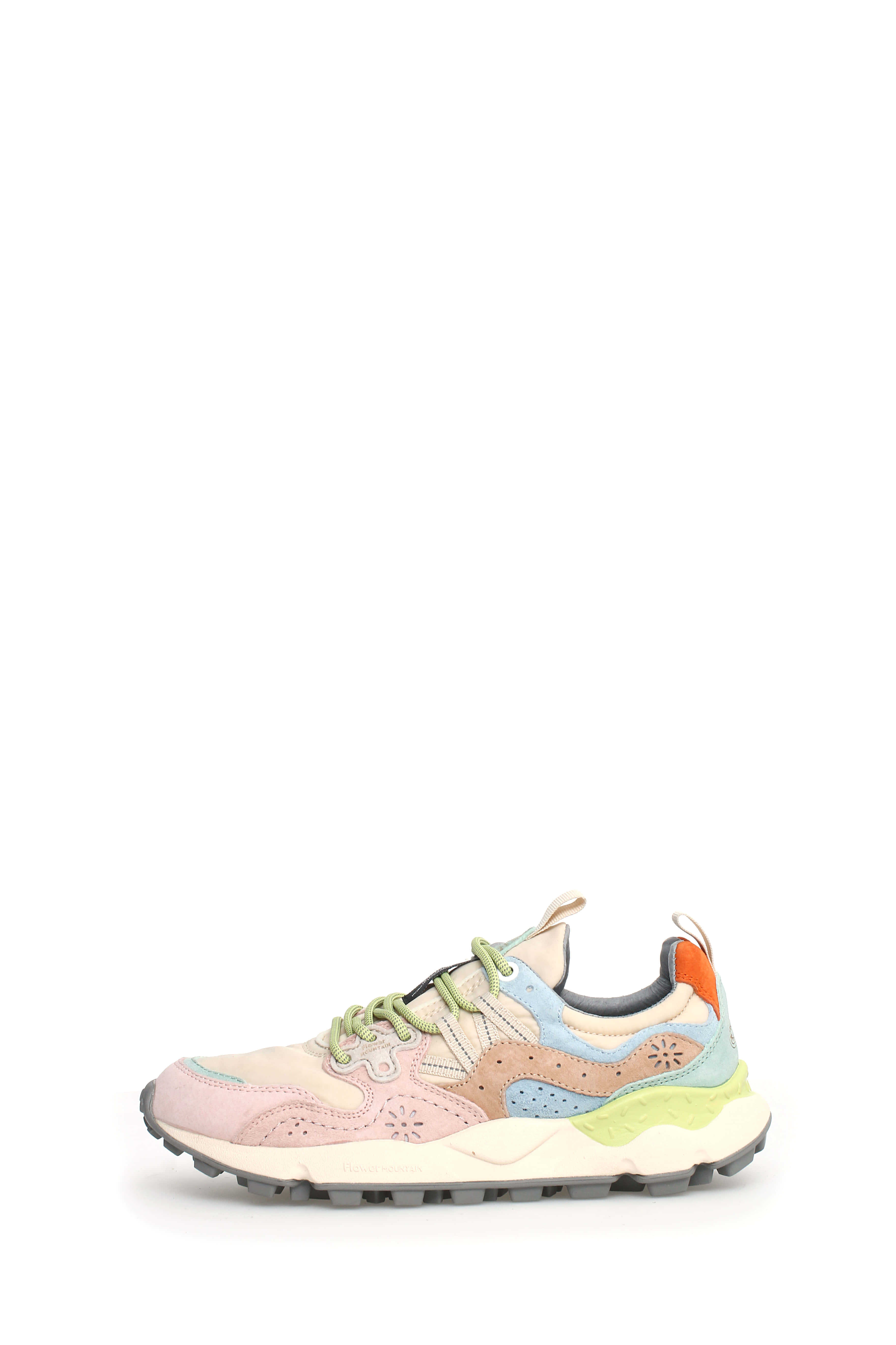 Flower Mountain sporty sneaker with ripstop fabric upper, technical nylon on the toe and multicolor suede inserts. The design is completed by flower-shaped perforations, reinforcements in the eyelets and trekking laces. EVA sole with shaped edge and serrated tread.