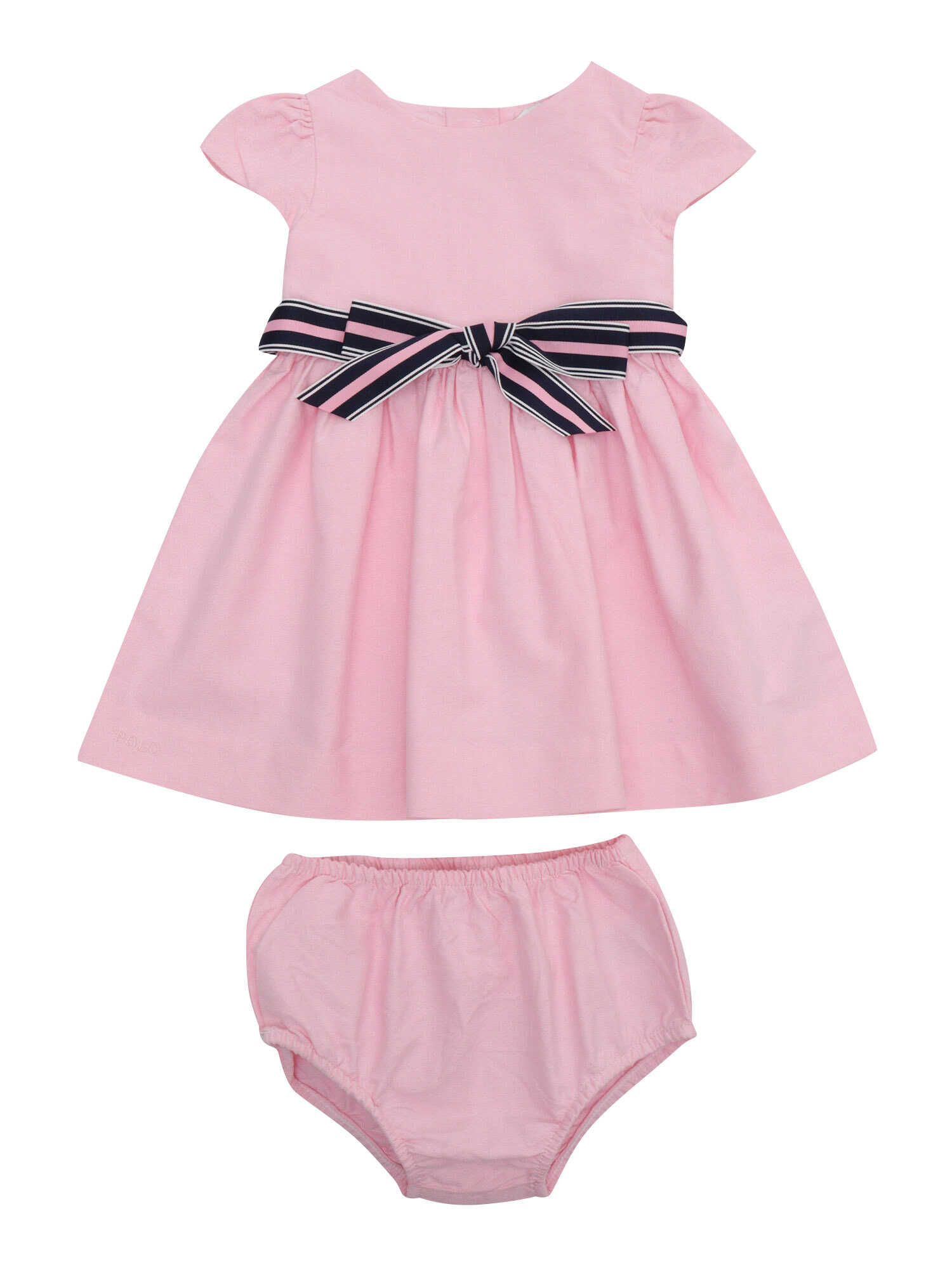Pink Polo Ralph Lauren girl's dress in cotton with short sleeves, flared skirt, band with bow at the waist, matching diaper cover.