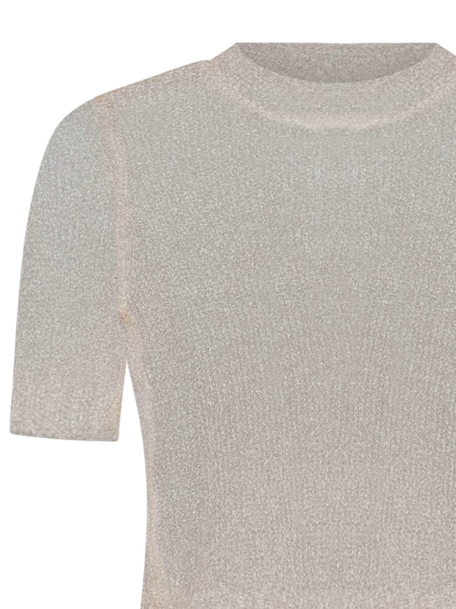 Light pink metallic sheer knit short-sleeved top with ribbed trims.