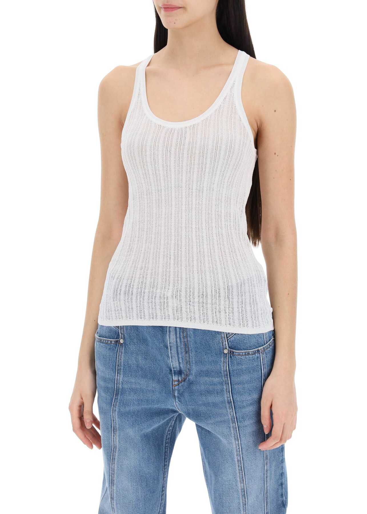 This Isabel Marant sleeveless top is made of a lightweight ribbed viscose blend with perforated details. It features a wide round neckline and a racerback design. The fit is slim and the model is 177 cm tall, wearing a size FR 34.