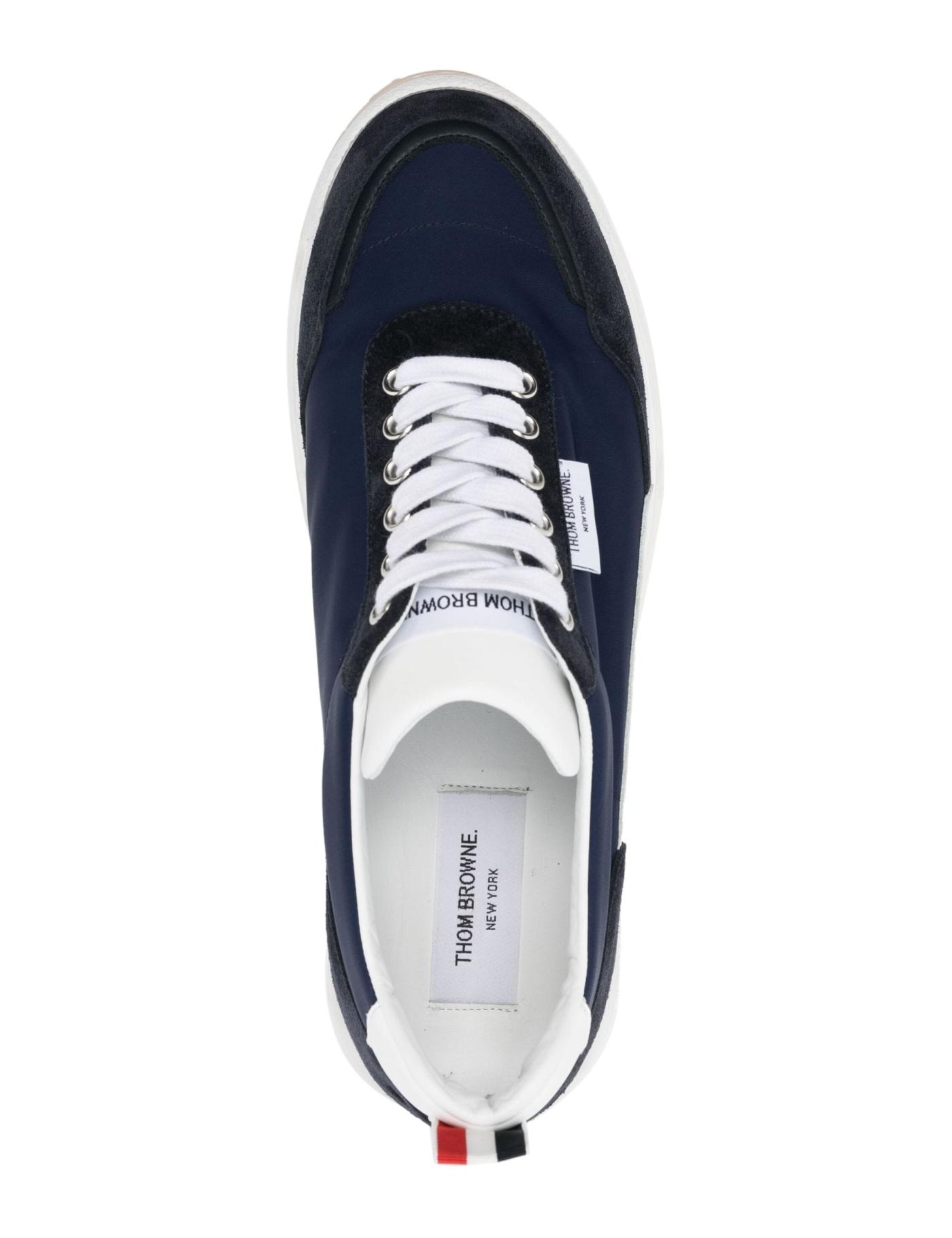 Boasting a panelled design in a navy blue and white colourway, these sneakers from THOM BROWNE are finished with a RWB stripe pull-tab for a signature look. They are set on a chunky rubber sole for maximum grip.