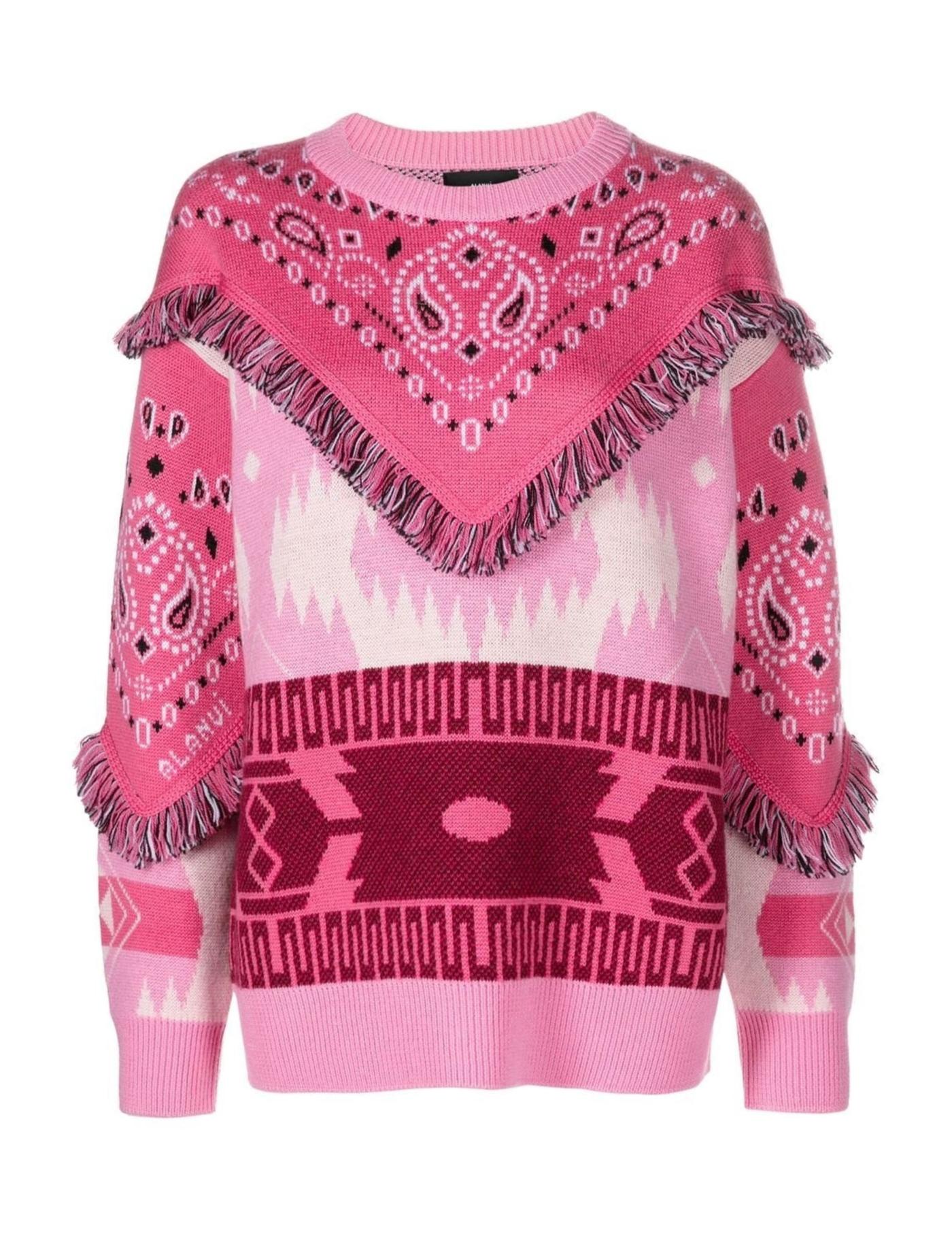 Alanui infuses handcrafted knitwear with bold patterns and signature fringing - as shown by this pink-hued Icon Bandana jumper, spun in Italy from soft virgin wool.