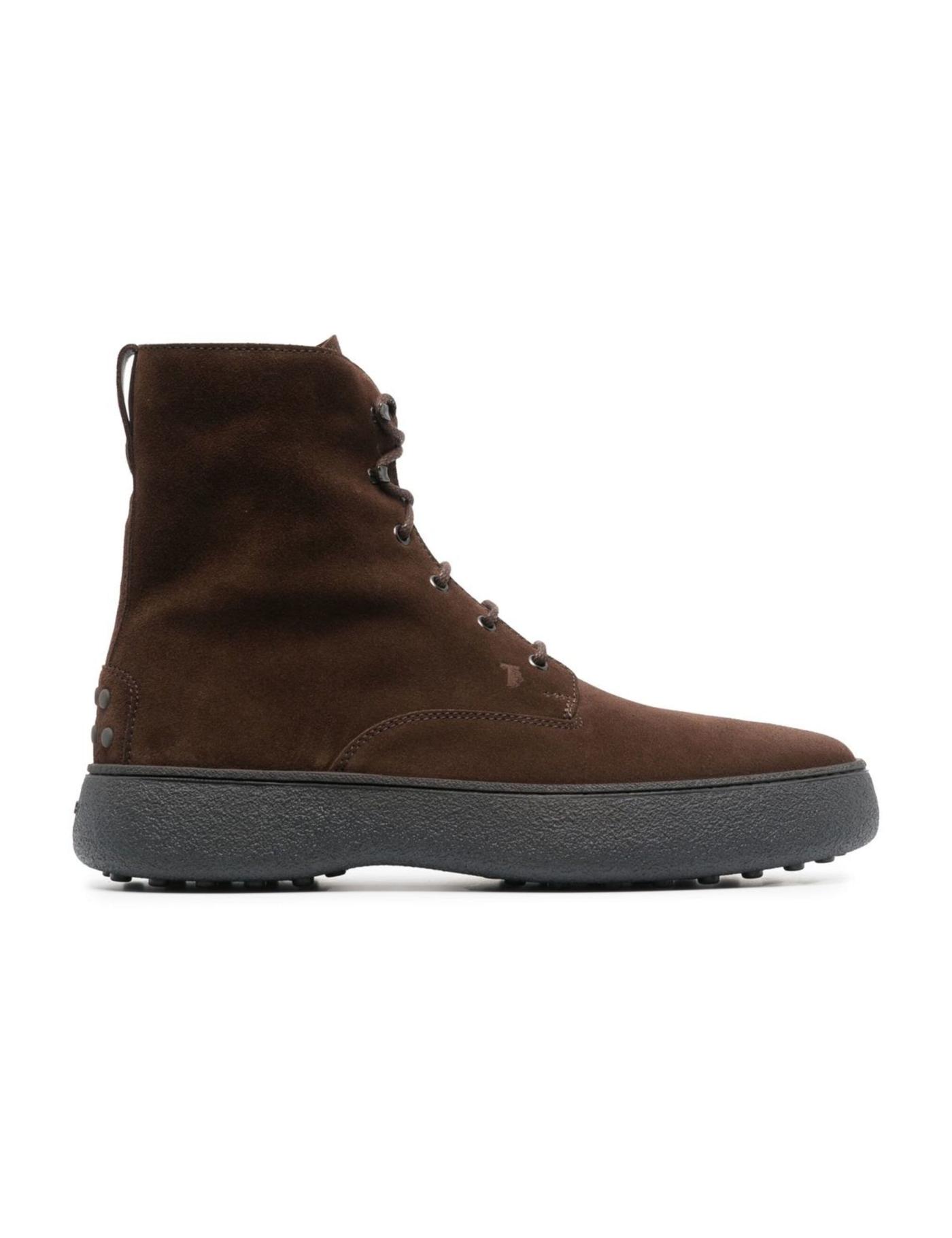 Standing atop a sturdy yet sleek rubber sole, Tod's signature W.G. boots have a classic lace-up silhouette. The pair appears in tonal brown suede calf leather, adorned with detailing such as the iconic 'gomminos' on the back.