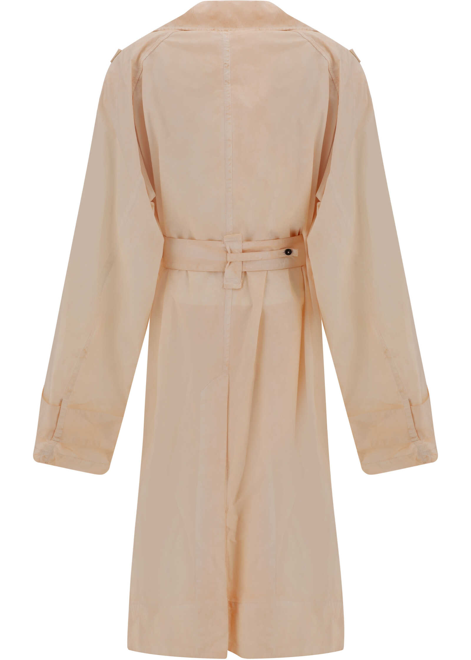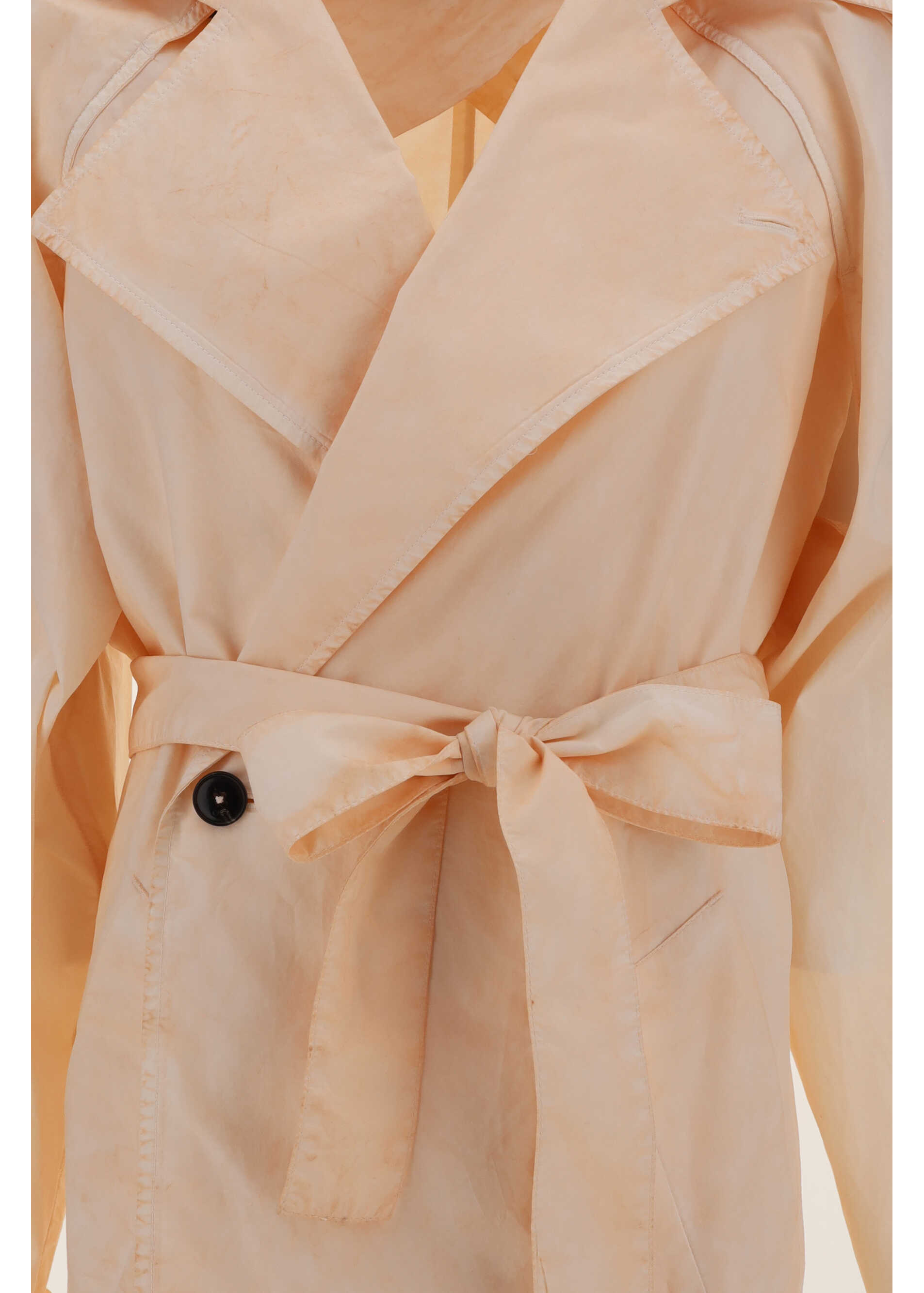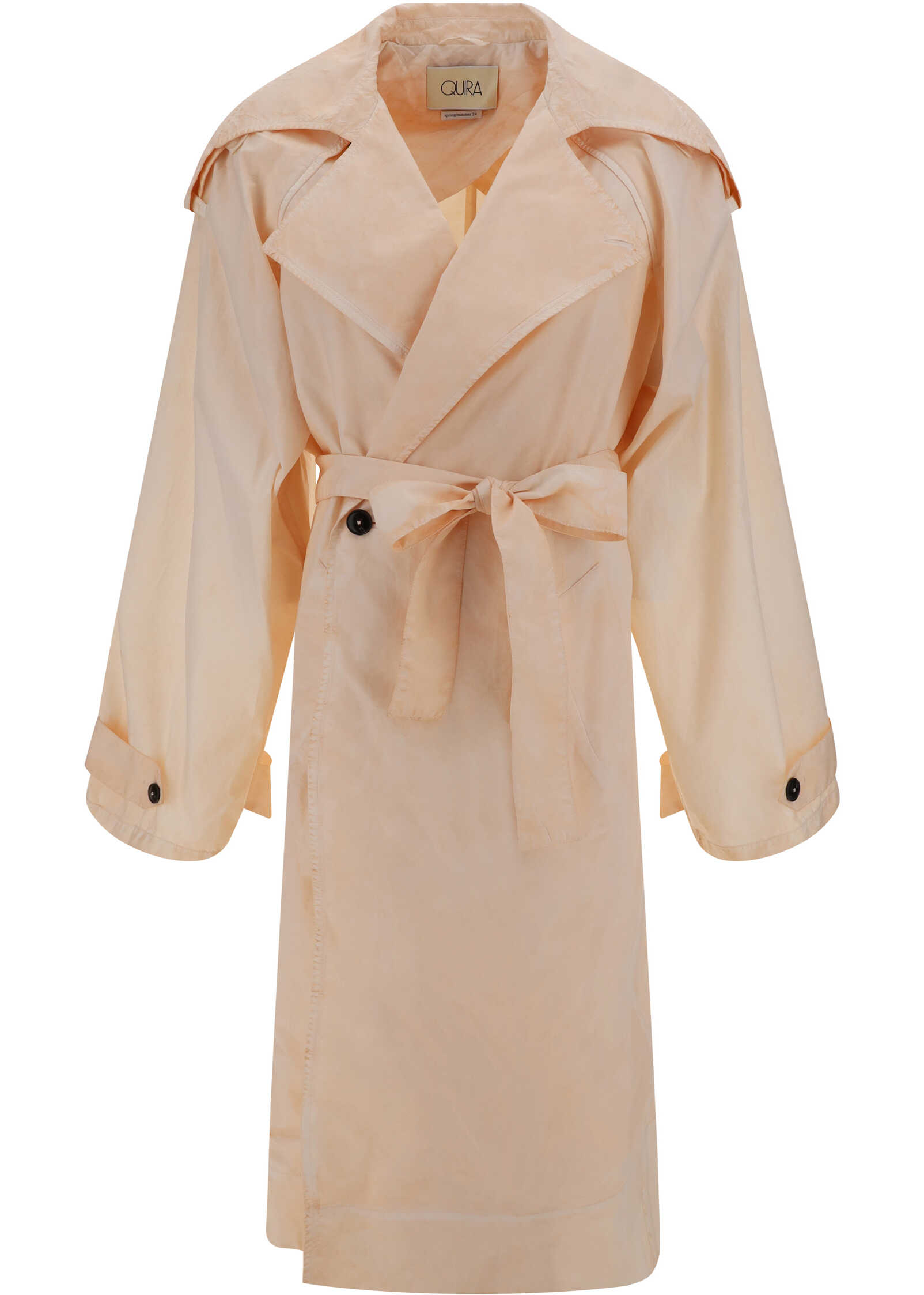 Oversized Trench Jacket by Quira, double-breasted closure by matching sash to tie waistband, wide geometric lapels, two side slit pockets, foot-length pattern.