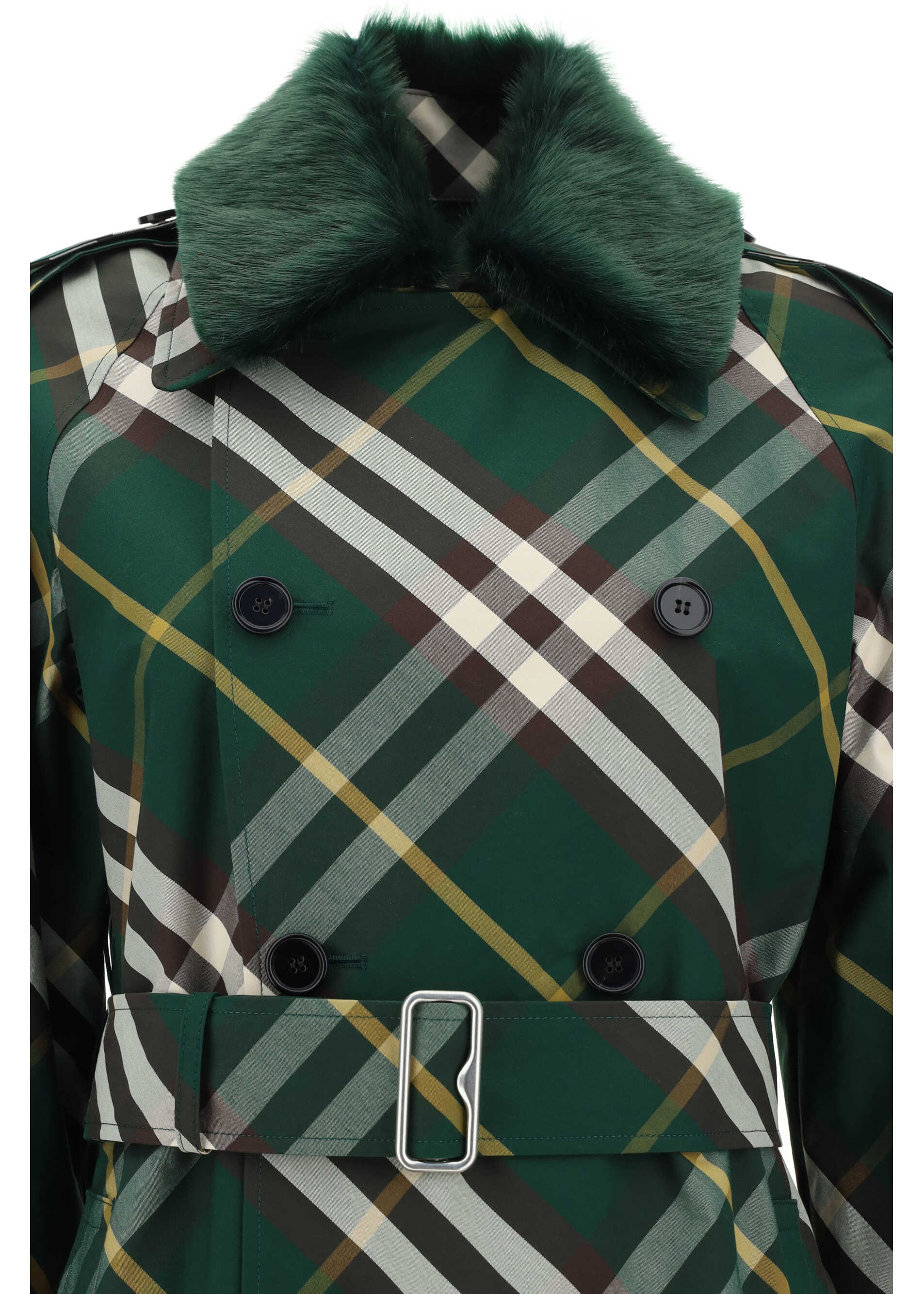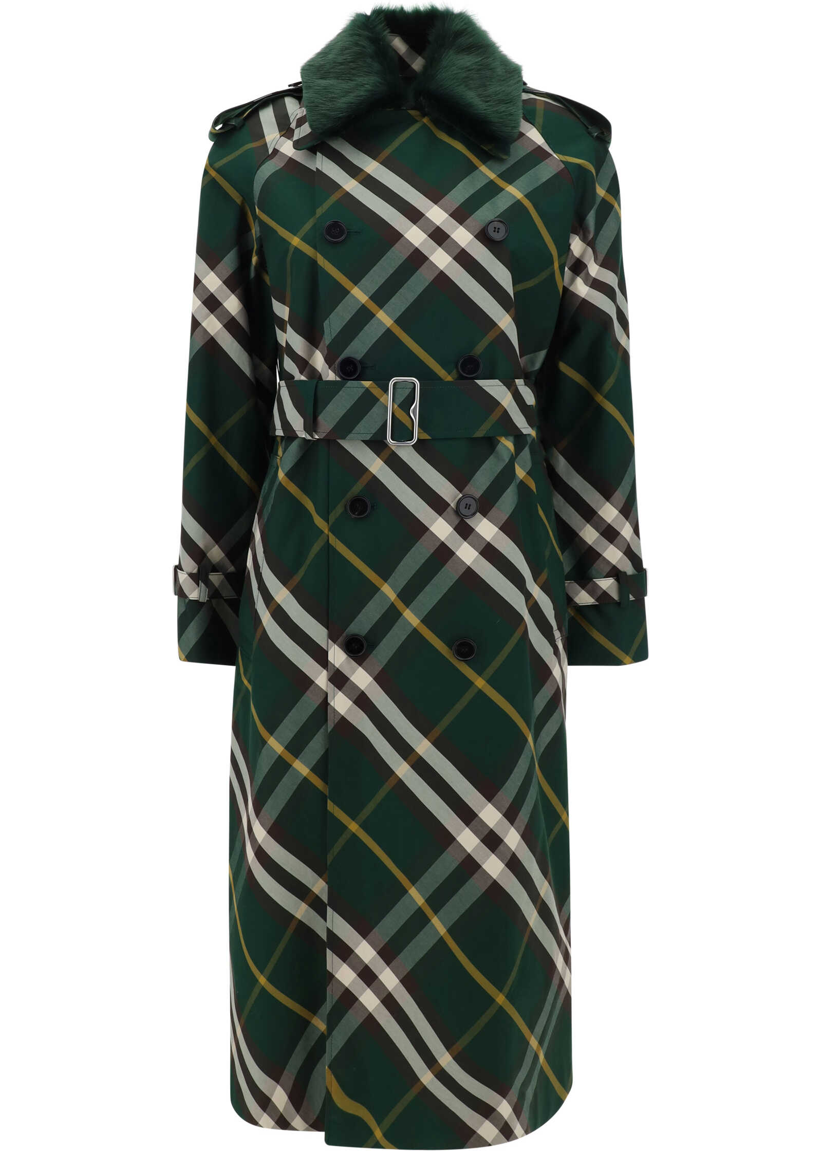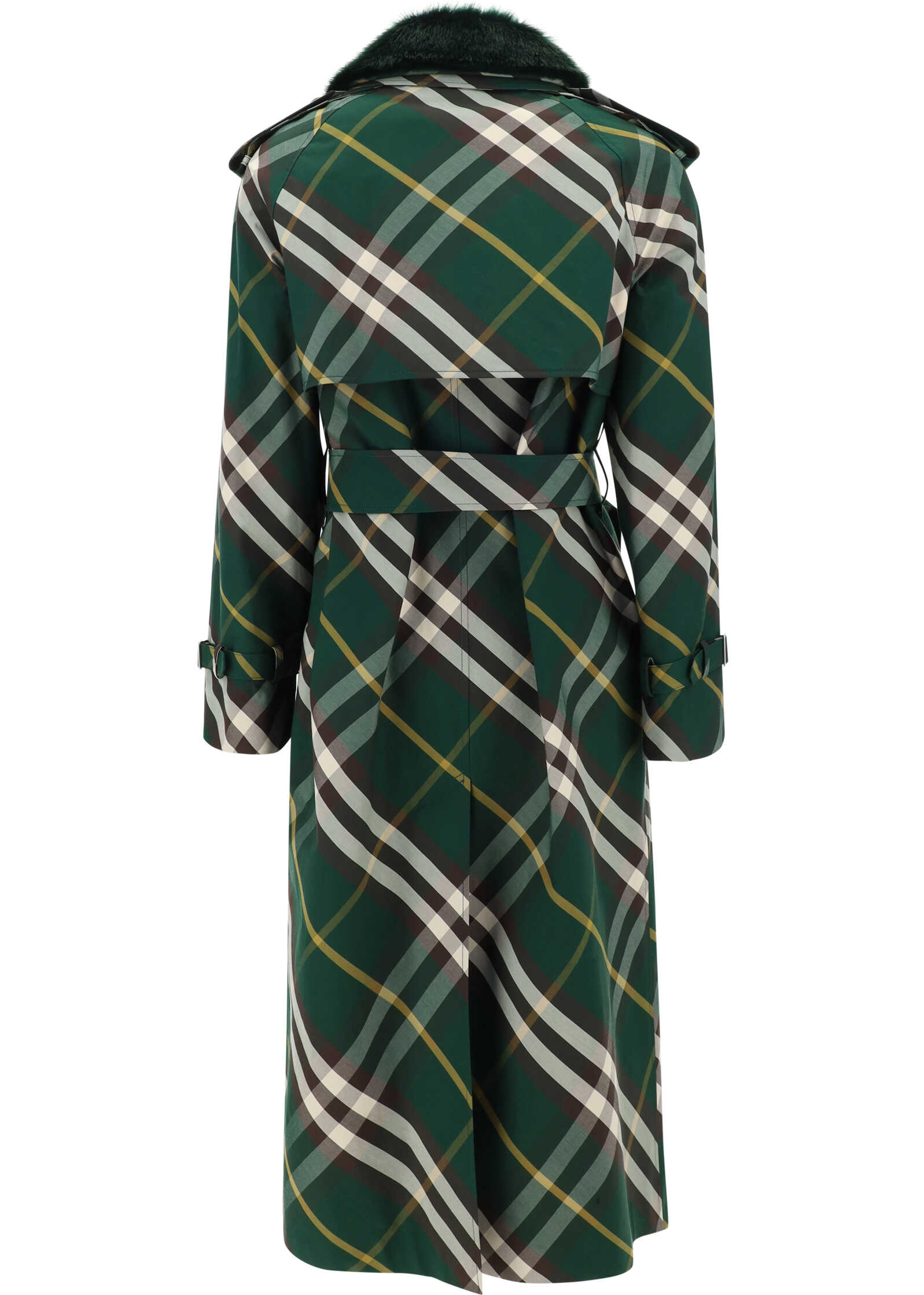 Cotton Trench Coat by Burberry, classic collar with removable faux fur appliqué detail, double-breasted design with front button closure, matching waist sash to close at front, iconic all-over repeated Check Archivio pattern, two side welt pockets, back slit, regular fit.