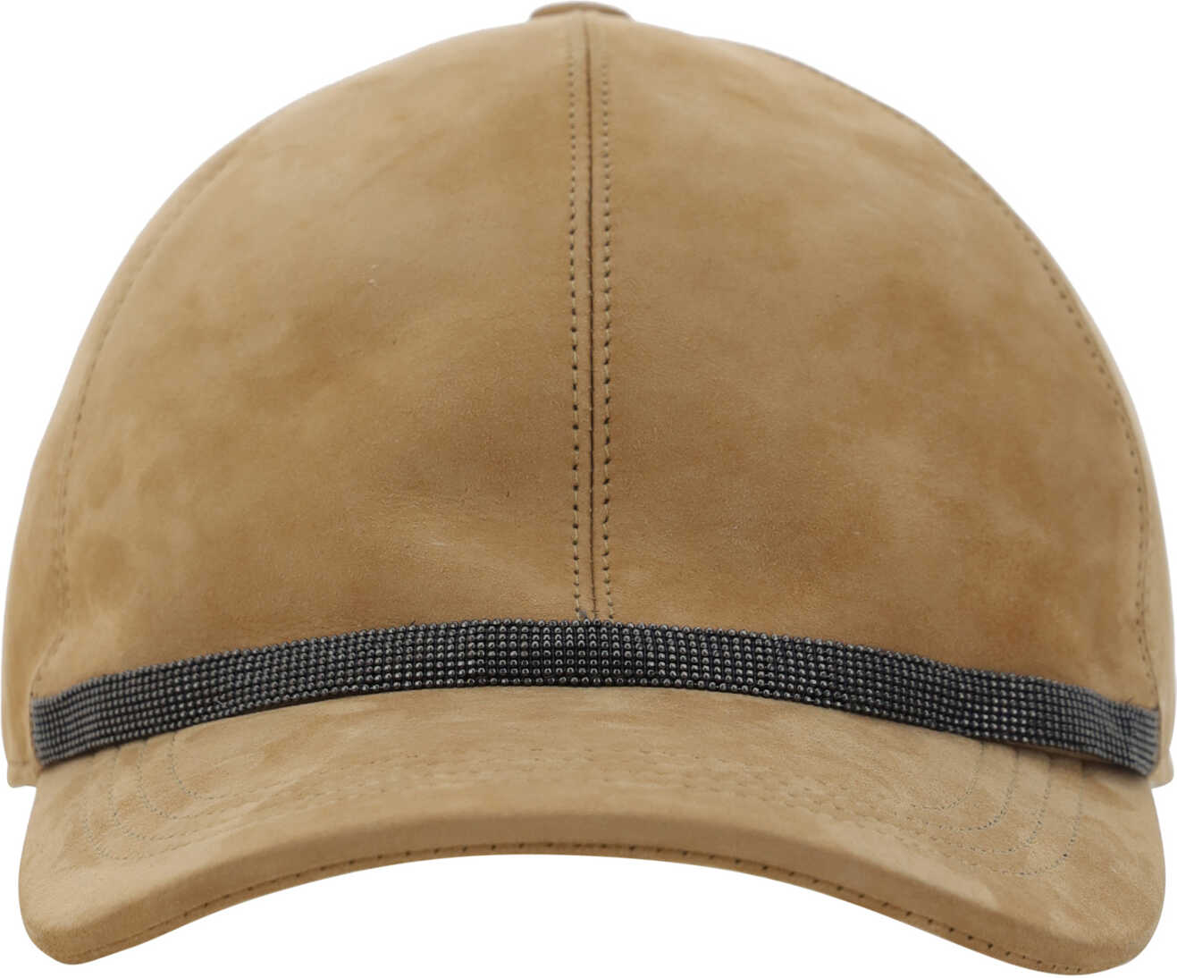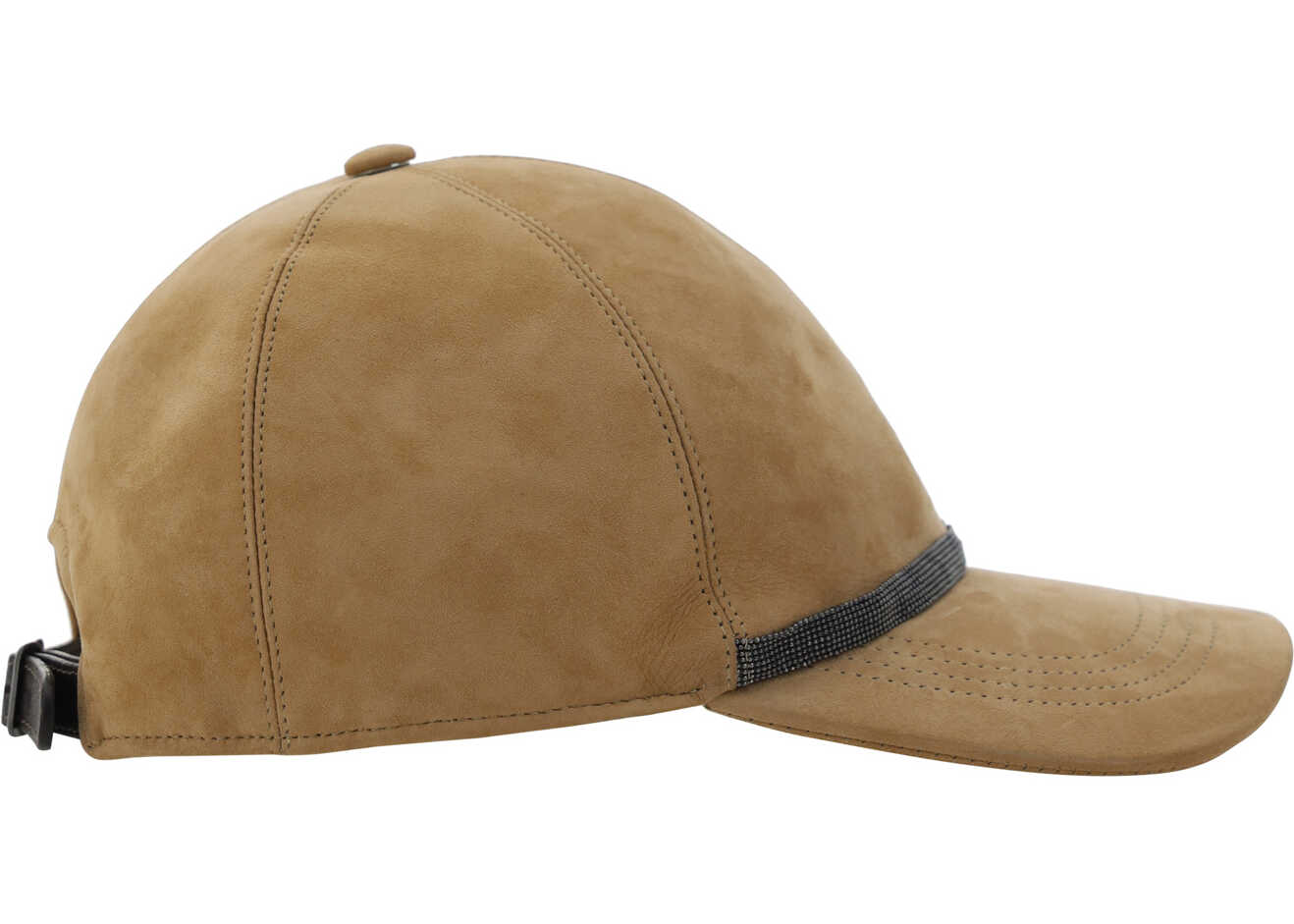 Calfskin Baseball Hat by Brunello Cucinelli, adjustable back closure, shiny jewel detail on front, suede leather design.