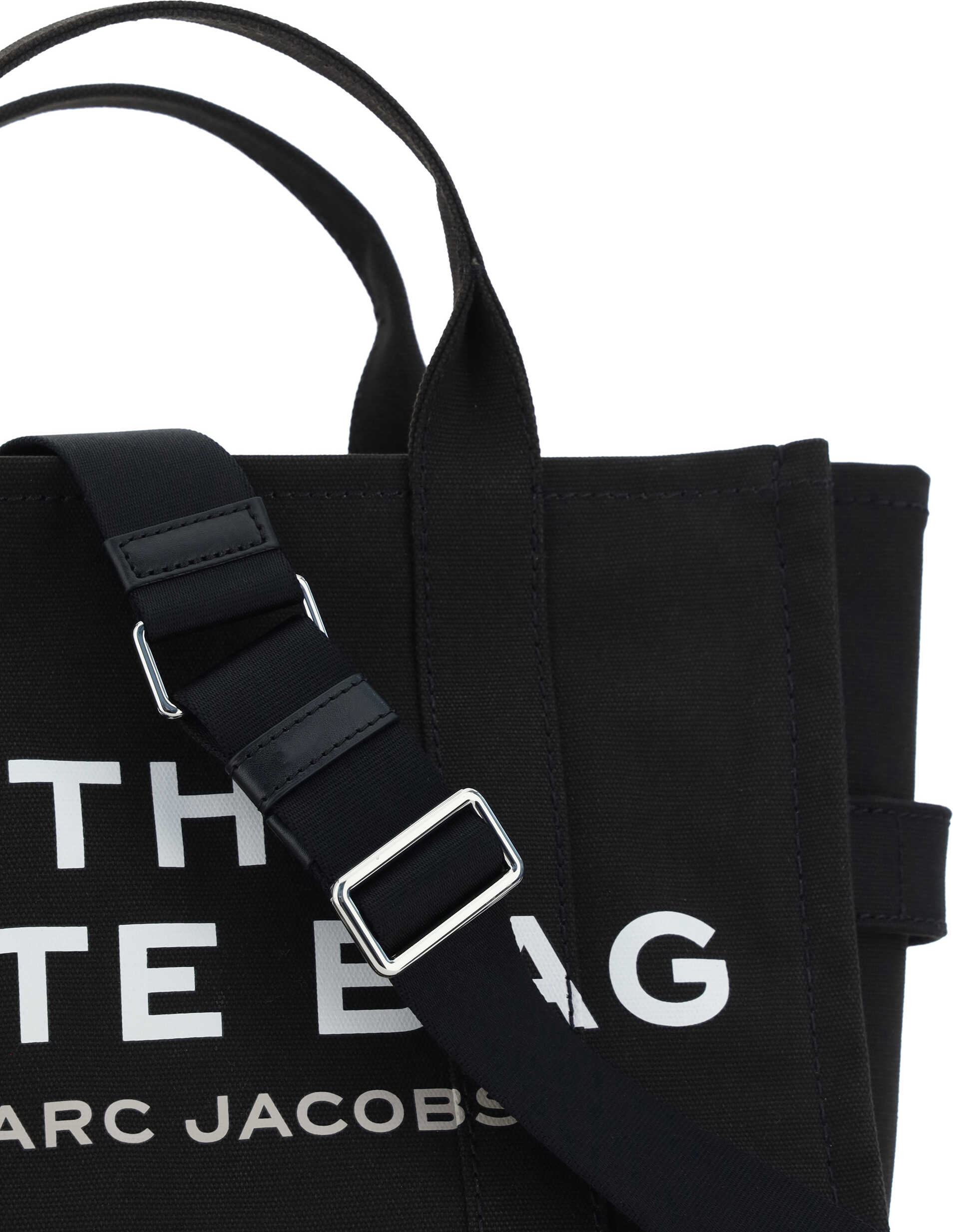 The cotton Medium Tote Handbag by Marc Jacobs, two rigid tubular top handles, top zipper closure, single interior pocket, adjustable and removable flat shoulder strap, contrasting iconic brand monogram print on front, contrasting iconic brand monogram patch applied on back.