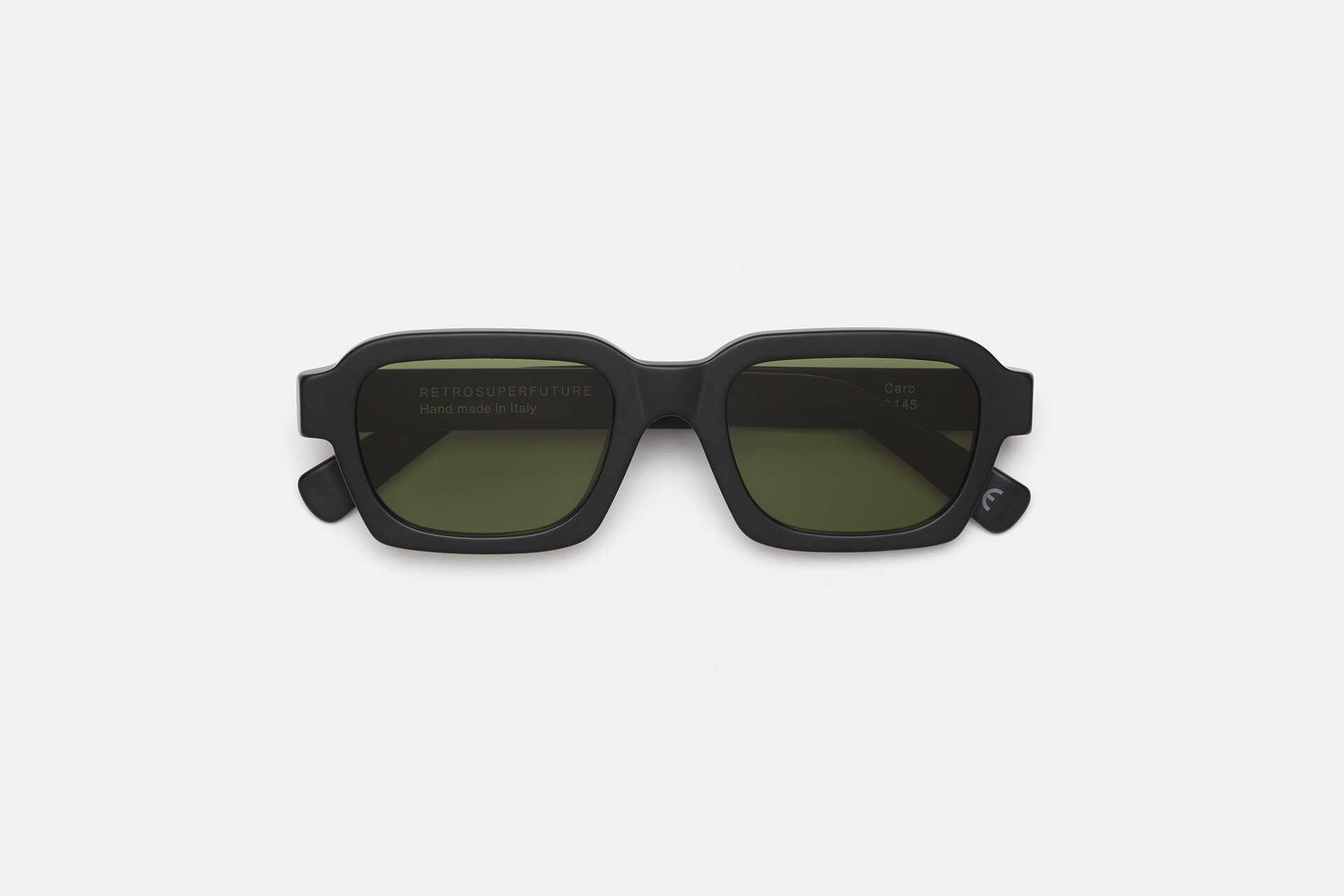 Retrosuperfuture Rectangular sunglasses, acetate temples, matte black frame, green lenses, logo detail, the package contains a semi-rigid case and a cleaning cloth.