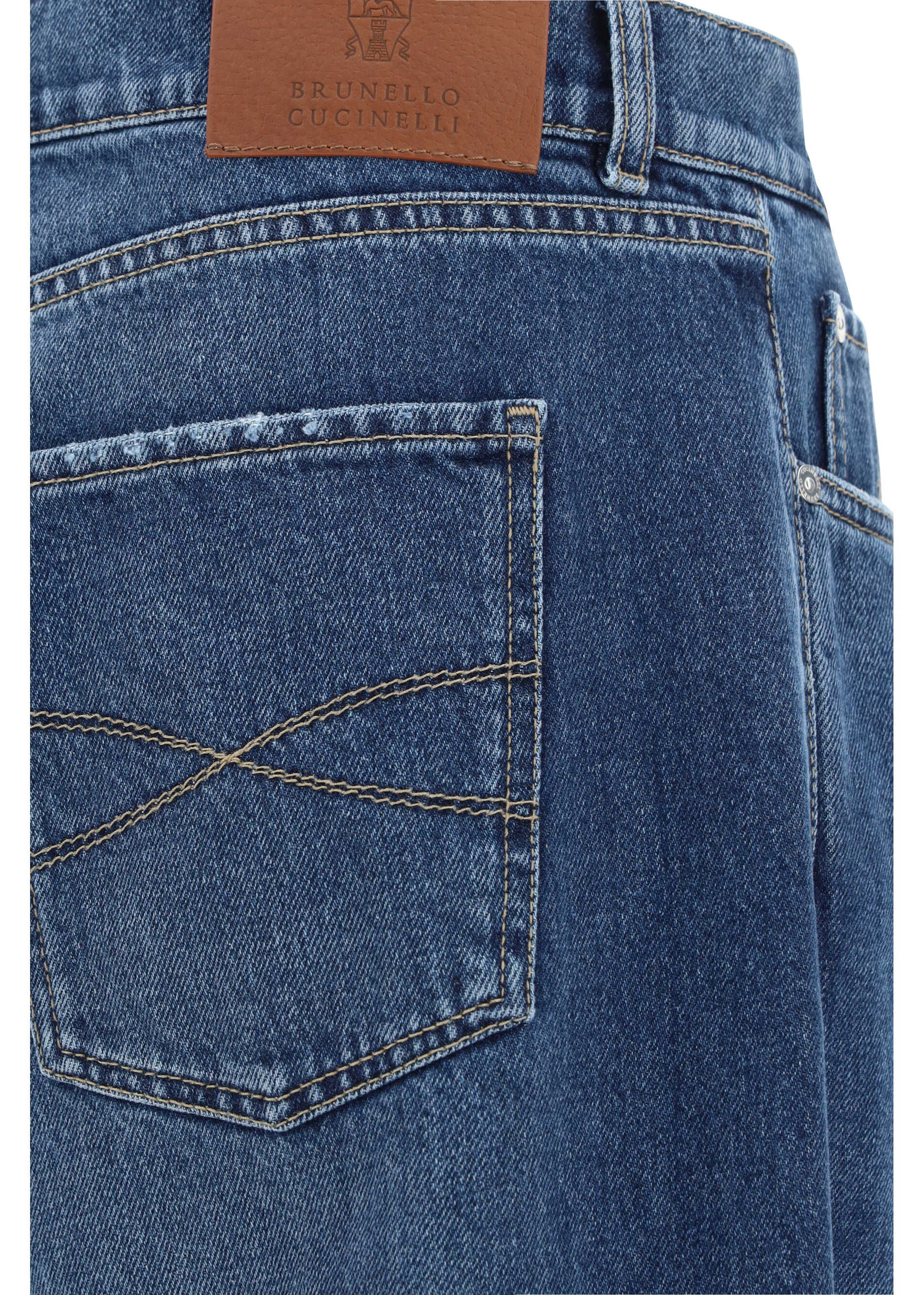 Cotton Jeans by Brunello Cucinelli, five-pocket straight fit, front button and zipper closure, waistband loops, contrast stitching.