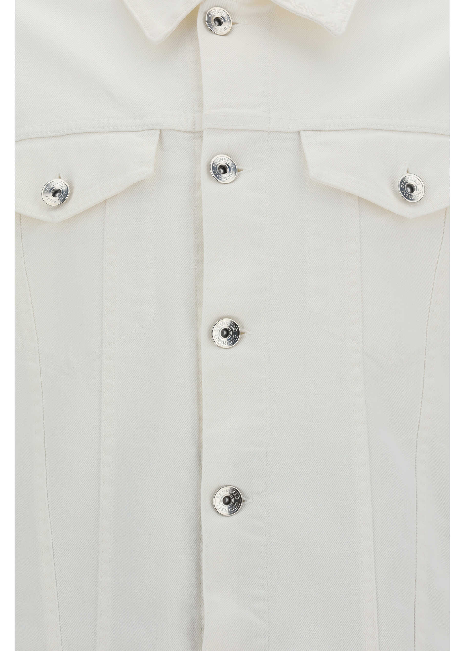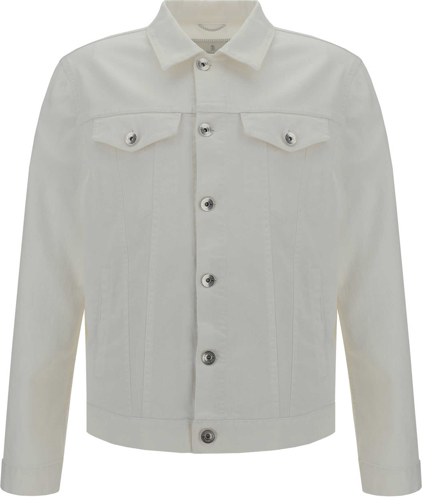 Cotton Denim Jacket by Brunello Cucinelli, featuring a classic collar, a front button closure, two side welt pockets, two flap patch pockets on the front panel, a monochrome pattern, and a regular fit.