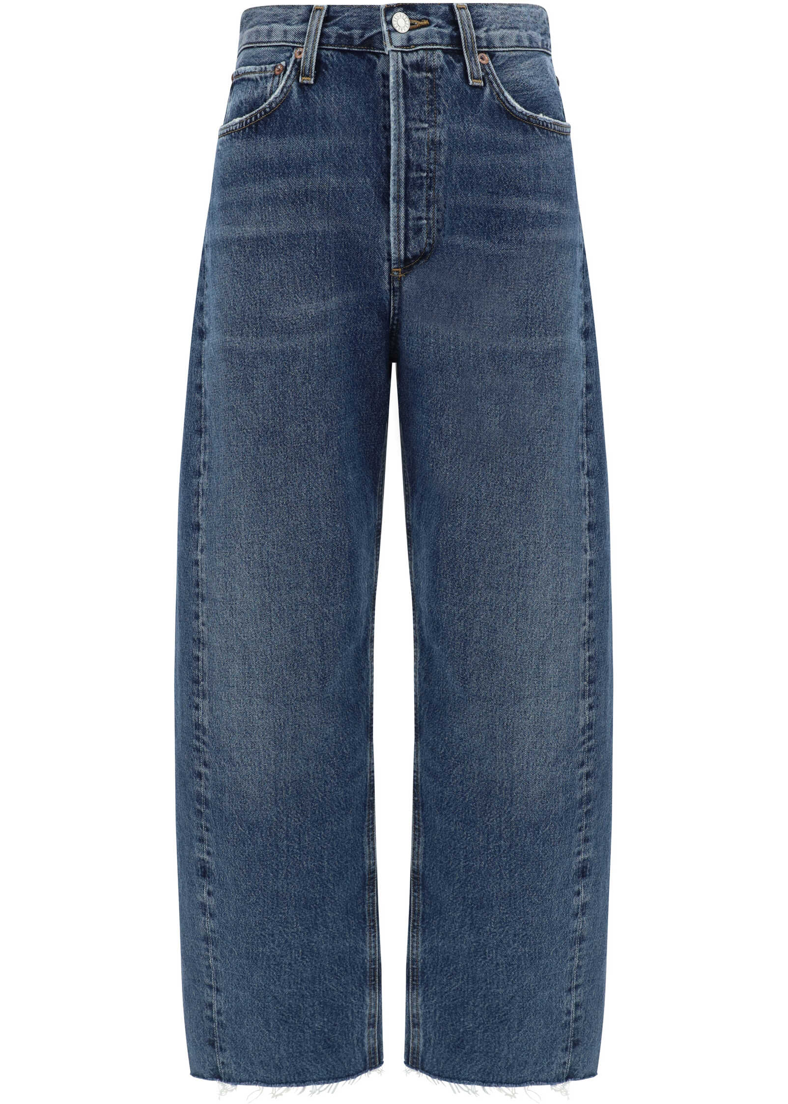 Cotton Luna Jeans by Agolde, wide-leg five-pocket style, front button closure, waistband loops, frayed hems.