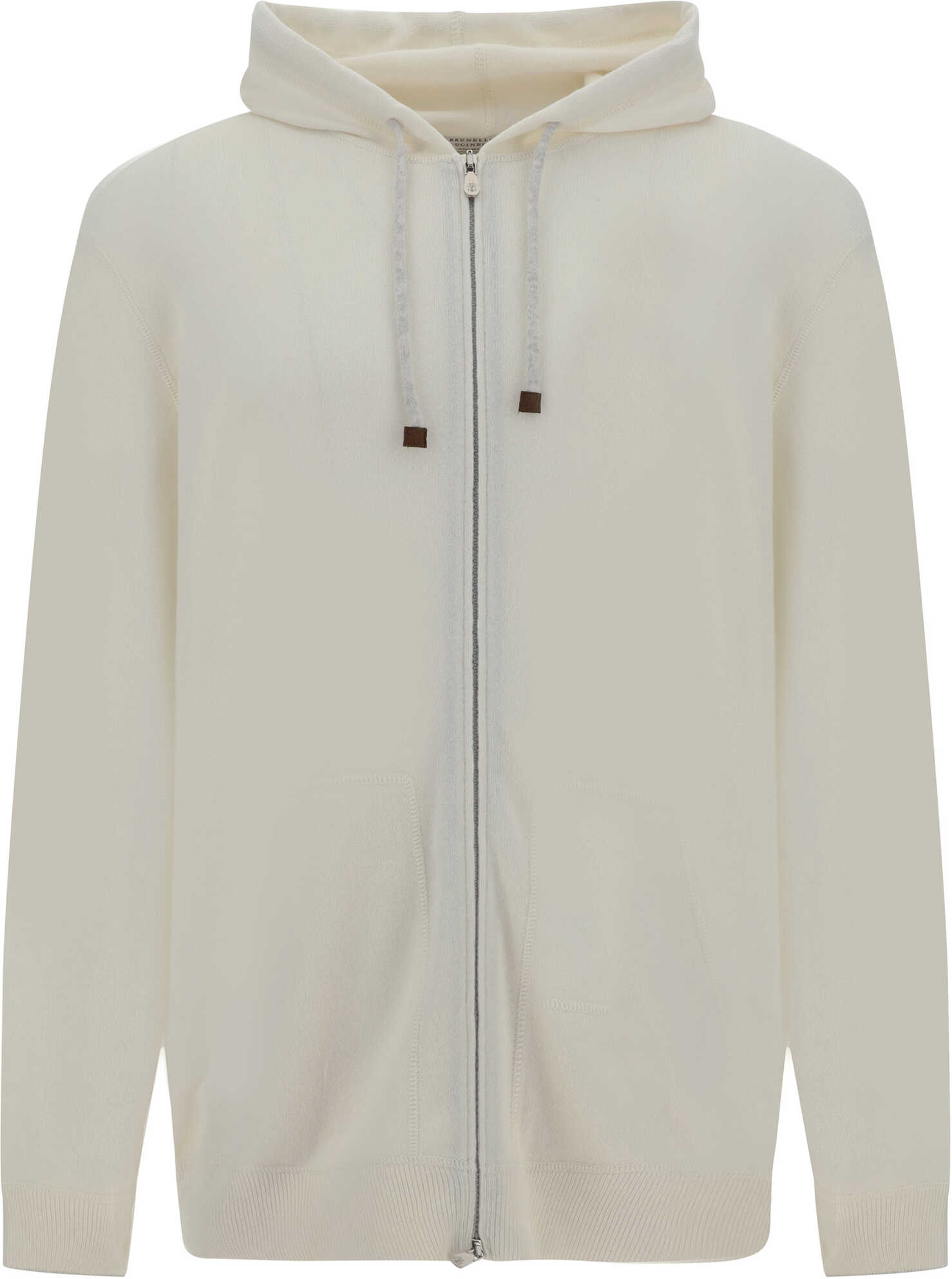 Cashmere Hooded Sweatshirt from Brunello Cucinelli features hood with adjustable drawstring, two-way front zipper closure, ribbed cuffs, ribbed hem, two welt patch pockets on front, monochrome pattern, regular fit.