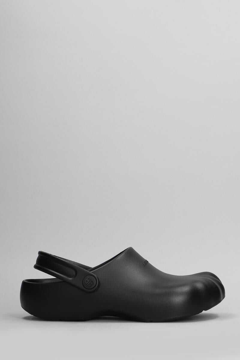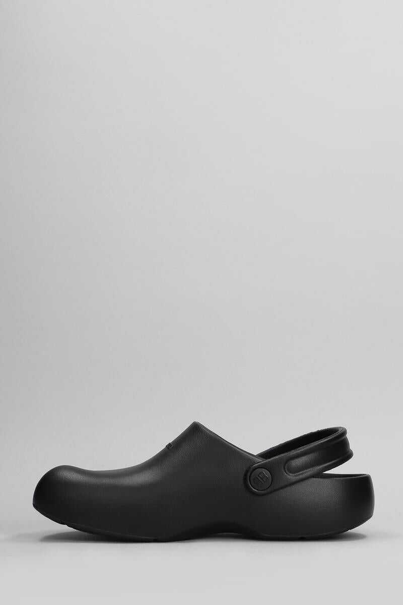 Sunday molded Slipper-Mule in black rubber/plasic, round toe, five toe anatomical shape, heel strap, embossed logo, sling back, engraved logo, open back, 100% rubber , Made in Italy