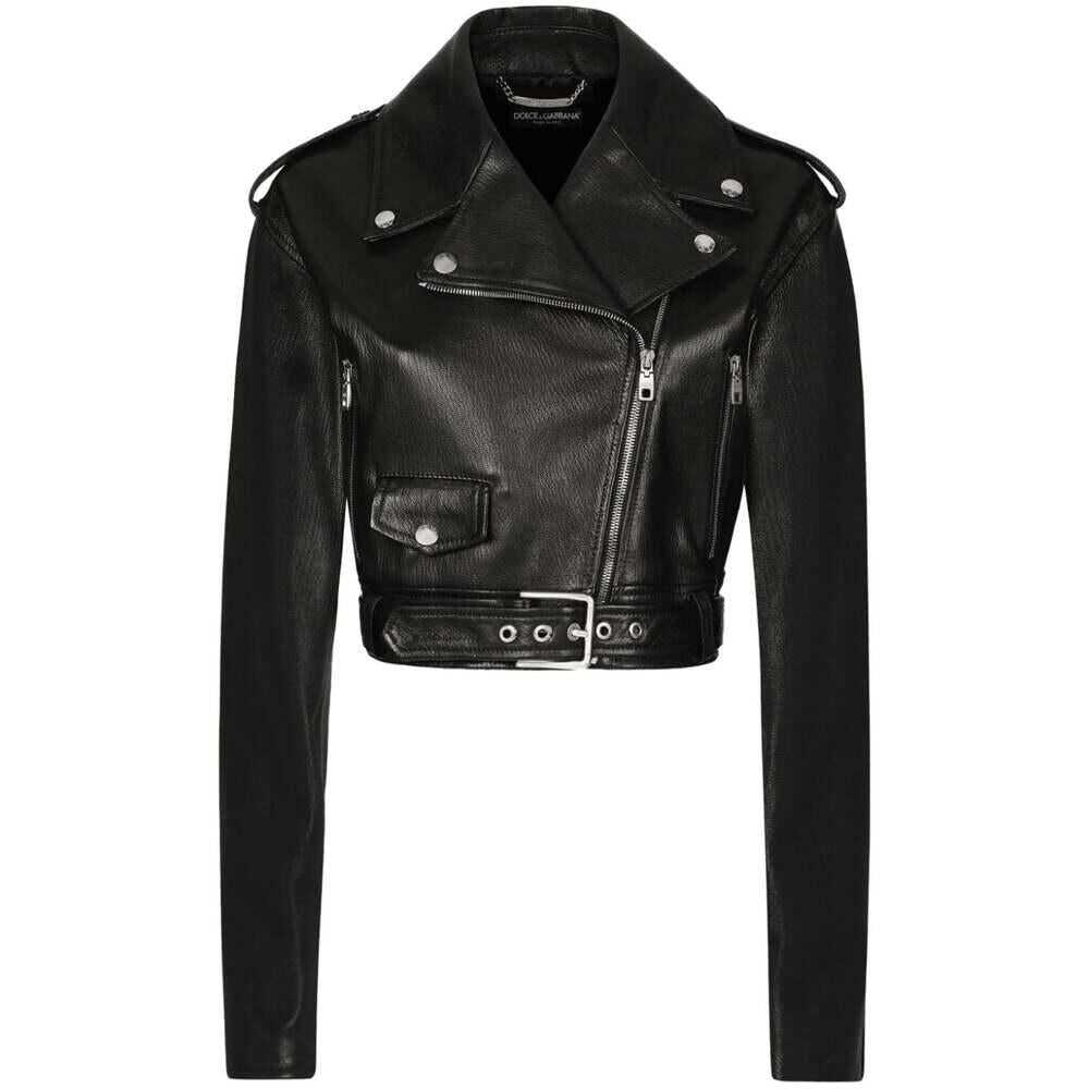 Black nappa leather notched collar off-centre front zip fastening epaulettes long sleeves front flap pocket two side zip-fastening pockets belted waist cropped silver-tone hardware