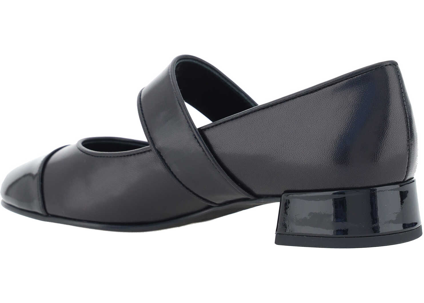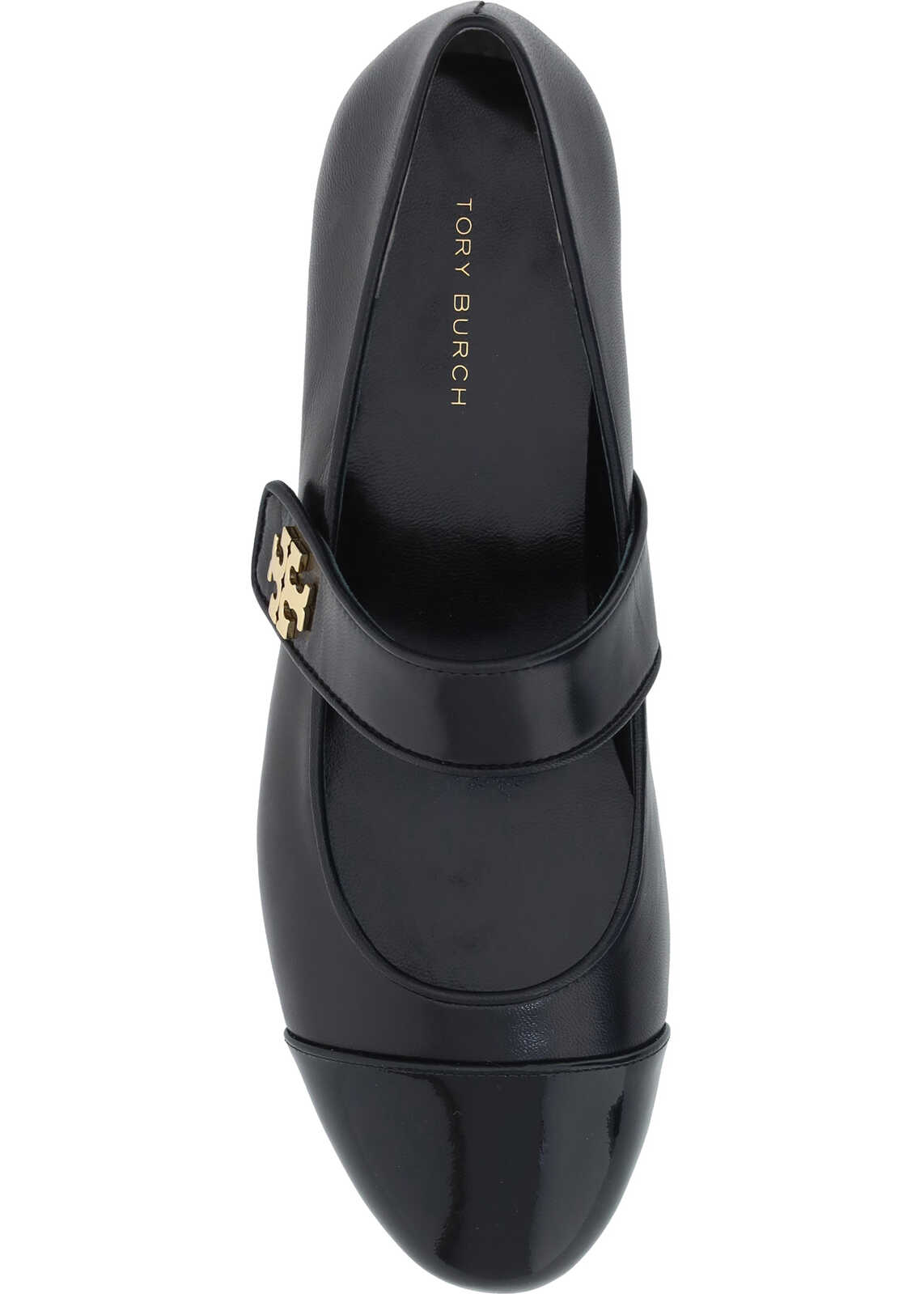 Calfskin Mary Jane Pumps by Tory Burch, leather chunky heel, almond toe on contrasting patent leather front, adjustable back strap embellished with iconic brand logo plaque.