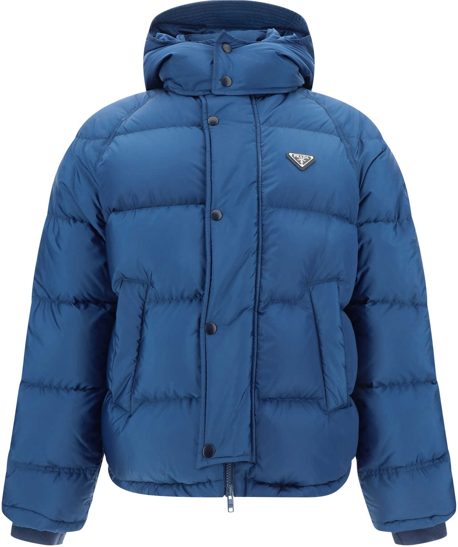 Down Jacket by Prada, front snap-button closure, hooded design, all-over padded and quilted design, two side welt pockets, elasticated ribbed cuffs, regular fit, iconic enameled triangular brand signature plaque applied to front.