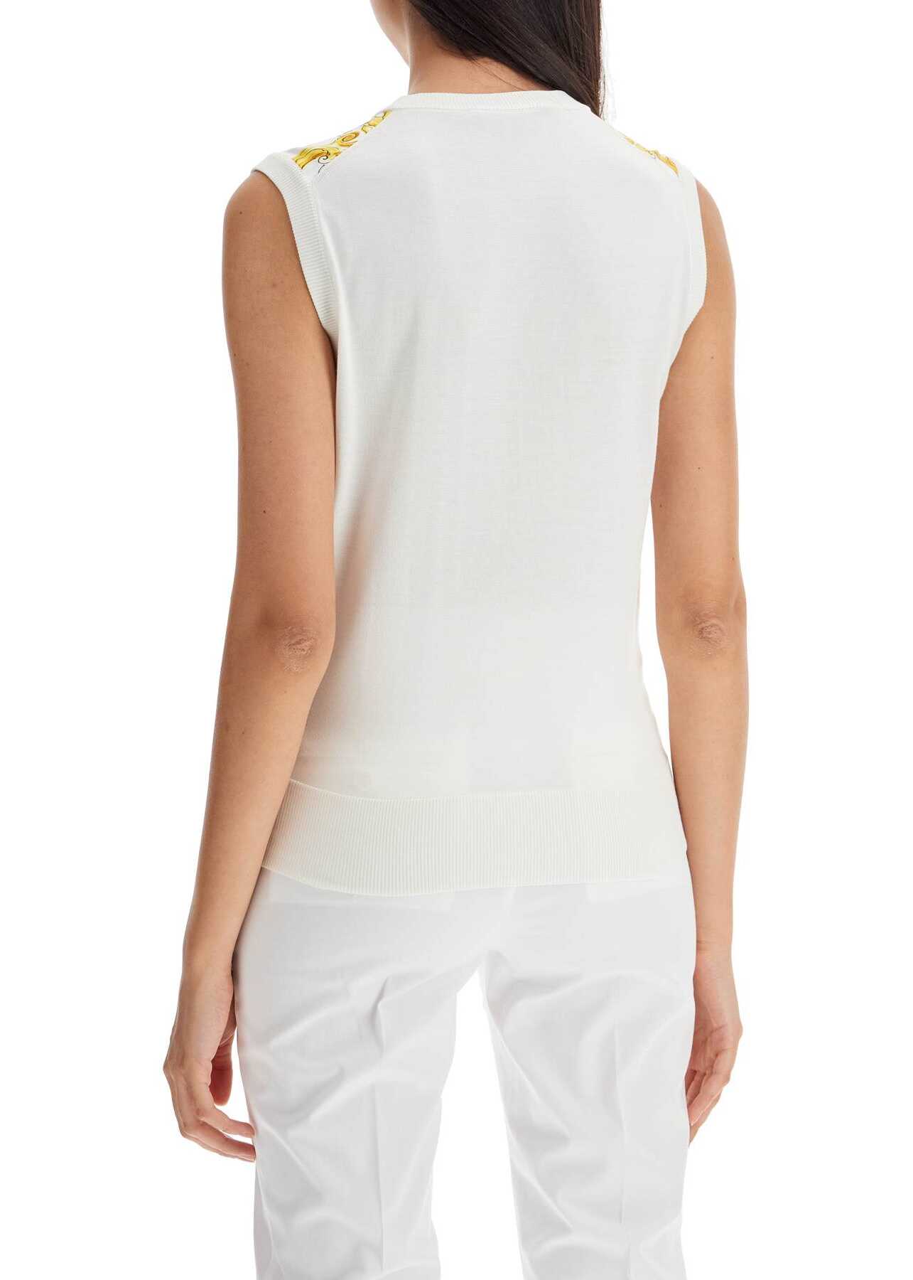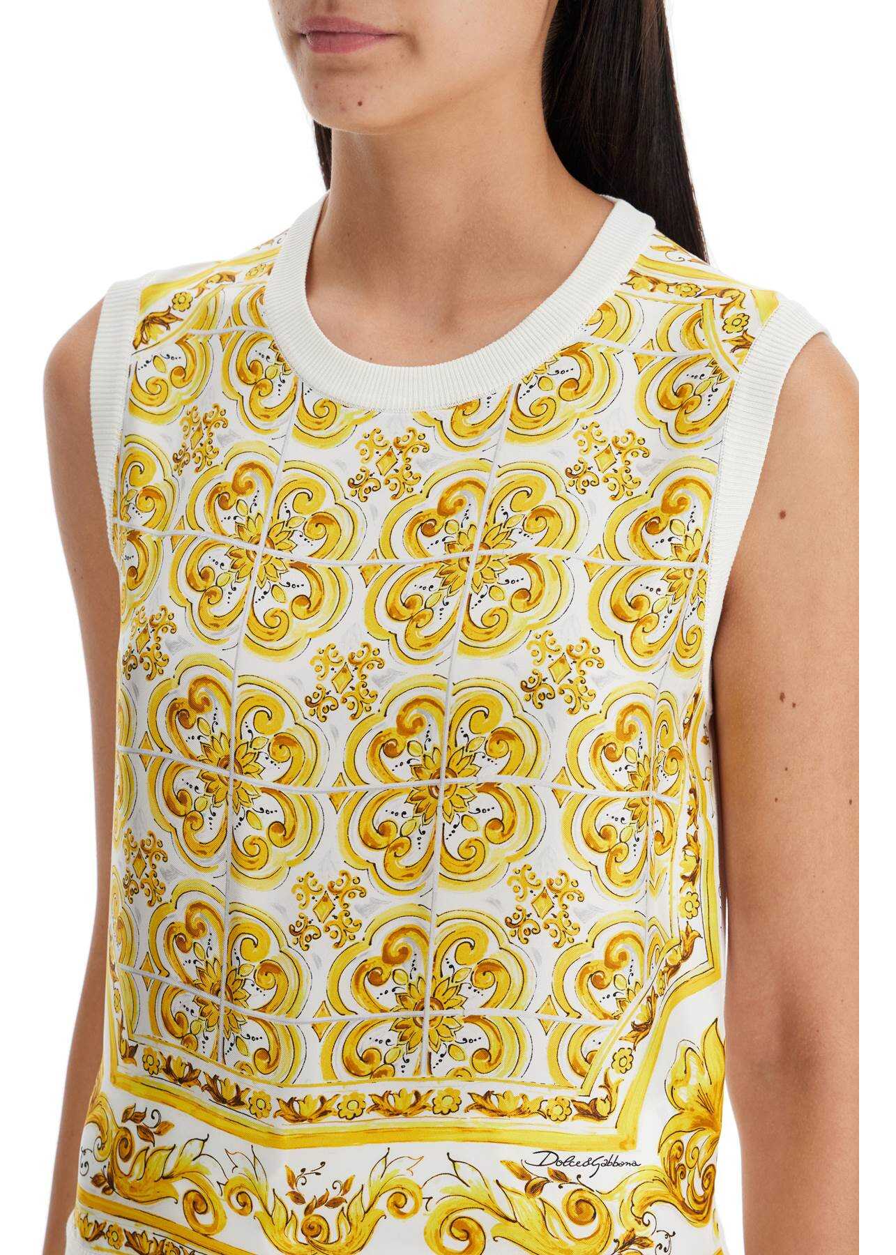 This top by Dolce & Gabbana is made of fine silk knit with a front panel in printed Maiolica silk twill. It features a round neckline with ribbed trim and has a regular fit. The model is 177 cm tall and wears an Italian size 40.