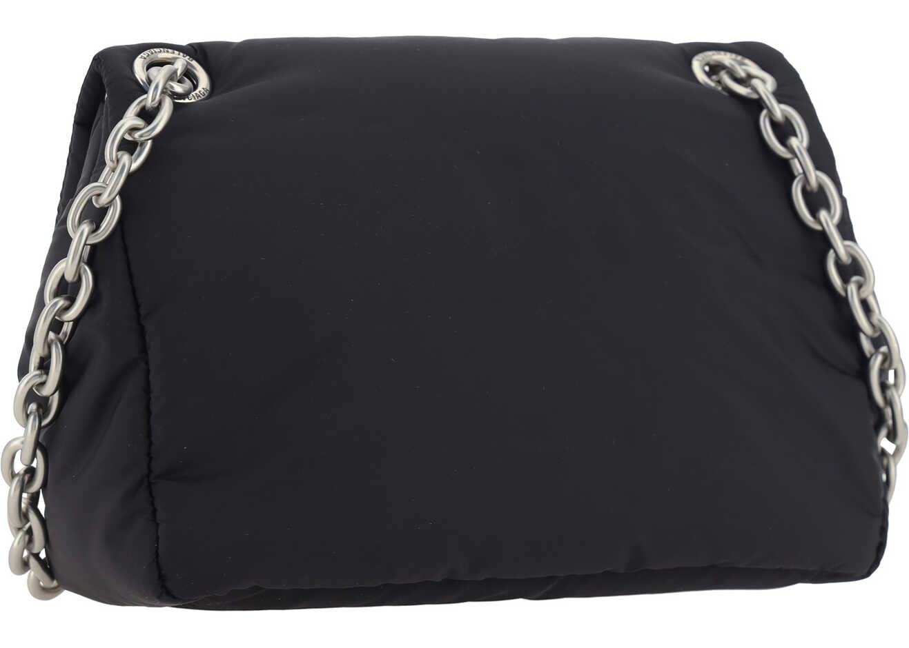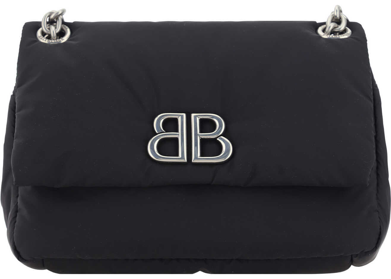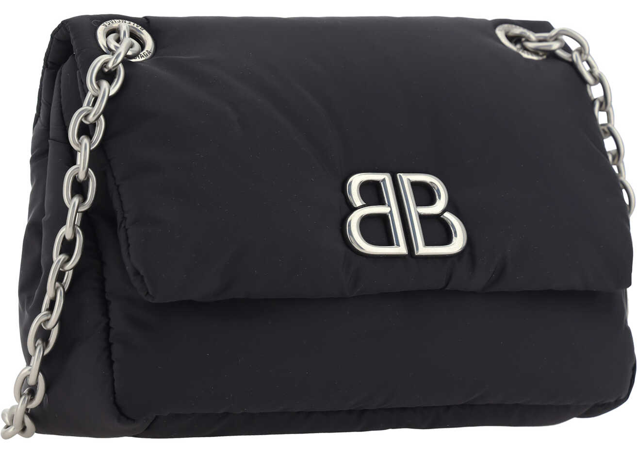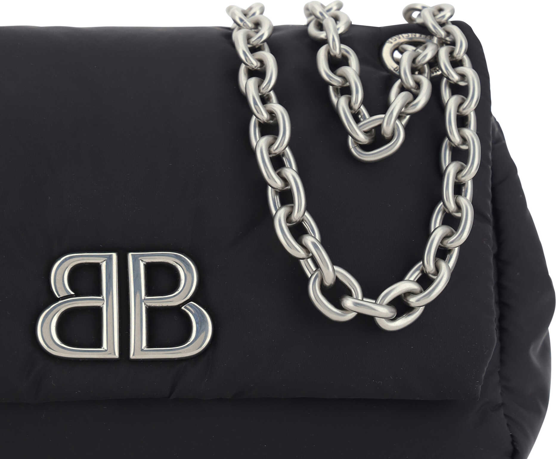 Monaco Shoulder Bag by Balenciaga, silver-plated sliding chain strap, front closure via magnetic flap embellished with the brand's iconic three-dimensional logo, padded bag effect design, single interior compartment, slit pocket with interior zipper.