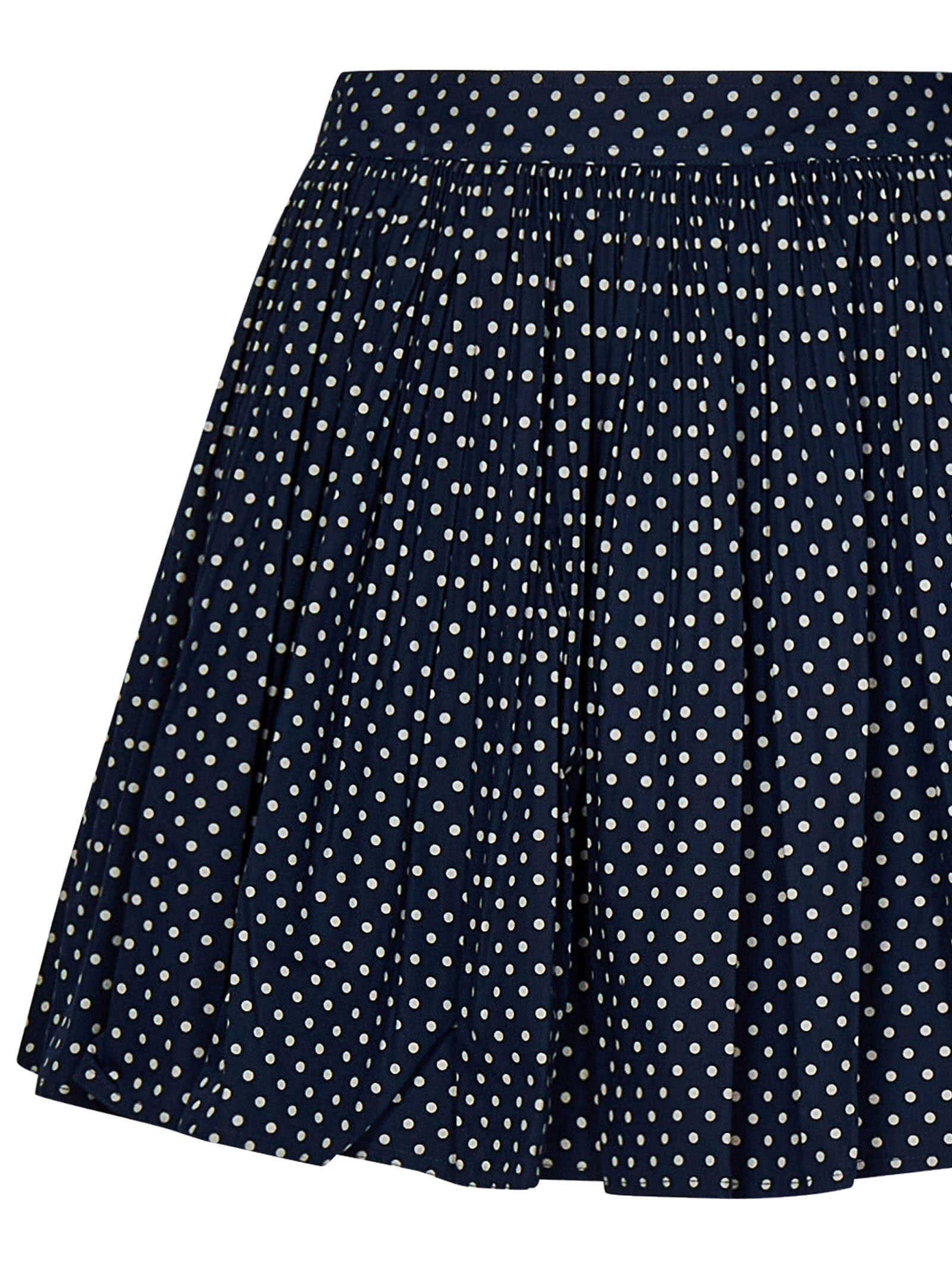 Short pleated skirt in blue cotton blend with all-over polka dot pattern.
