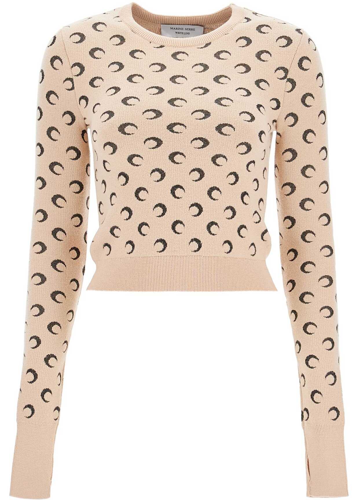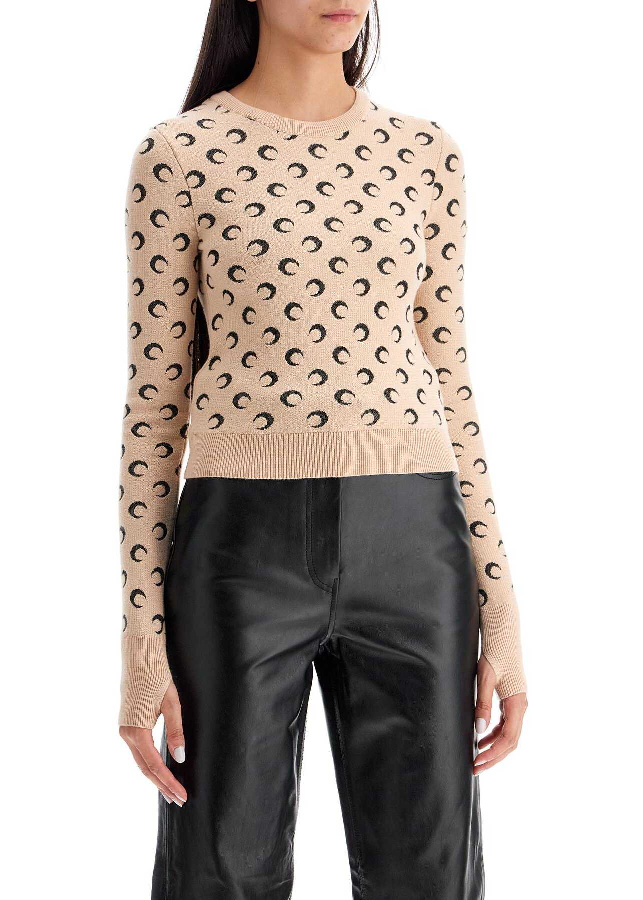 This Marine Serre cropped crewneck pullover is made of pure wool ribbed knit with the signature Moon Jacquard pattern throughout. It features ribbed finishes and thumbholes at the cuffs. The fit is slim. The model is 177 cm tall and wears a size S.