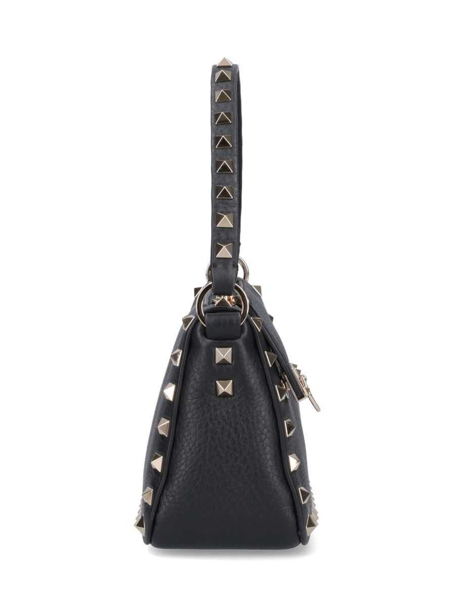 Black shoulder bag with decorative studs, silver-colored hardware, top handle, removable adjustable shoulder strap, zip closure and internal flat pocket.