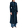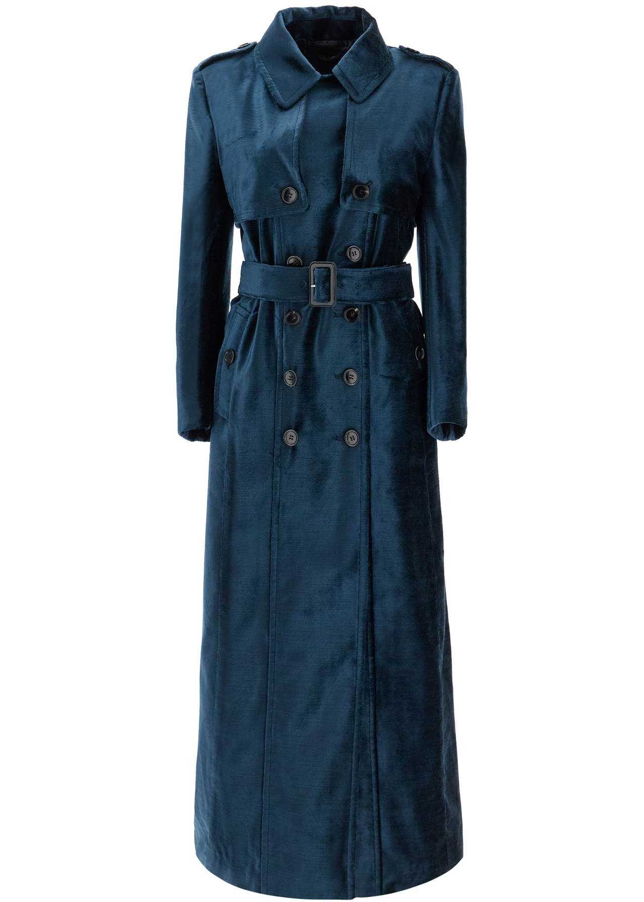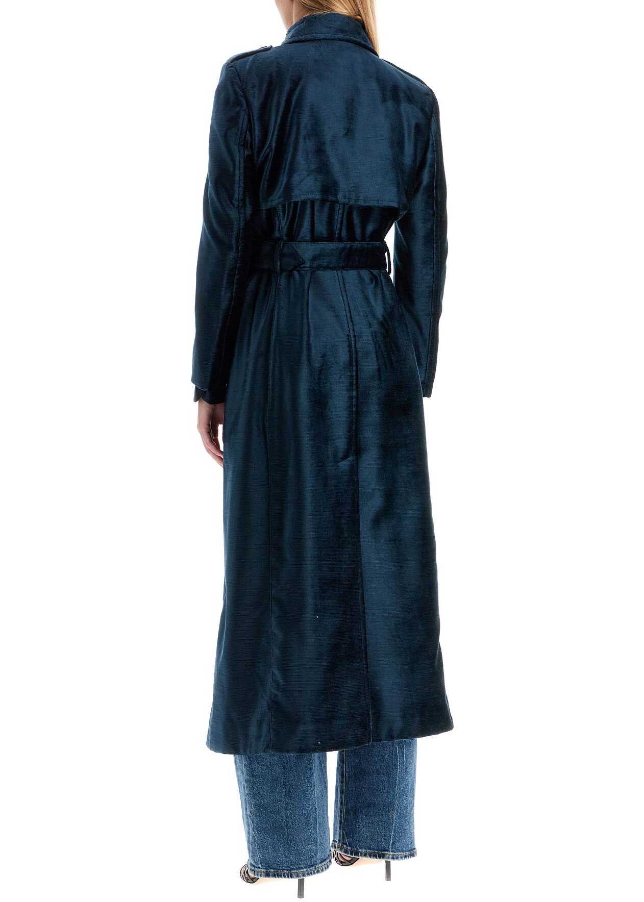 Crafted in soft flame velvet with a satin finish, this Tom Ford maxi coat draws inspiration from the design of a trench coat with features such as front and back storm flaps and epaulettes on the shoulders. It stands out for its elegant straight silhouette cinched at the waist by a matching leather belt with buckle. The double-breasted style has twelve horn buttons and a convertible collar, along with flap pockets secured by buttons. Lined with twill and padded shoulders. Model is