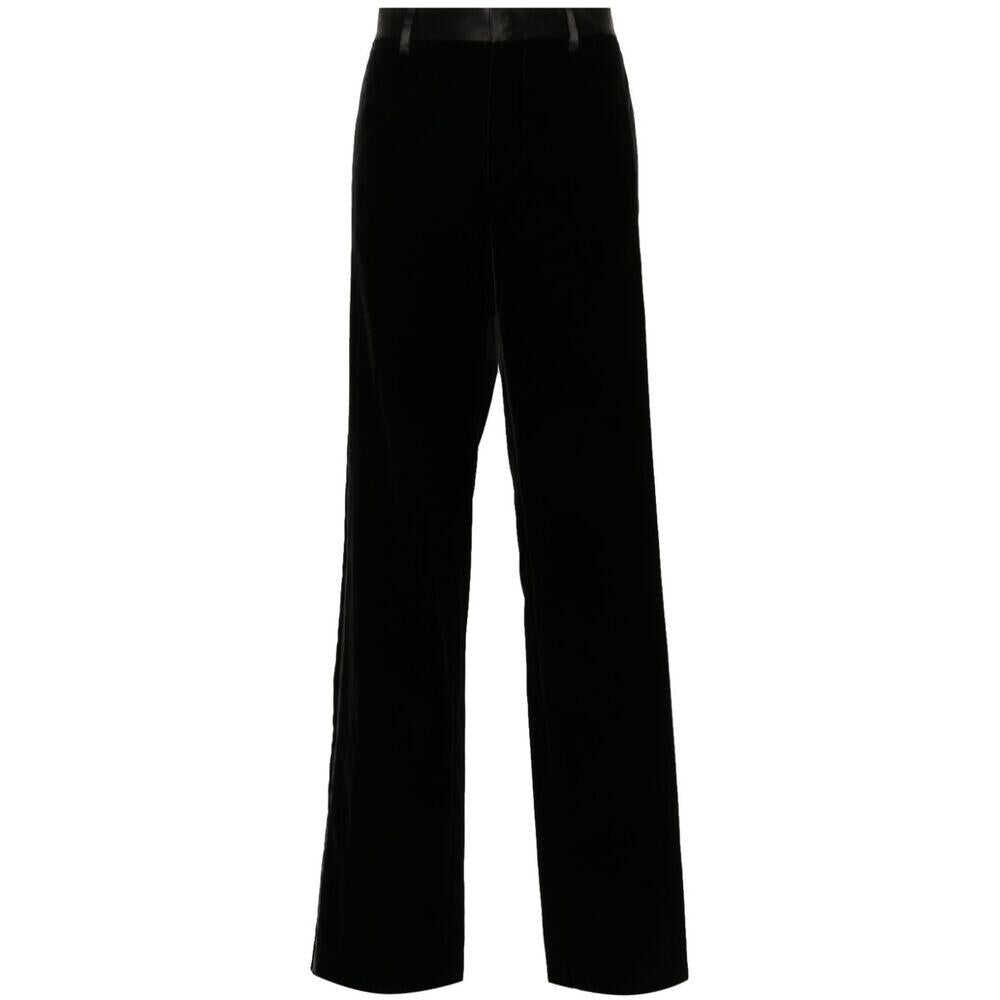 Black velvet concealed front button, hook and zip fastening belt loops two side inset pockets side stripe detailing two rear jetted pockets straight leg