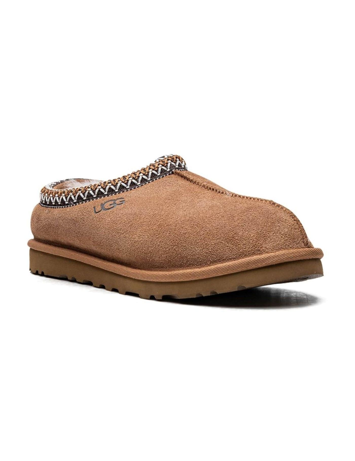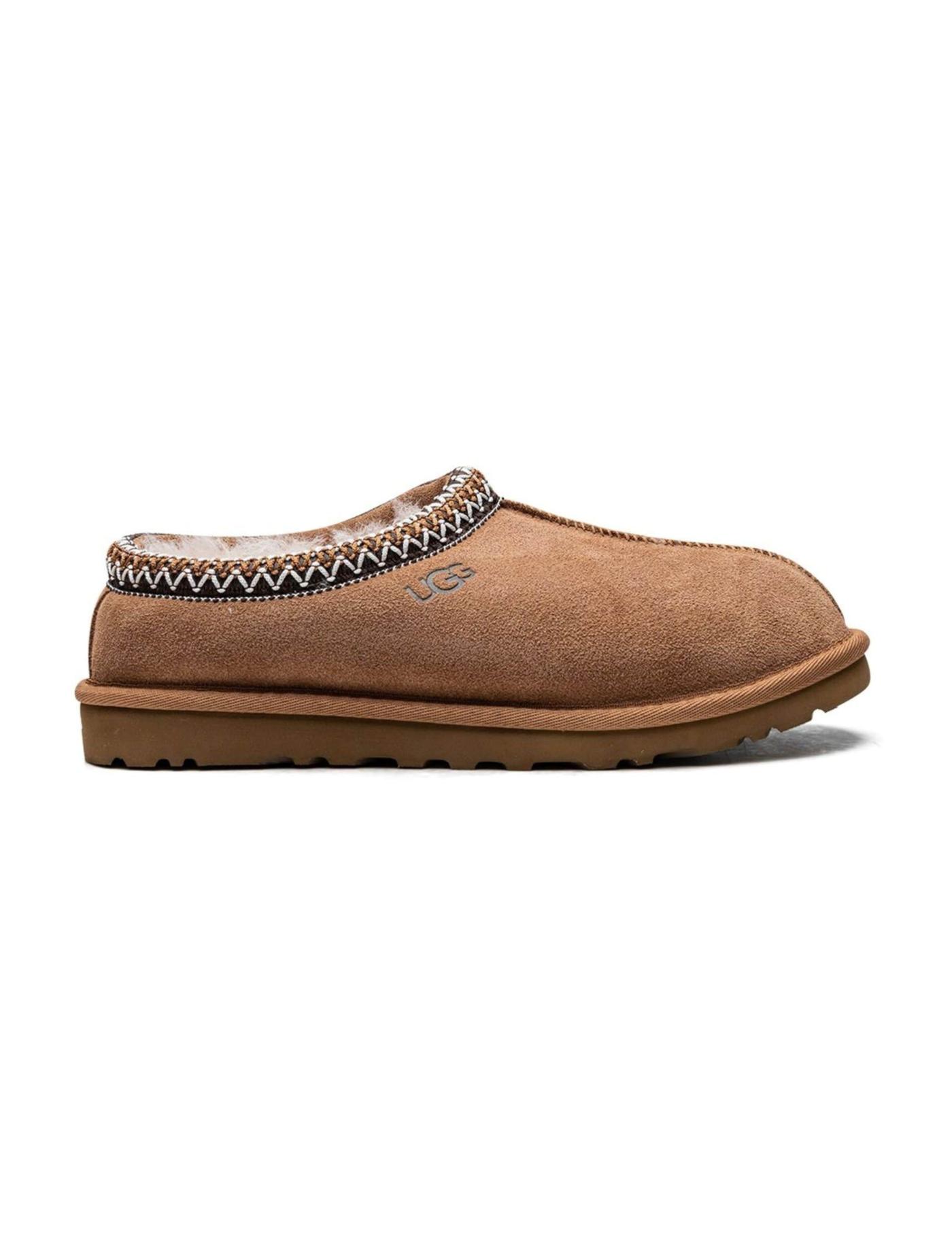 The Tasman slippers are a popular silhouette of the Australian brand UGG. This chestnut brown iteration is crafted from a supple suede outer, lined with a plush shearling interior that offers a warm and cosy sensation. Underfoot, a thick rubber sole allows for both outdoor and indoor use.