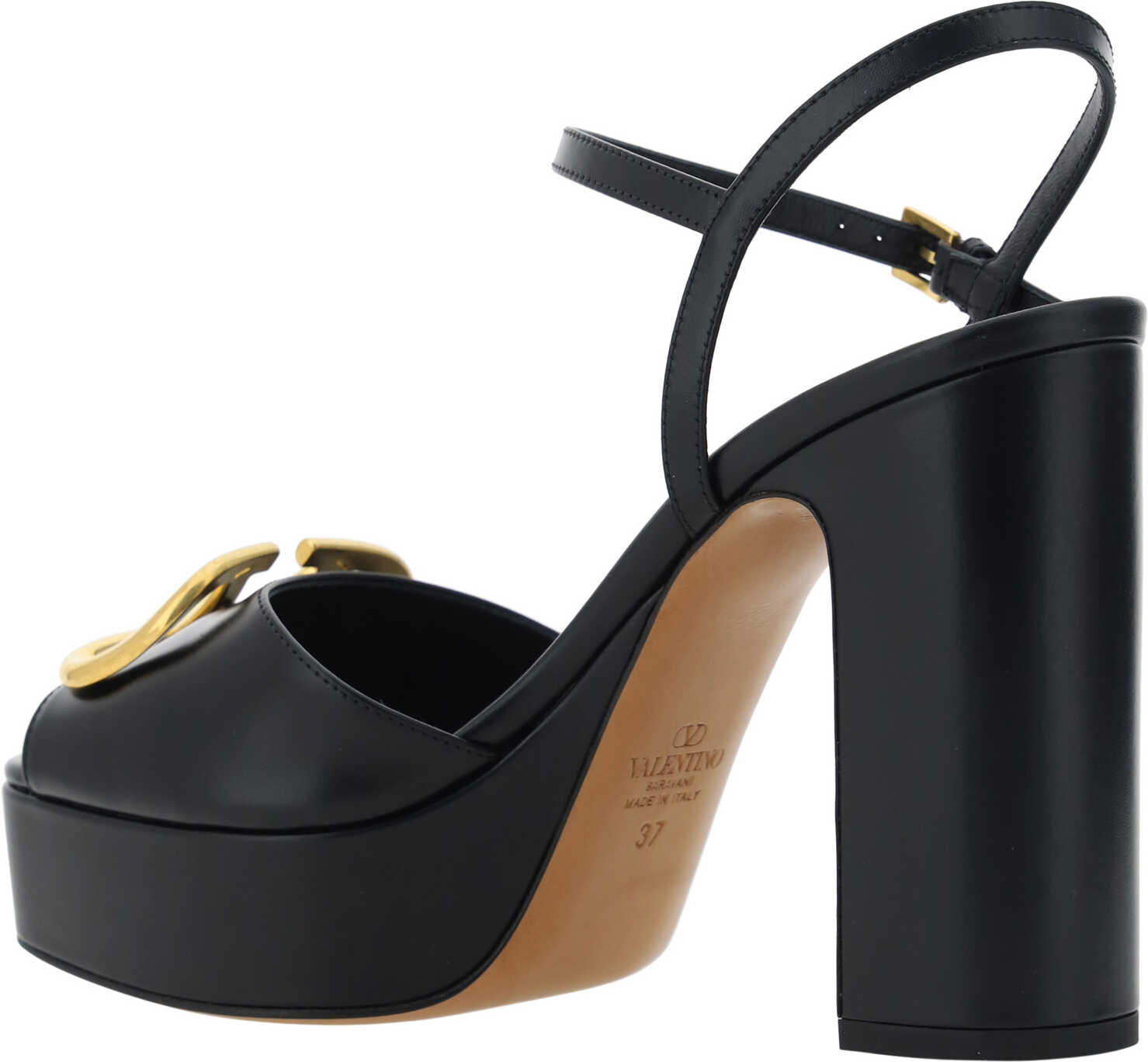 Leather Sandals by Valentino Garavani, almond toe open to the front, an appliquéd iconic brand logo plaque on the front, a leather chunky heel, a closure by a round ankle strap, a contrasting logo insole, and a textured platform sole.