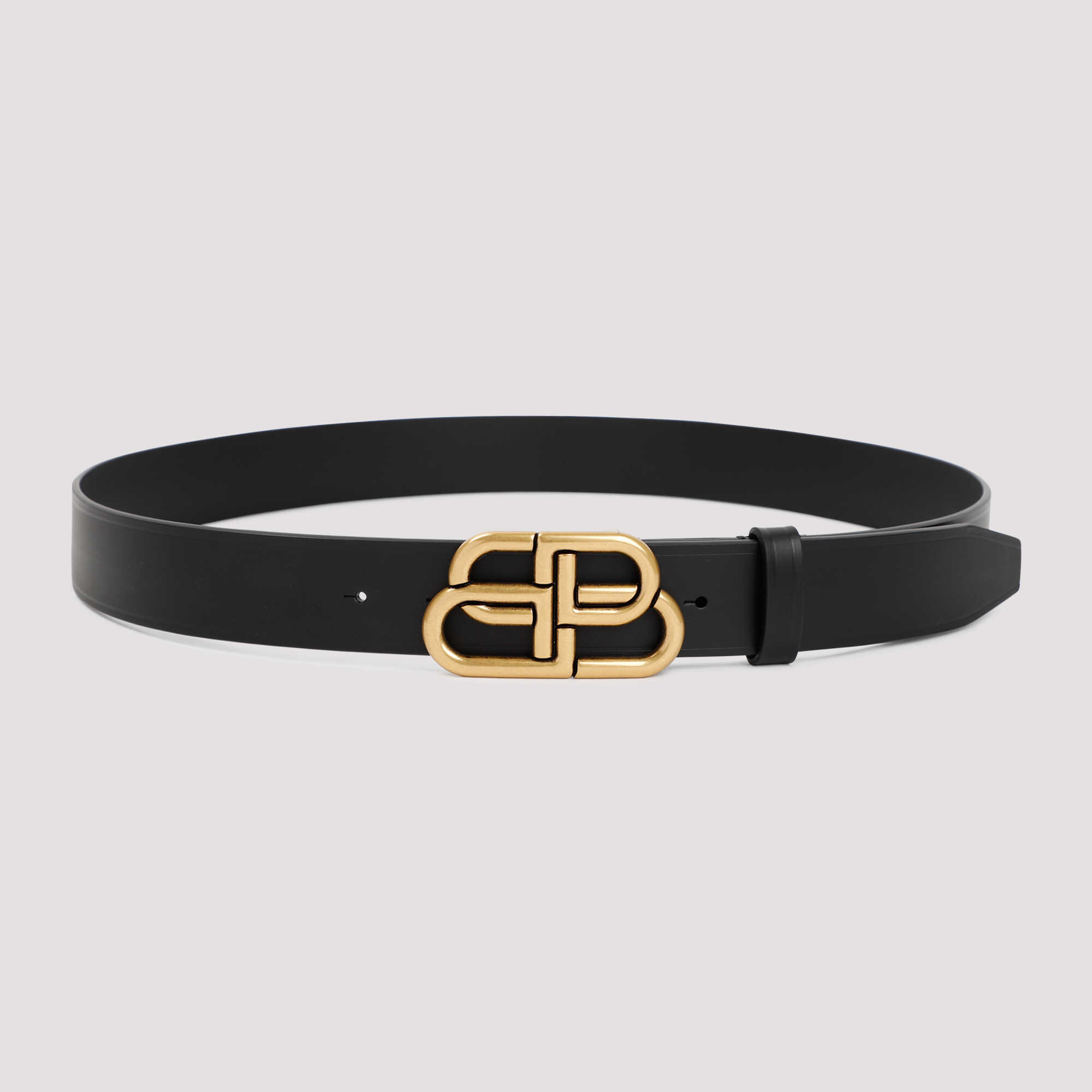 Balenciaga Black Leather BB Belt. Black leather, golden-tone BB buckle logo on front, adjustable fit, single belt loop.