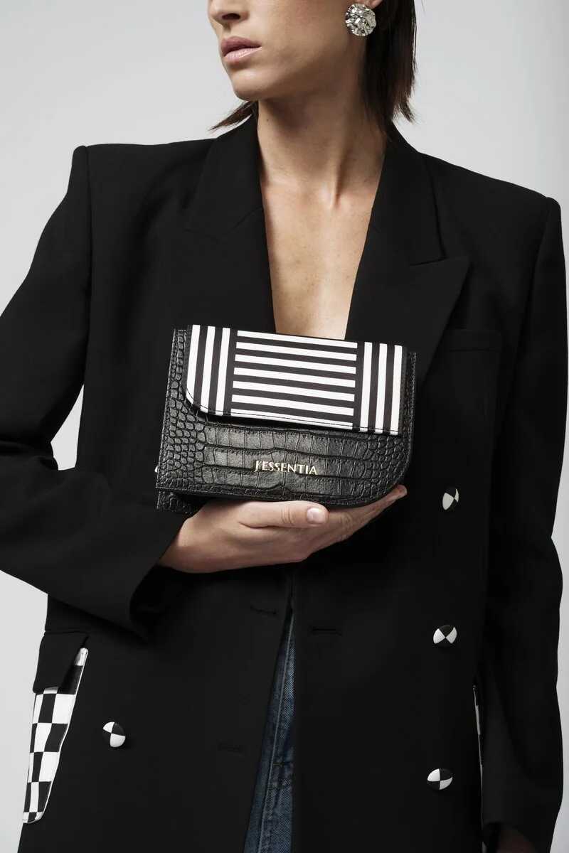 Luxury pochette in pelle nera di coccodrillo stampato e doppio raso, Made in Italy L'eleganza iconica delle righe esalta le linee geometriche di questa pochette. Il pattern stampato sulla pattina armonizza con la sua shape essenziale, rifinita con dettagli in colore oro come la tracolla crossbody. In materiali nobili e pregiati, per portare l'eventwear a un livello superiore.