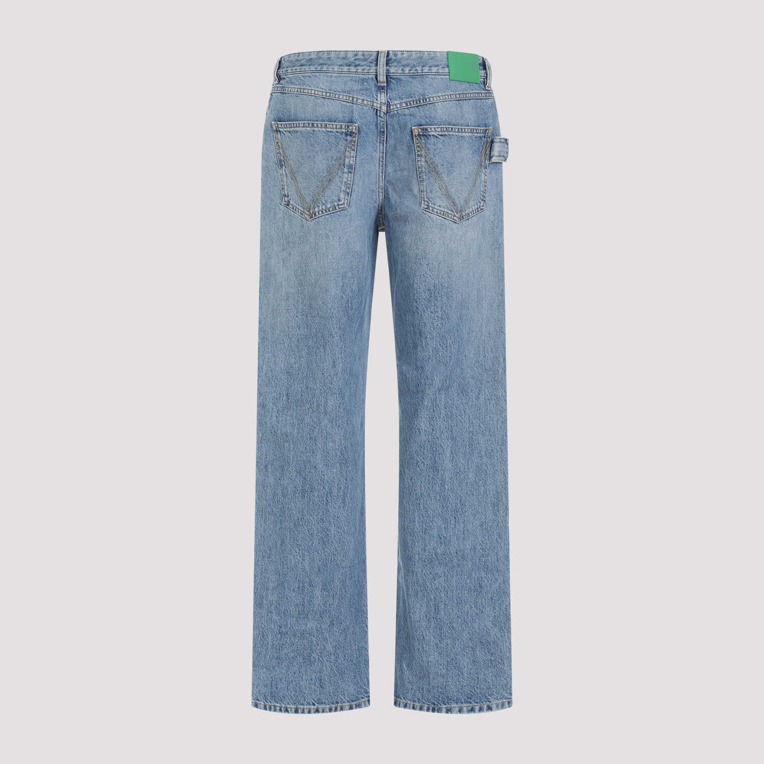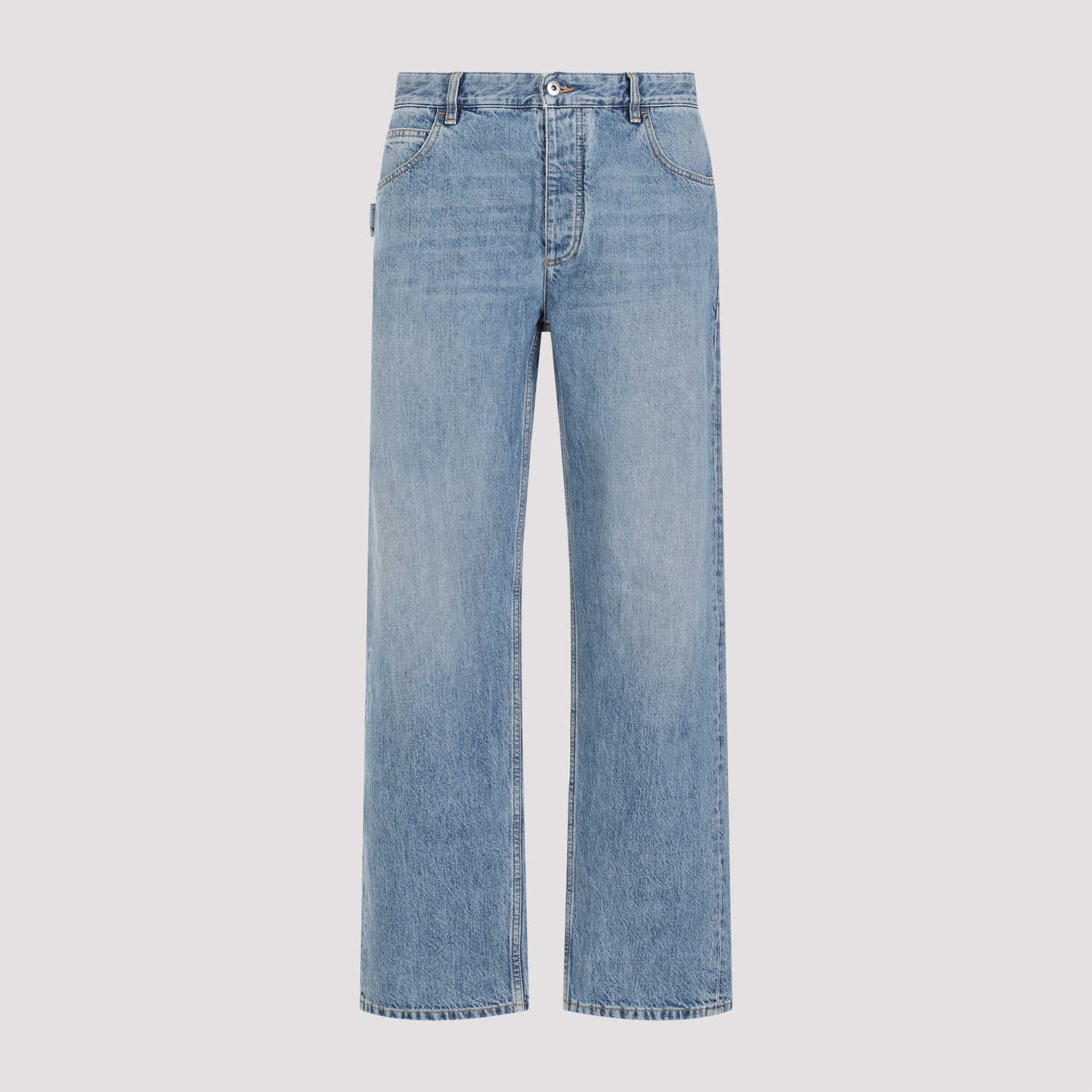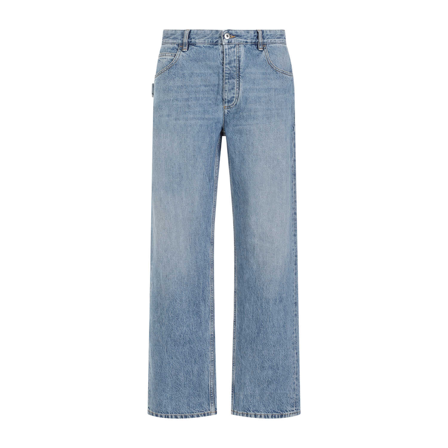 Bottega Veneta Mid Blue Cotton Jeans. Washed mid blue cotton denim, five pockets design, loop detail on the back pocket, belt loops, front button and fly-zip fastening, green leather label with logo on the back, straight leg.