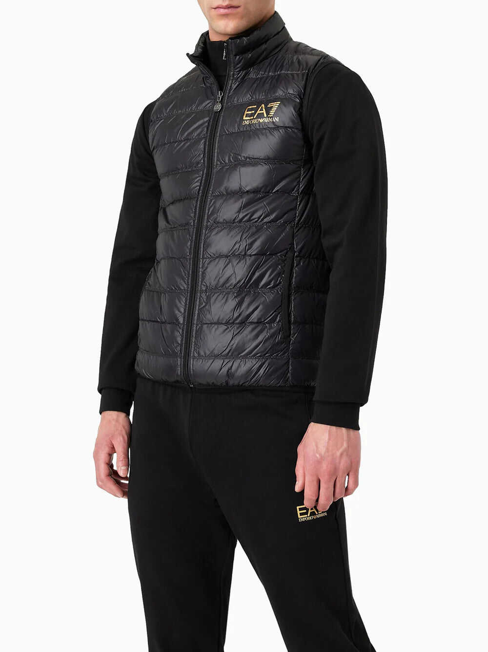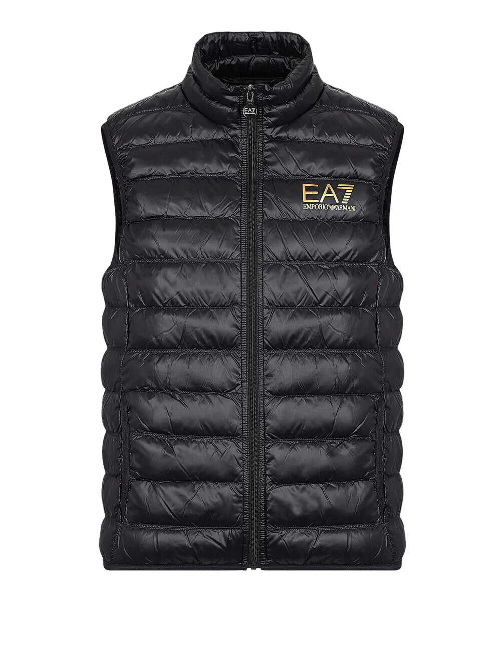 Stay stylish and warm with this black Down Waistcoat by EA7 Emporio Armani. Featuring a regular fit, 90/10 goose down padding, and a packable design with a dust bag. The front zip closure and two side zip pockets add functionality. Complete with a contrasting EA7 logo on the chest. Made of high-quality polyamide material. Perfect for men who want to elevate their topwear collection.