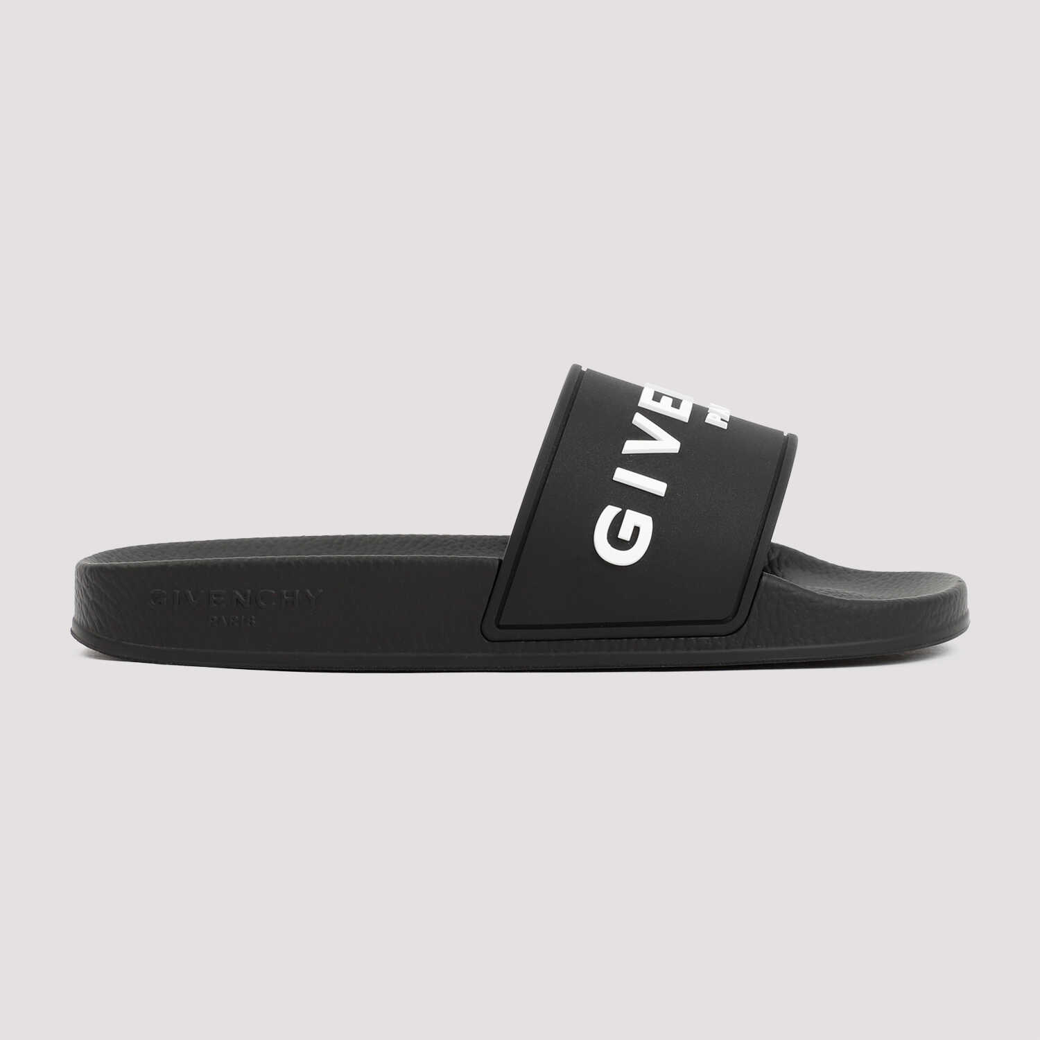Givenchy Black Logo Flat Slide Sandals. Black rubber upper, logo lettering on front in white, open round toeline, rubber sole.